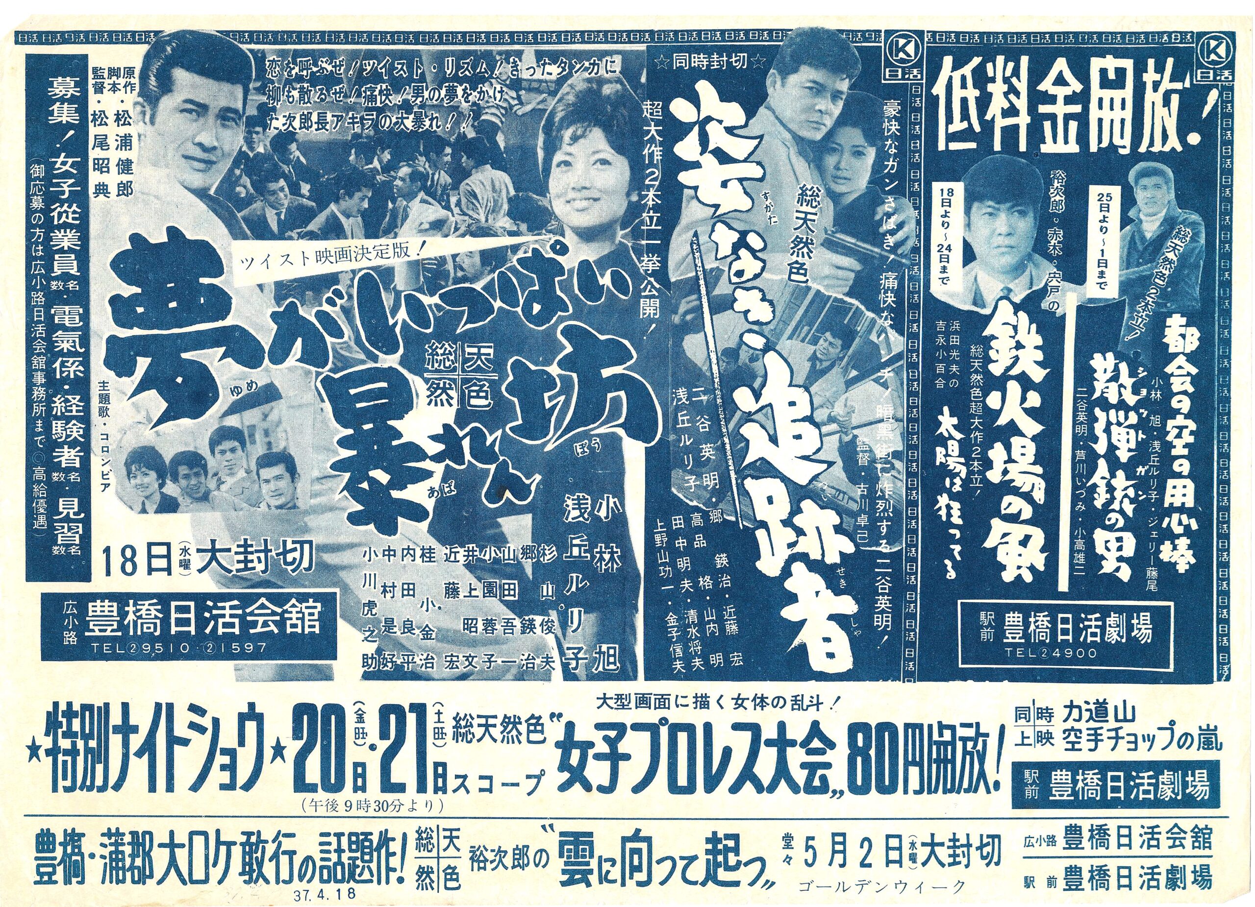 ユメガイッパイアバレンボウ/原作・脚本:松浦健郎。音楽:池田正義。監督:松尾昭典。主題歌:小林旭「アキラでツイスト」「ペパーミント・ツイスト」。挿入歌:牧村旬子「ロンリー・ラブ・ウイズ・ユー」。小林旭・浅丘ルリ子主演の銀座の次郎長「暴れん坊」シリーズ第3作。銀座の次郎長ことキッチン「ジロー」の主人清水次郎(小林旭)がツイストのリズムに乗って大暴れするコミカルアクション。当時大流行のツィストをふんだんに詰め込んだ娯楽アクションでタイトルバックから旭節全開。ロケは大磯駅・大磯海岸・熱海。銀座に進出した高級レストランをめぐる運営する悪組織を叩く銀座の次郎長。敵対組織のボスに内田良平、近藤宏。ライバルのヤクザの息子忠治に郷瑛治。小林旭の父親に中村是好、すし屋の親父に桂小金治。1962年2月に新築開館した広小路日活会館での上映で従来の駅前日活と併せて豊橋市内に日活上映館が2館存在したが、駅前日活はやがて1963年1月30日に閉館。1962年4月18日~5月1日広小路日活会館、併映「姿なき追跡者」。1962年8月31日~9月4日豊橋駅前日活、併映「銀座の恋の物語」。1962年9月30日~10月2日二川銀映、併映「日本一仲良し音頭」。【サイズ:B2&チラシ】【年代:1962年】