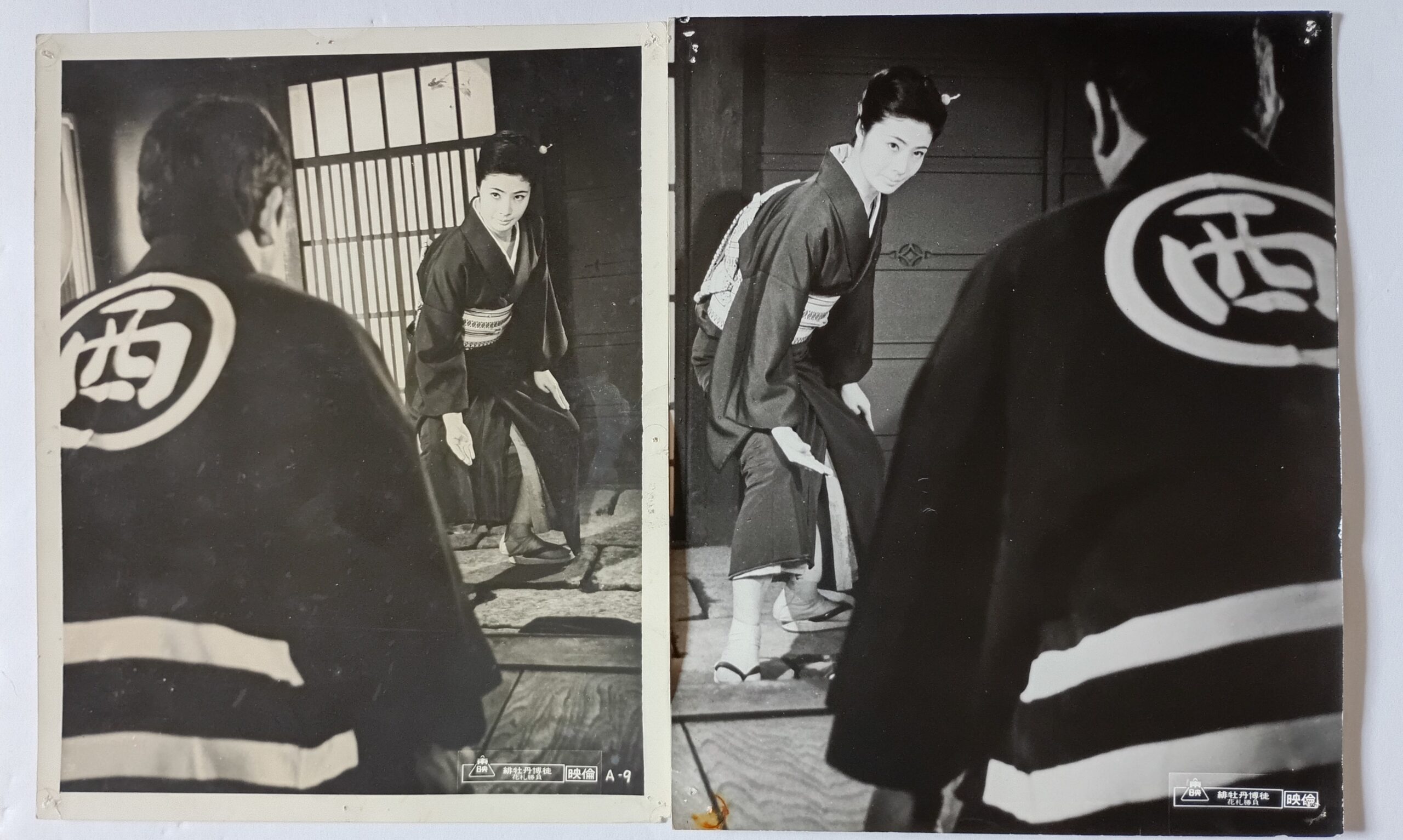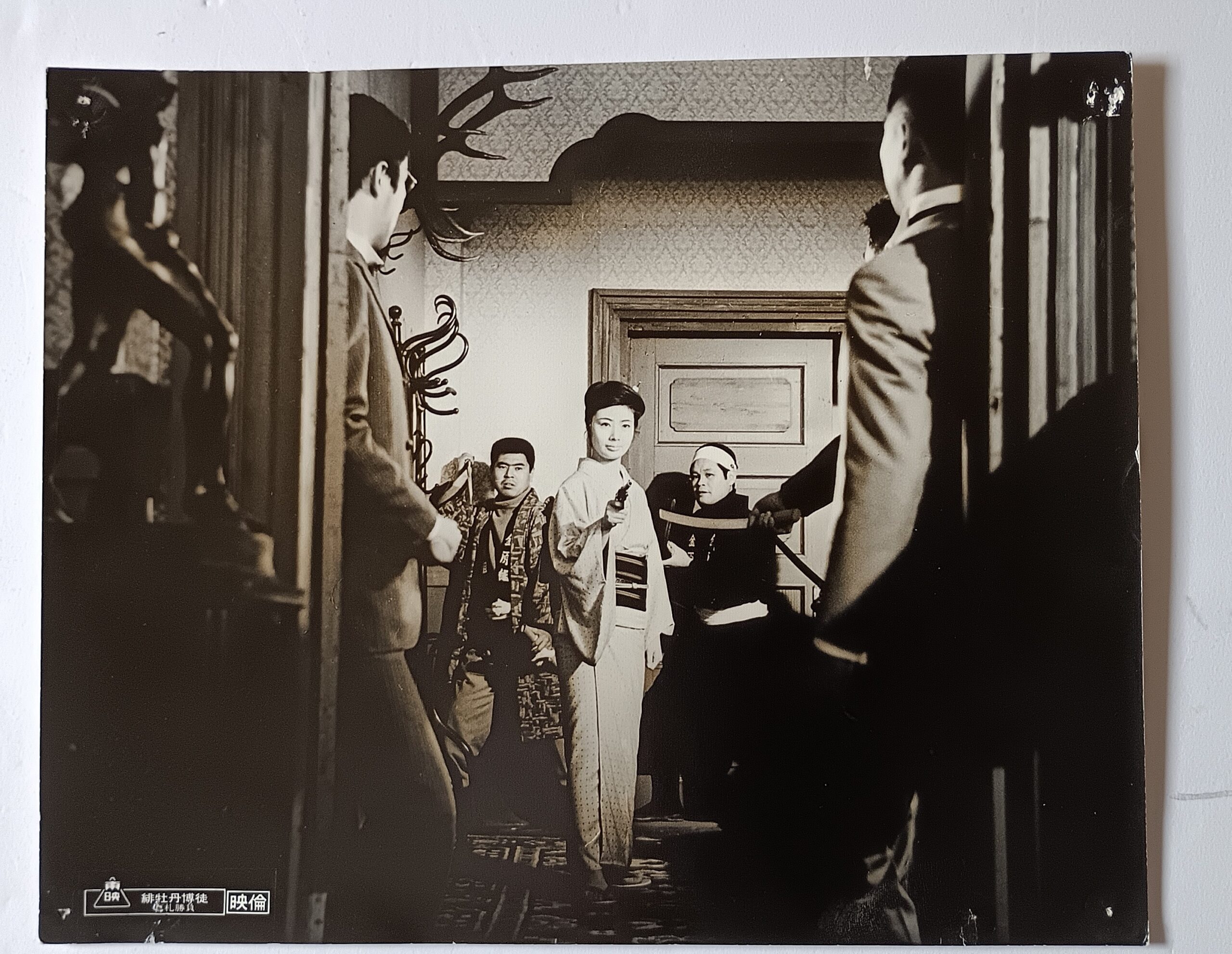 ヒボタンバクト ハナフダショウブ/脚本:鈴木則文・鳥居元宏。監督:加藤泰。殺陣:谷俊夫。シリーズ第3作は名古屋が舞台で「ロミオとジュリエット」の任侠版ともいえ敵対するヤクザの息子と娘が恋仲、一方で盲目の娘を連れたニセお竜沢淑子と胴師汐路章との因縁など男女の結びつきが健さんのお竜への母的慕情との対比として浮かぶ。ゲストが健さん、アラカンこと嵐寛寿郎が西の丸元締め親分としてとても良い貫禄で見せる。そして兄弟分熊虎若山富三郎がお竜の危うい場面で登場する格好良さ。助ける大阪お神楽のおたか親分清川虹子、それでも健さんの渡世人と純子の傘の場面が美しい、観客にぬくもりを与える名場面で背景にSLの蒸気が被る。悪役は小池朝雄。明治の中頃。お竜は熊虎親分からの添書を持って、名古屋の西之丸一家へ草鞋を脱ぐ。西之丸一家は熱田神宮大祭の勧進賭博をひかえ多忙中。金原一家の組長金原鉄之介(小池朝雄)は、国会議員の古田と結託し、勧進賭博を仕切る名古屋一の貸元の座を狙っていた。お竜は金原一家の賭場で自分の名を名乗る女賭博師お時(沢淑子)を捕える。お時は、盲目の子お君の目を直したい一心にイカサマをやり、金原にその腕を利用されていた。西之丸一家の親分杉山(嵐寛寿郎)の息子次郎(石山律)は、金原の義理の娘八重子と恋仲だった。次郎が、八重子との結婚を申し出ると、金原はサイコロで事を決めようと持ちかけ、お時を相手に当らせる。お時は勝負に勝ったものの、人質にされた次郎を、恩を受けたお竜が、探していることを知り、次郎と八重子を逃す。お時は斬られ、次郎と八重子はお竜に守られて大阪へ逃げた。金原一家に草鞋を脱いでいる一匹狼の渡世人花岡は、二人を追うがお竜から事情を聞いて見逃す。やがて金原一家を尋ねたお竜が監禁された。杉山は勧進元とお竜の命の決着を勝負で決めようと提案。杉山の代人お竜は金原の代人バケ安(汐路章)との一本勝負に勝ったが難癖をつけられたが熊虎にその場を救われた。彰吾が金原に杉山を斬り捨てるよう命ぜられたのは、そんな折だった。彰吾は、一宿一飯の義理から杉山を斬った。重傷を負った杉山は、勧進賭博の挨拶を終えると息をひきとる。やがて、熱田神宮へ奉納金を修めに行った西之丸一家の代貸久保寺(有川正治)ほか数人が、金原一家に殺され、金も奪われたことでお竜は殴り込む。この時のお君がお竜第5作「お竜参上」で再び登場することになる。1969年1月31日〜2月10日豊橋東映、併映「現代やくざ与太者の掟」。1969年6月4日〜10日松竹シネマ、併映「女賭博師みだれ壺」【サイズ:B2】【年代:1969】