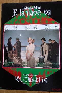 ソシテフネハユク/原案・脚本・監督:フェデリコ・フェリーニ。音楽:ジャンフランコ・プレニツィオ。「8 1/2」「甘い生活」のフェデリコ・フェリーニ監督による幻想的な群像劇。第一次大戦前夜、1914年ナポリ湾から出港した豪華客船に乗り合わせた芸術家、貴族、そして救済された亡命難民などの運命が、独特のオペラ・タッチで描かれる。フェリーニ美学の集大成とも言える、人口の海や書割り風の豪華客船内の装飾美術がすばらしい出来具合。 世紀の大ソプラノ歌手の遺骨を海に葬送するために出航した船に乗り合わせた人々の姿を描く。1985年11月6日公開だが、豊橋では未公開。【サイズ:B2ポスター】【年代:1985年】