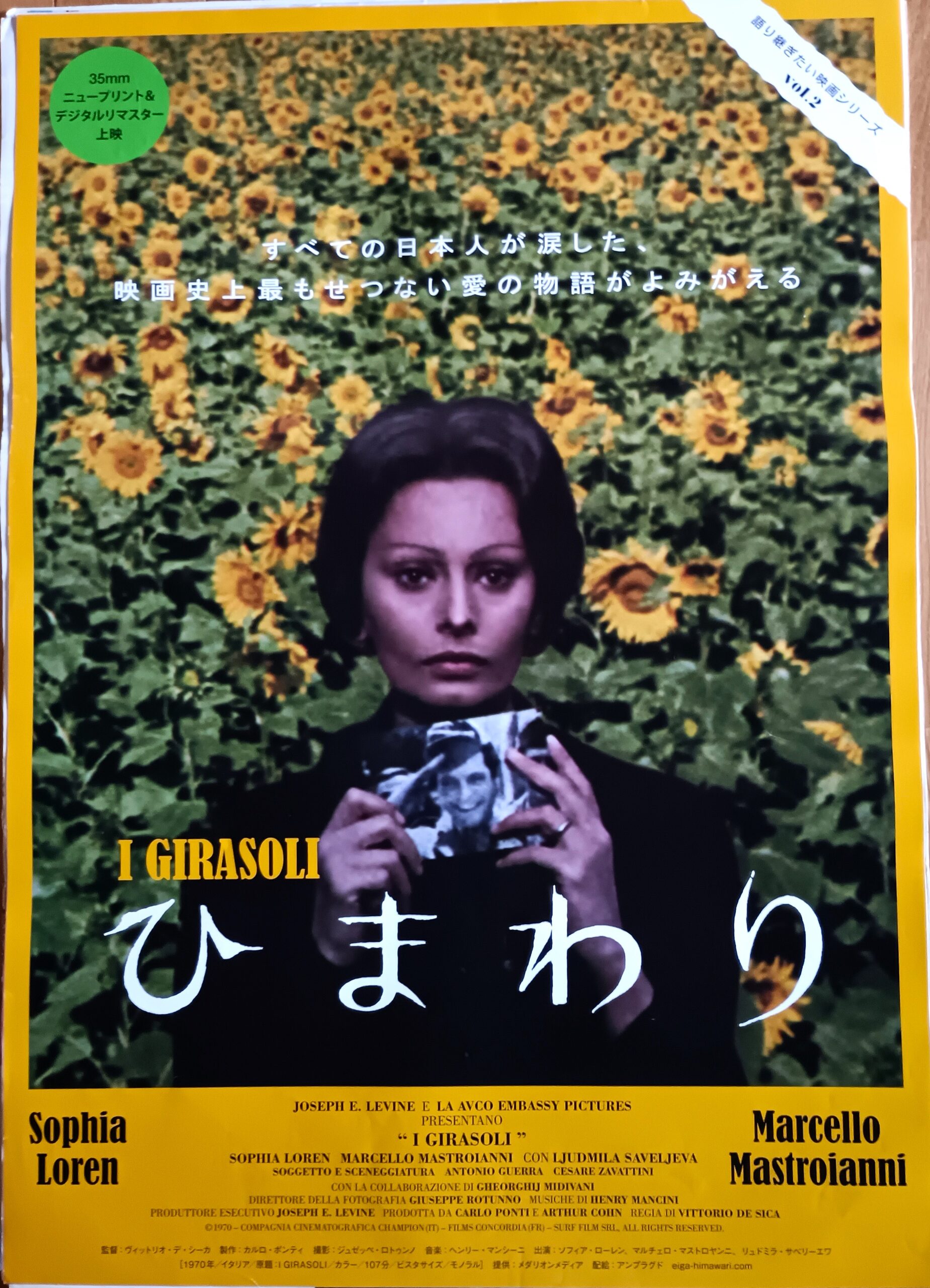 ヒマワリ/監督:ビットリオ・デ・シーカ。音楽:ヘンリー・マンシー二。第二次世界大戦でイタリアから新婚のイタリア人電気技師(マルチェロ・マストロヤン二)がソ連戦線に送られて妻(ソフイア・ローレン)と別の人生を歩むが妻は夫の帰りを待ちわびる悲しい現実のドラマ。イタリア映画界が初めてロシアにロケを許されてあのウクライナでロケされて多くの人々が眠る土地に咲き誇るひまわり。2022年にロシアがウクライナに侵攻して戦火にみまわれて、最新のデジタル技術で修復されたHDレストア版が緊急リバイバル公開された事は記憶に新しい。第43回アカデミー賞作曲賞にヘンリー・マンシーニがノミネートされる。ソフィア・ローレン&マルチェロ・マストロヤンニとデ・シーカ監督のトリオは1960年代に「昨日・今日・明日」「ああ結婚」に続いて3本目となる。1970年12月26日~1971年1月14日豊橋名画座、併映「ジェネレーション」。1975年2月1日~14日広小路スカラ座、併映「卒業」。2003年第2回・2012年第11回・2023年第21回とよはしまちなかスロータウン映画祭でも3回上映した名作。【サイズ:B2ポスター2種類&パンフレット】【年代:1970年】