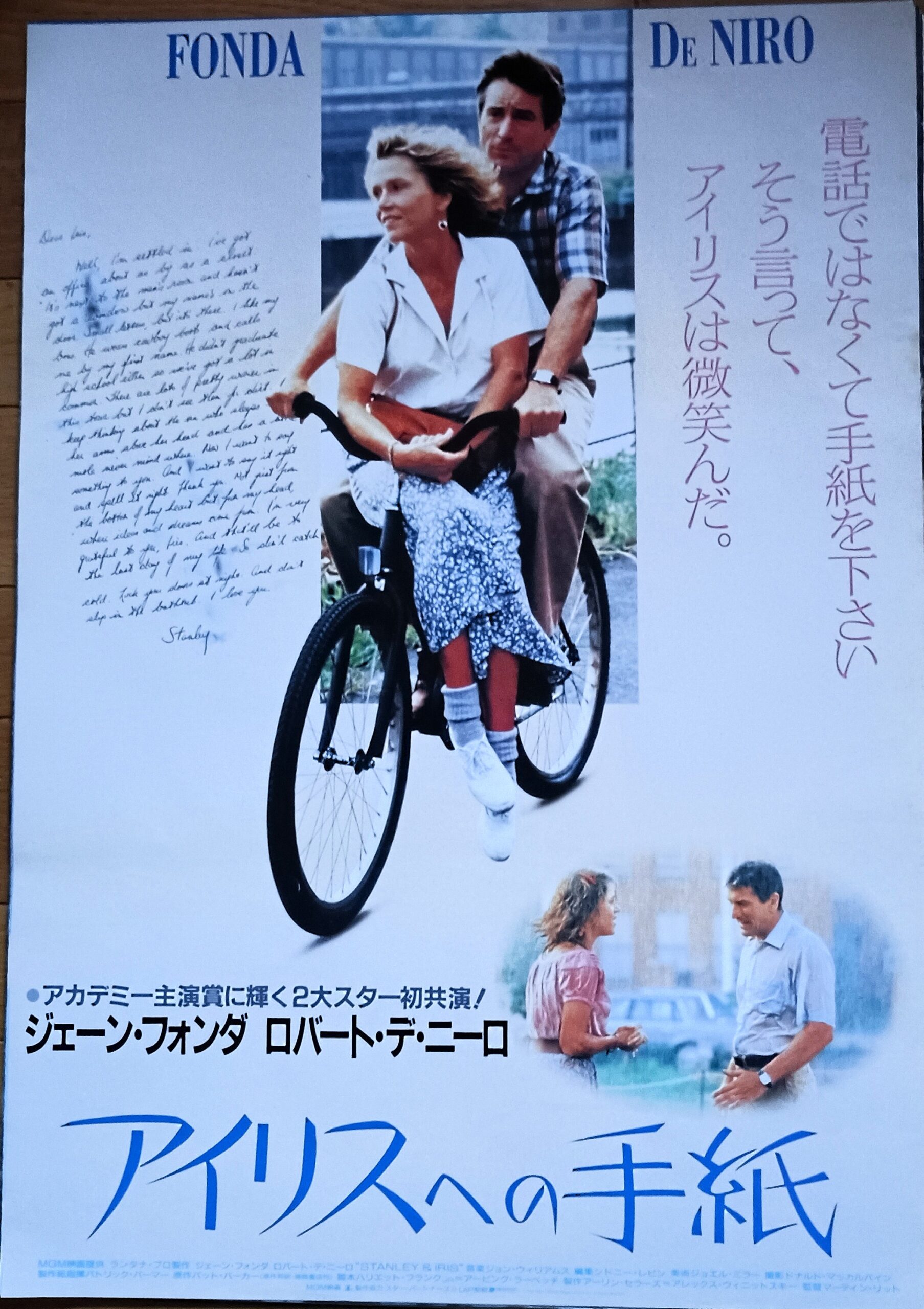 アイリスヘノテガミ/原作:パット・パーカー。音楽:ジョン・ウイリアムズ。監督:マーティン・ハント。ジェーン・フォンダとロバート・デニーロのアカデミー賞コンビが組んだラブストーリー。パン工場に勤める女性と非識字者の男性の、心の交流と愛を描くドラマ。洋菓子工場で働きながら二人の子供を育てている未亡人:アイリスと、工場の食堂でコックをしている独身男性:スタンリーの出逢いと恋の行方を描いた“大人の恋愛ストーリー”で、アイリスが読み書きできないスタンリーに頼まれて彼の家庭教師になったことをきっかけに心の距離を接近させてゆく二人のロマンスを詩情豊かに綴る。この映画は、最愛の夫を喪った悲しみから立ち直れていないアイリスと読み書きできないことに強いコンプレックスを抱いているスタンリーの惹かれ合いを自然体の心情描写の中に描いた恋愛ドラマとなっていて静かな展開で最後に少しだけ夢を見させてくれる。1990年6月22日公開、豊橋での公開は不明。【サイズ:B2ポスター】【年代:1990年】