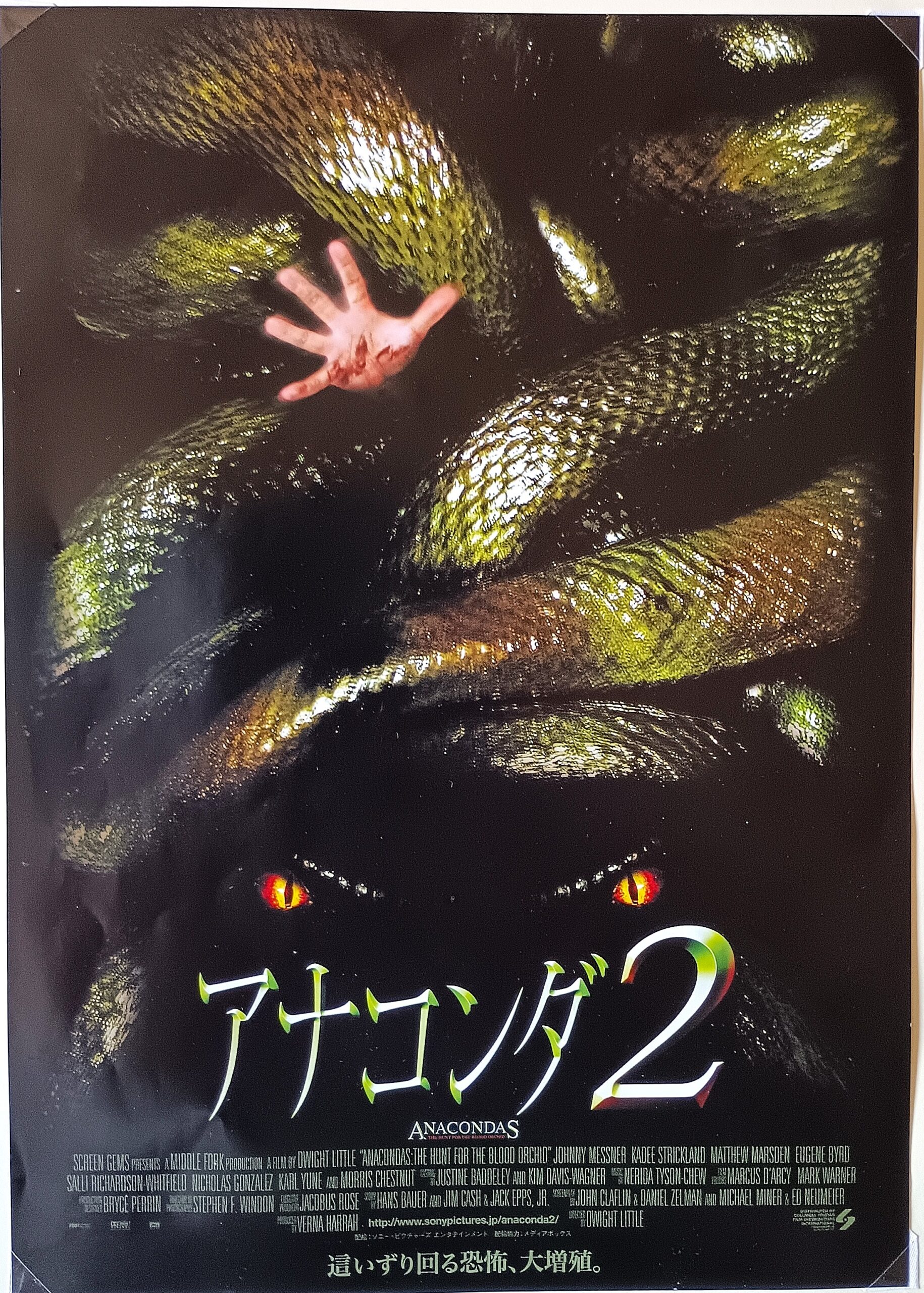 アナコンダ2/音楽:ネリダ・タイソン・チュウ。監督:ドワイト・リトル。巨大な殺人蛇の恐怖を描いて大ヒットした前作『アナコンダ』の続編。舞台がアマゾンからボルネオに変り、老不死の血清の素となる神秘の蘭、ブラック・オーキッドをめぐり、科学者チームがインドネシア・ボルネオの密林地帯へブラック・オーキッドを求め旅立ちアナコンダの群れと遭遇する物語。ボルネオの奥地に、7年に一度、2週間だけ咲くという希少な花ブラッド・オーキッド。その血清成分は細胞の老化防止に劇的な効能があることが実証され。コスメや医薬品として商品化すれば、まさにバイアグラ以上に世界を席巻することは確実。あと1週間で花は咲き終わり、次に咲くのは7年後…。彼らは会社の利益と自らのキャリアアップを図るため、現地ボルネオに“ブラッド・オーキッド”採取に向かう。ボルネオに着いたリーダー格のバイロン医師(マシュー・マースデン)、女性科学者の2人、サム(カディ・ストリックランド)、ゲイル(サリー・リチャードソン=ホイットフィールド)、そして“コンピューターおたく”のバリス(ユージン・バード)、さらにダグラス医師 (ニコラス・ゴンザレス)。船を出してくれそうなのは、現地で船上暮らしをし、酒とバクチの借金まみれで、いわくありげな過去を持つ素性の良くないジョンソン(ジョニー・メスナー)だけだった。5万ドルの報酬をふっかけられ、その船ブラディメリー号はかなりのポンコツ。一行の船は上流へと向かってゆく。ゲイルが携帯で電話中に誤って川に落ちてしまう。助けに飛び込むジョンソン。そこに水の中から巨大なワニに襲われジョンソンはナイフ片手にワニを倒す。流木が増え、スクリューが空回りし、船の自由が効かなくなる。前方には滝が迫り、船は落下、一行は川に投げ出され岸にたどり着く。船は大破、残されたものは地図と採取サンプル、少量の水と衛星電話だけ。一行は、密林を直進してなおも花の採取に向かう、最後列を進んでいたダグラスがアナコンダに襲われる。リビングストンの船はアナコンダに襲われ、爆発炎上。その現場にたどり着いた一行は、無残な船とリビングストンの姿に慄然とする。不気味な村で、アナコンダの死骸とその花の一部を発見する。大量に花が咲き誇る場所は近いはずだが、そこはアナコンダたちが交尾のために集まる場所を意味していた。やがてゴードンが毒グモにより謀殺され、バイロンはリビングストンの船を破片で作ったイカダを漕いで独断専行の行動を取る。目指すは洞窟の中に群生する“ブラッド・オーキッド”。それは凶暴化したアナコンダの大群が守護する“危険な宝の花”でもあった。2005年3月5日公開、ユナイテッドシネマ豊橋18。【サイズ:B5チラシ】【年代:2005年】