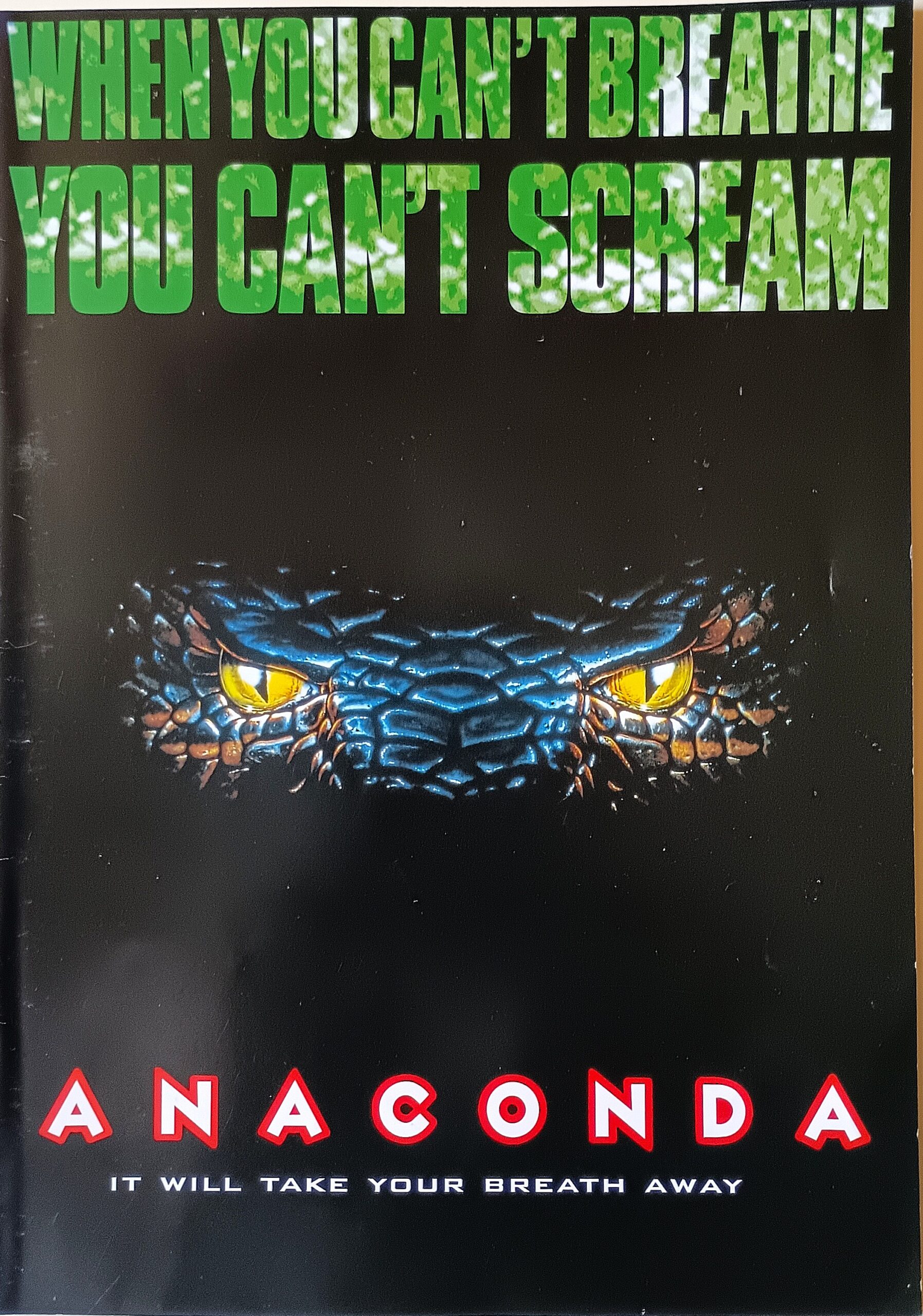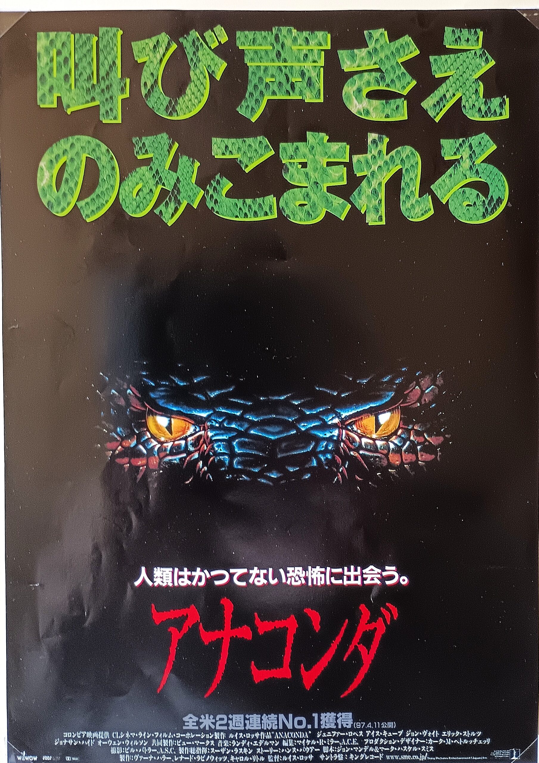 アナコンダ/音楽:ランディ・エデルマン。監督:ルイス・ロッサ。ジェニファー・ロペス&ジョン・ヴォイト共演のアニマルパニック。南米アマゾンの奥地に潜む巨大な人食い蛇の恐怖を描く。「アビス」「フリー・ウィリー」など“水もの”を多く手掛けてきたウォルト・コンティのアニマトロニック効果と、「スピード」「コンタクト」のソニー・ピクチャーズ・イメージワークスによるCGIが融合した見事なSFXが見どころ。伝説のインディオ、シリシャマ族を求めてアマゾンに来た若き文化人類学者ケイル(エリック・ストルツ)と、その恋人で女性記録映画作家のテリー(ジェニファー・ロペス)率いる撮影隊は、カメラマンのダニー(アイス・キューブ)、録音技師ゲアリー(オーウェン・ウィルソン)、彼の恋人でプロダクション・マネジャーのデニス(カリ・ウーラー)、リポーターのウエストリッジ(ジョナサン・ハイド)、そして現地人ガイドのマテオ(ヴィンセント・カステラノス)の7人編成。途中、一行は蛇の密猟をしている謎の男サローン(ジョン・ヴォイド)を助ける。シリシャマ族の見たという彼は、案内すると言う。数日後、ケイルが猛毒の蜂に襲われ重体。病院に連れていくため、船はサローンが近道だと言った支流に入るが、行く手には人工の柵が阻んでいた。サローンはダイナマイトで柵を爆破するが、衝撃で燃料タンクの大半が川に没し、夥しい数の蛇が降り注いだ。ジャングルの知識に長けた彼は、次第にほかのクルーを制圧下に置く。彼の目的は全長14mにも達する幻のアナコンダの捕獲にあった。マテオがアナコンダの最初の犠牲者となる。サローンの仕掛けた罠にかかったアナコンダがついに姿を現す。怪物はゲアリーを餌食にすると悠々水中に姿を消した。身の危険を感じたテリーらは、サローンの隙を突いて縛りあげる。滝近くに差しかかったところで船が座礁。そこへアナコンダが再び出現し、ウェストリッジがアナコンダの犠牲となった。デニスを殺して自由になったサローンはダニーも襲うが、意識を取り戻したケイルが発射した痲酔銃で水中に没した。帰路に製材所を発見したテリーたちは燃料を求めて上陸するが、サローンが待ち伏せ。テリーとダニーを縛り上げた彼は、2人を餌にアナコンダをおびき寄せる。だが、怪物のパワーは想像以上で、サローンも食われてしまった。テリーとダニーは必死に逃げ、ついにアナコンダを煙突ごと爆破して倒す。ヒットしてシリーズ化されて4本製作される。89分。1997年9月13日公開、豊橋ピカデリー。【サイズ:B5チラシ&パンフレット表紙・中面】【年代:1997年】