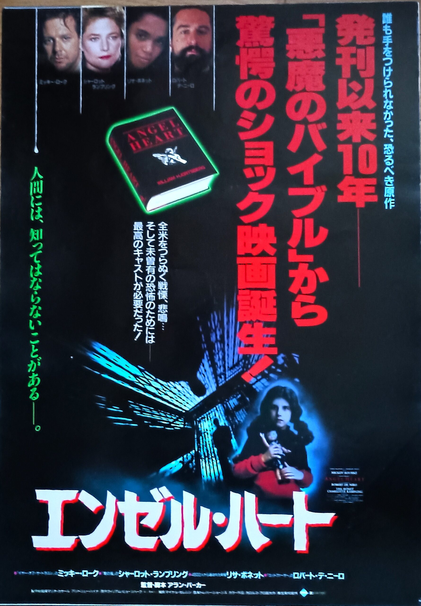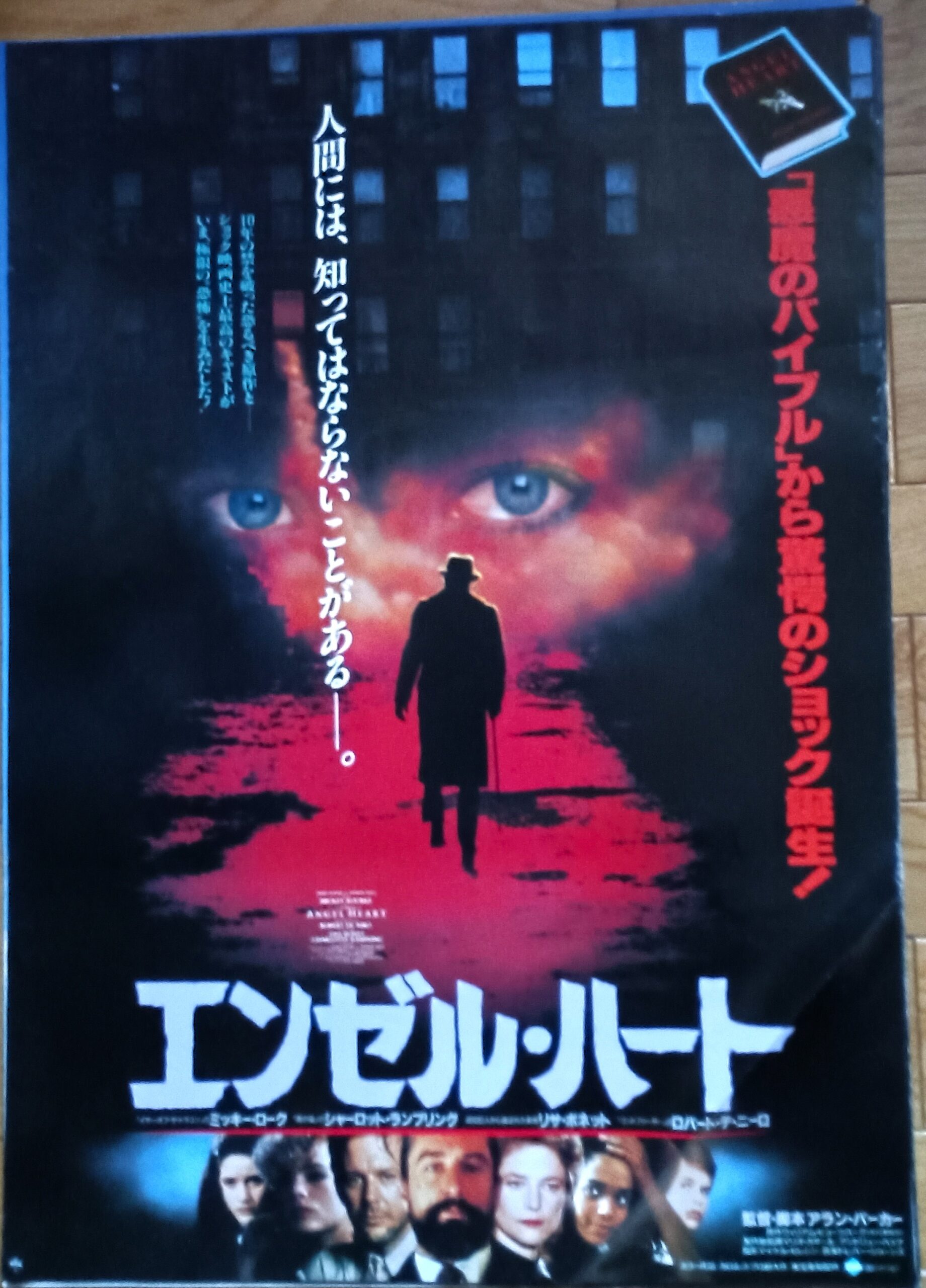 エンゼル・ハート/原作:ウィリアム・ヒョーツバーグ「堕ちる天使」。音楽:トレヴァー・ジョーンズ。脚本・監督:アラン・パーカー。ミッキーローク&ロバート・デニーロ共演のオカルト・ミステリー。1950年代のブルックリン。私立探偵ハリー(ミッキー・ローク)の元に、サイファ(ロバート・デニーロ)という男から高額の依頼が舞い込む。それは、大戦後に失踪した人気歌手ジョニーを探してくれという内容のものだった。彼は早速調査を開始するのだが、行く先々で不可解な殺人事件が発生。ヴードゥ教の巫女であるエピファニーと情を通じ、絶頂時に彼女の首をしめかけるハリー。マーガレットの父イーサン(ストッカー・フォントリュー)も殺される。ハリーはジョニーがニューヨークのタイムズ・スクエアである人と会ったことをつきとめた。ニューオリンズでルイ・サイファーに会い、彼が実はルシファー、つまり悪魔であることが判明。ジョニーは悪魔と契約してハリーになったのだ。エピファニーの死体を前に、ジョニーは「俺の娘だ」という。これまでの殺人はすべてハリーだった。生贄になった若い兵士の名前がハリーこと「ハロルド・エンゼル」という展開。キャッチコピー「人間には知ってならないことがある」。1987年6月13日公開、広小路スカラ座。【サイズ:B2ポスター】【年代:1987年】