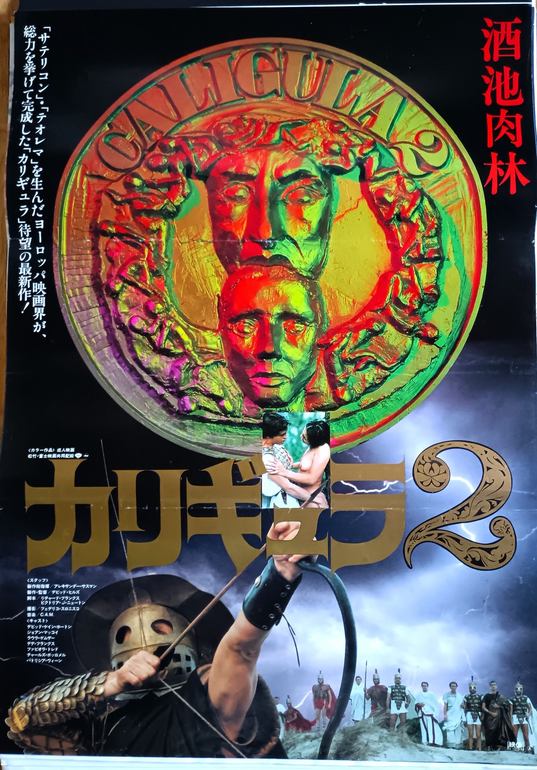 カリギュラ2/監督:デヴィッド・ヒルズ。音楽:カルロ・マリア・コルディア。残虐な暴君として知られるローマ帝国3代目・皇帝カリギュラの非道な行為を描いた、エロティック・イタリア歴史ドラマ「カリギュラ」の続編だが物語は関係ない。権力を極限まで振るい、レイプや処女狩り、乱交、獣姦など、連夜のように性の宴を繰り返していたカリギュラ。人間性を失った彼は、次第に狂気の底へと落ちていく歴史よりイタリア得意のグロテスクな作品。1982年10月9日公開だが豊橋での実績は不明。【サイズ:B2ポスター】【年代:1982年】