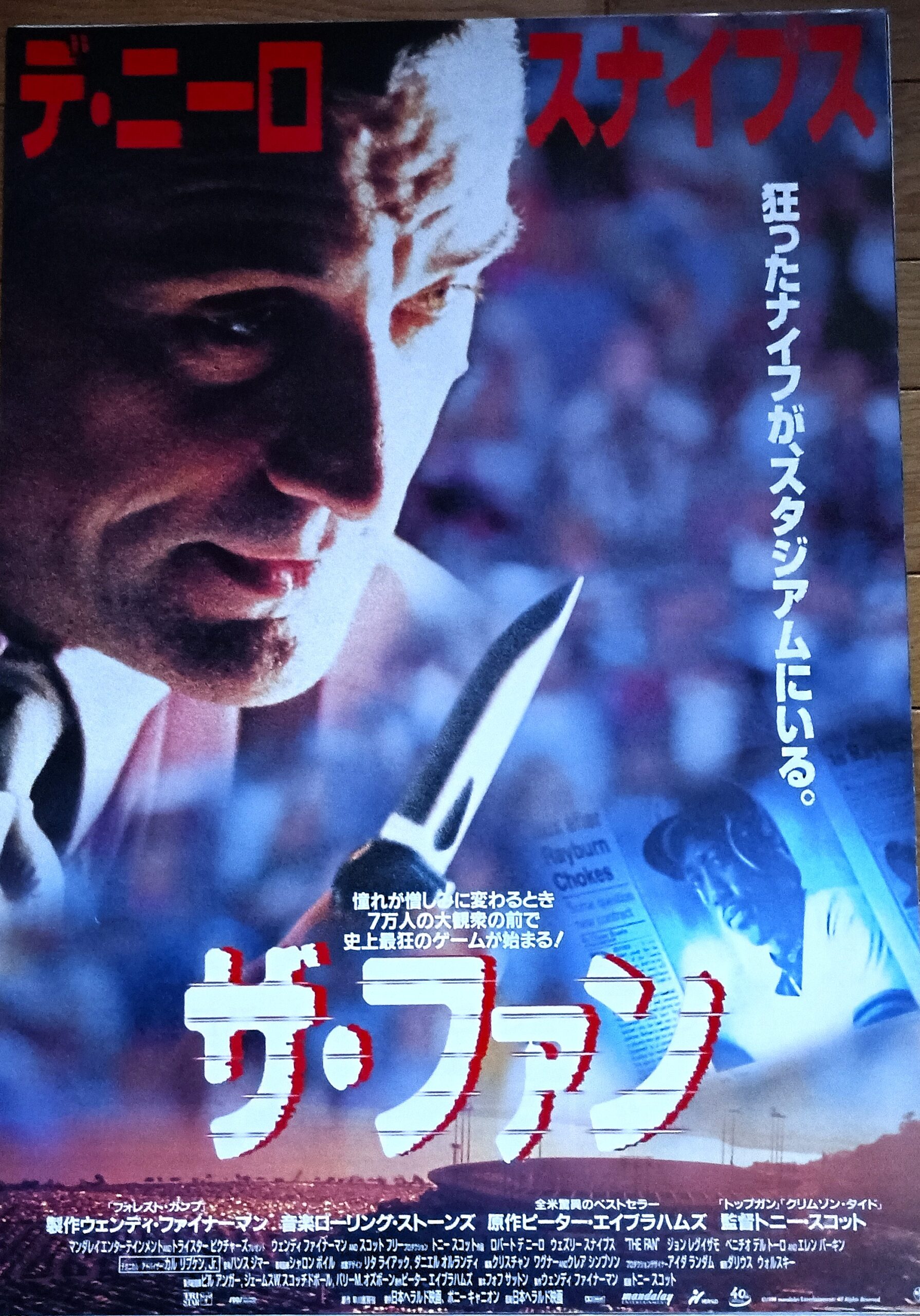 ザ・フアン/原作:ピーター・エイブラハムズ。脚本:フオフ・サットン。音楽:ハンス・サマー。監督:トニー・スコット。ストーカー犯罪の現状をあからさまに描き、全米を震撼させた本格ストーカーサスペンス「ザ・ファン」。生活全てに行き詰った男(ロバート・デ・二―ロ)が、大リーガーのスター選手にのめりこみ、私生活まで執拗に追い始める。そしてある言葉がきっかけとなり、その選手を‘憎悪のターゲット’として追い詰めて行く。デ・ニーロが‘恐怖’と化し、秘められた凶器を武器に襲いかかる。共演は「ホワイトハウスの陰謀」のウェズリー・スナイプス。監督はハリウッドのヒットメーカー、「クリムゾン・タイド」のトニー・スコット。ラストのゲームでのサスペンスが秀逸。1996年10月26日公開広小路スカラ座。【サイズ:プレスシート&B2ポスター】【年代:1996年】
