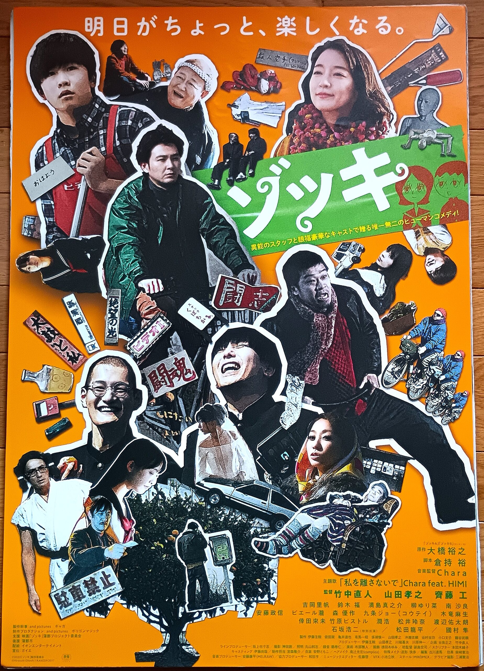 ゾッキ/原作:大橋裕之「ゾッキA」「ゾッキB」。企画:竹中直人。脚本:倉持裕。音楽:Chara。監督:竹中直人・山田孝之・斎藤工。『超能力研究部の3人』『音楽』などの原作で知られる漫画家・大橋裕之の初期短編集を実写映画化。それぞれに秘密を抱えた人々が織り成す人間模様を描く。俳優業以外にも多岐にわたって活動する竹中直人、山田孝之、齊藤工が共同監督、舞台演出家・劇作家の倉持裕が脚本、ミュージシャンのCharaが音楽監督を務めた。『見えない目撃者』などの吉岡里帆、『コドモ警察』などの鈴木福、『君が君で君だ』などの満島真之介をはじめ、石坂浩二、松田龍平、國村隼らが共演。離婚して東京から愛知県蒲郡の実家に戻ってきたりょうこ(吉岡里帆)は、物思いにふける祖父(石坂浩二)から「秘密は大事に」と言われる。その助言を受けりょうこが秘密を聞くと、祖父は驚くべき事実を告白する。一方、ママチャリで南を目指しあてもなく旅に出た藤村(松田龍平)は、途中で事故を起こし指を痛めた際に高校時代の秘密を思い出す。痛みをこらえながら走り続ける彼は、立ち寄った漁港で地元の漁師たちと触れ合い、再び旅を続ける。ロケ地は 原作者大橋裕之さんの故郷である蒲郡市で全面ロケ、店名・駅名などはそのまま実在の名前で劇中に登場するが舞台は架空の街である。ロケは西浦駅・清田町橋詰集会所・西浦龍田浜・西浦漁港・三谷・蒲郡クラシックホテル・蒲郡駅など多数。製作のアンドピクチャーズ代表の伊藤主税氏は豊橋出身。2021年4月2日公開、ユナイテッドシネマ豊橋18。【サイズ:B2ポスター&ロケ地MAP】【年代:2021年】