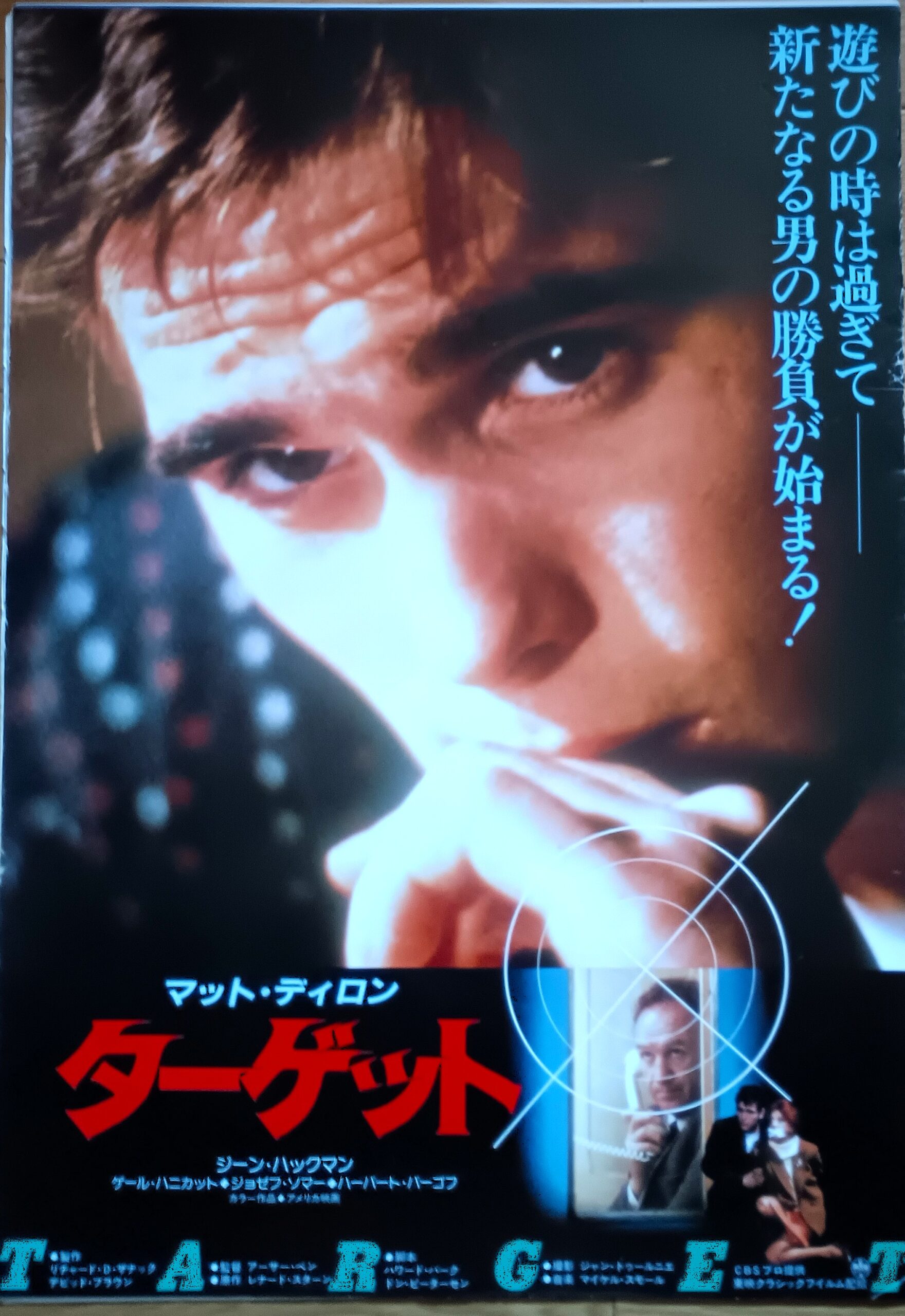 ターゲット/原作:レナード・B・スターン。音楽:マイケル・スモール。監督:アーサー・ペン。ジーン・ハックマン&マット・デイロン共演。欧州旅行中のパリで組織に誘拐された妻の救出に乗り出す父子を描くスパイ・アクション。愛妻ゲイル・ハニカットを探しにパリに到着してからが緊迫感あふれる展開となる。ハックマンが元CIAで当時の東側スパイが事件に絡んでいることが判る。愛妻に幾重にも巻かれた起爆装置を取り除く場面までアクションを交えて見せ場が多い。ハックマンとデイロン共演はいいコンビ。1985年12月7日公開、豊橋東映シネマ。【サイズ:B2ポスター】【年代:1985年】