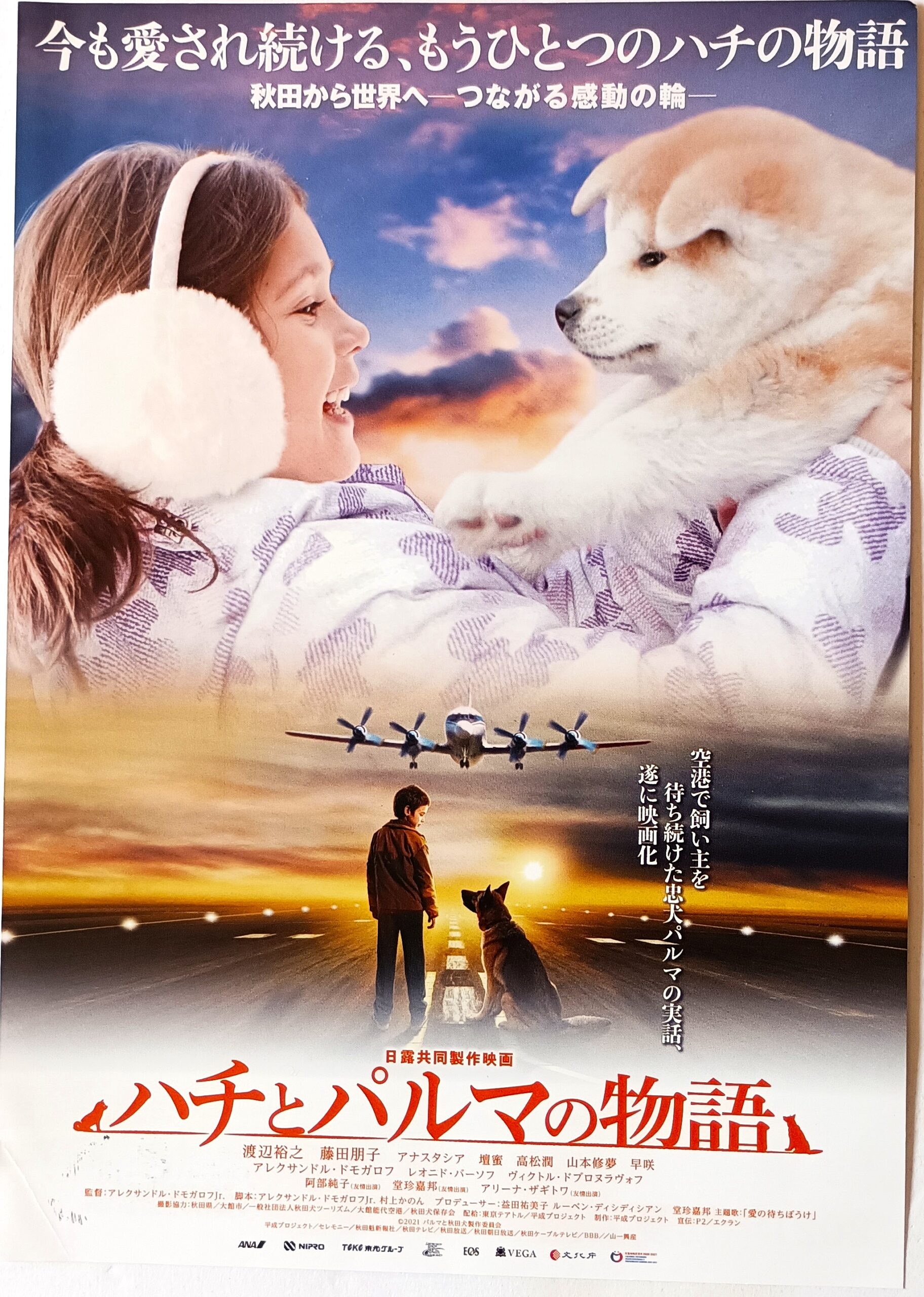 ハチトパルマノモノガタリ/脚本・監督:アレクサンドル・ドモガロフ・ジュニア。主題歌:堂珍嘉邦「愛の待ちぼうけ」。1970年代の旧ソ連に実在した「忠犬パルマ」のエピソードを基に、犬と人間の関わりや親子の葛藤を描いた日露合作によるヒューマンドラマ。空港に取り残された犬と母親を亡くした少年が出会い、友情を育んでいく。飼い主とともにプラハへ行く予定だった犬パルマは、検査の手違いからモスクワの空港に置き去りにされてしまう。空港に住み着いたパルマは毎日滑走路で飛行機を見上げ、2年間も飼い主の帰りを待ち続ける。時を同じくして、母親を亡くした9歳の少年コーリャが、パイロットである父親に預けられ空港にやって来る。コーリャとパルマは孤独なもの同士、すぐに仲良くなる。ある日、日本人に連れられた秋田犬が空港に現れる。その姿を見るパルマの目にこの上ない寂しさが宿っていることに気づいたコーリャは、パルマを飼い主の元へ戻すべく立ち上がる。オーディションで選ばれたレオニド・バーソフが主人公を演じ、アレクサンドル・ドモガロフ・Jrが監督と脚本を手掛け、『ボリショイ・バレエ 2人のスワン』などのアレクサンドル・ドモガロフと親子で共に本作に参加。日本からは渡辺裕之や藤田朋子、壇蜜や高松潤らが出演。動物ものにとどまらず少年の成長物語であり、半端な父が父性を獲得する物語であり、感動の実話となっている。秋田県大館市でロケ。2021年5月28日公開、ユナイテッドシネマ豊橋18。【サイズ:B5チラシ】【年代:2021年】