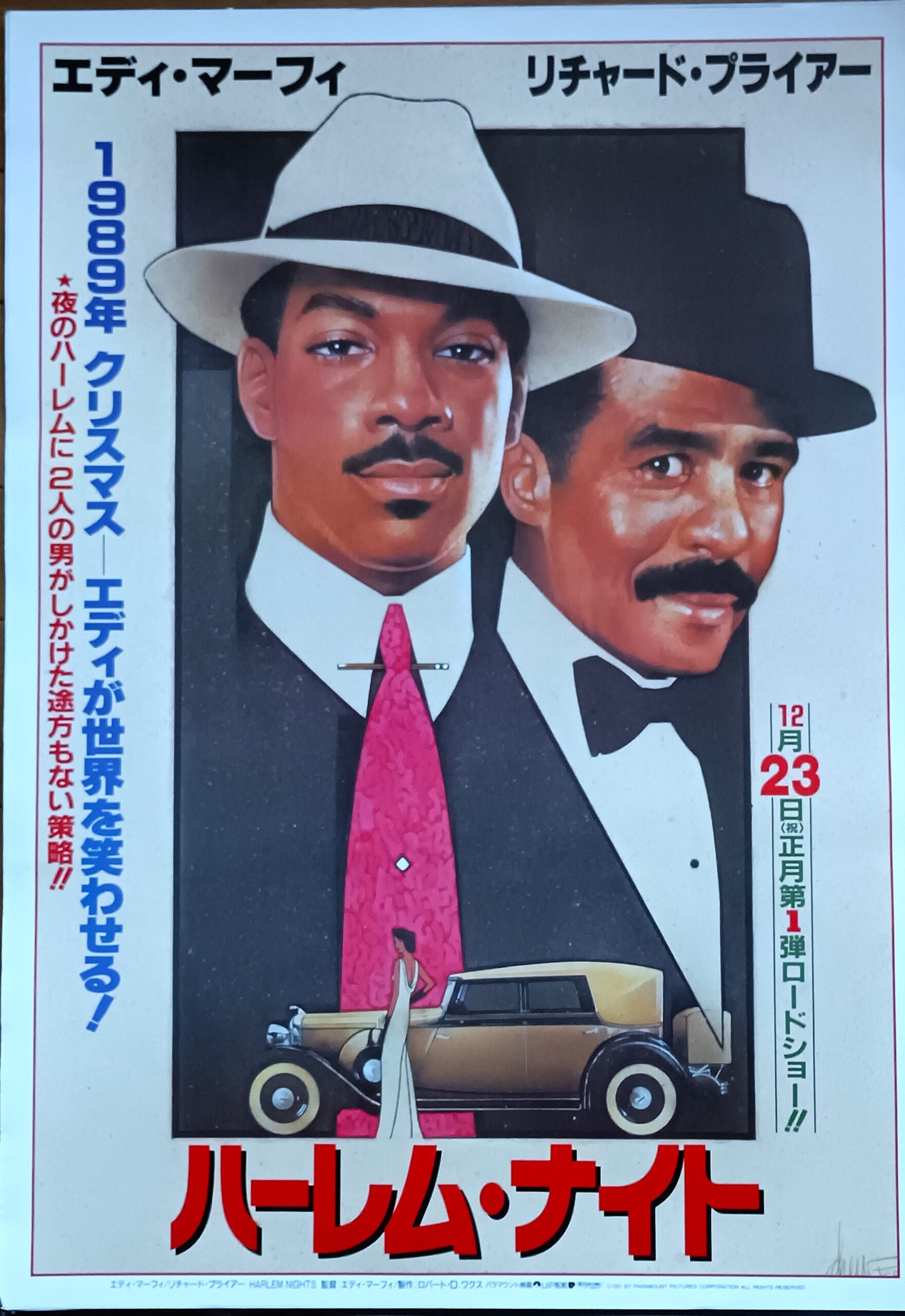 ハーレム・ナイト/音楽:ハービー・ハンコック。製作・脚本・監督・主演:エディ・マーフィ。エディ・マーフィが監督・製作総指揮・脚本・主演を担当したマーフィ版「スティング」。禁酒法下のハーレムを舞台に、街一番のクラブを経営するコンビが、店の乗っ取りを目論むギャング相手に一世一代の大博打を仕掛ける姿を描く。1918年のハーレム。7歳の宿なしの孤児クイックは、ハーレムで最も知られたクラブ“シュガー・レイ”のオーナー、シュガー・レイ(リチャード・プライヤー)にその才能を認められ、彼の養子となって20年、クイック(エディ・マーフィ)はレイのパートナーとして、一目置かれる存在。彼の才覚によって店は大繁盛するが、子供の時と変わらないクイックの負けん気の強さは、しばしばトラブルを巻き起こしていた。ある日、ギャングのボス、バグジー・カルホーン(マイケル・ラーナー)が悪徳刑事のフィル・カントン(ダニー・アイエロ)を使ってレイに嫌がらせをし、売り上げの3分の2のピンハネを要求してくるのだった。カルホーンに一泡ふかせようと計画するクイックとレイは、ボクシングのチャンピオン戦を、いかにも八百長試合を画策しているように見せかけ、カルホーンの多額の賭け金を奪い取ろうとするのだった。そしてクラブのべニー・ウィルソン(レッド・フォックス)やマダム・ベラ(デラ・リース)の協力を得て、まんまとだまし取ることに成功するのだった。さらにカルホーン一味をおびき寄せて彼らを叩き潰したレイたちは、大金を手にハーレムから旅立ってゆく。1989年12月23日公開、広小路スカラ座。【サイズ:B2ポスター】【年代:1989年】