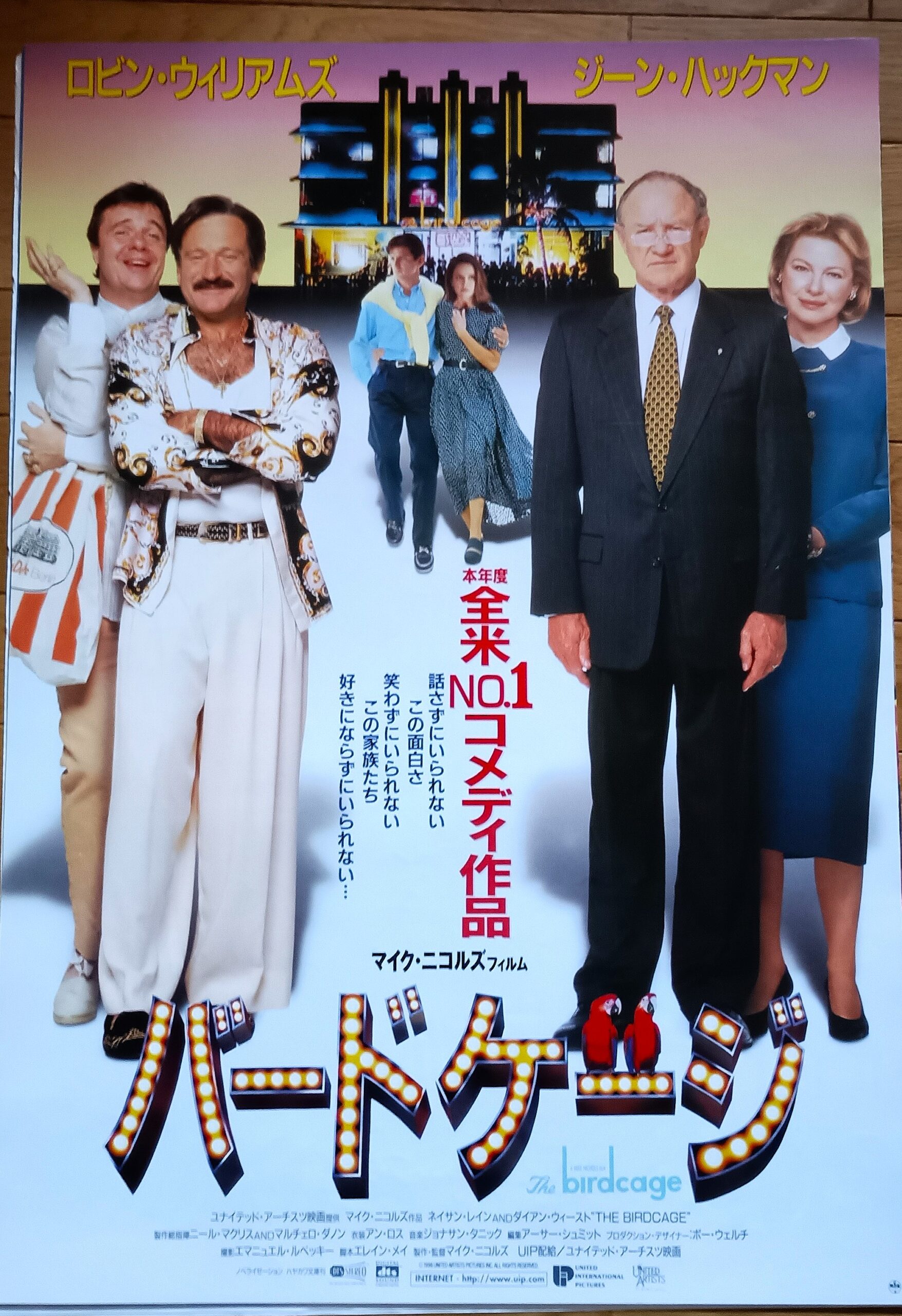 バードケージ/原作:ジャン・ポワレ。主題歌:ミスター・スレッジ。監督:マイク・ニコルズ。ロビン・ウィリアムズ&ジーン・ハックマン共演のアドリブ続出のコメディ演技が見どころ。パリの舞台でロングラン・ヒットとなり、78年には「Mr.レディ Mr.マダム」として映画化もされたジャン・ポワレの戯曲を、「ワーキング・ガール」「ウルフ」のマイク・ニコルズの製作・監督で再映画化。Mr.レディMr.マダム」のハリウッド版リメイク。フロリダの夜を彩るショー・クラブ“バードケージ”のオーナー兼演出家の夫アーマンド(ロビン・ウイリアムズ)と、彼の良き相棒であり店のトップ・スターのアルバート(ネイサン・レイン)は、仕事の上でも私生活でも最高のパートナー。そんなある日、突然息子のヴァルが結婚したいと言い出した。婚約者は超保守派で知られる上院議員キリー(ジーン・ハックマン)の娘。常識も性別も超えたアーマンドとアルバートの関係を理解してもらえないと考えた彼らは、ある作戦を思い付く展開。1996年12月14日公開。【サイズ:B2ポスター】【年代:1996年】