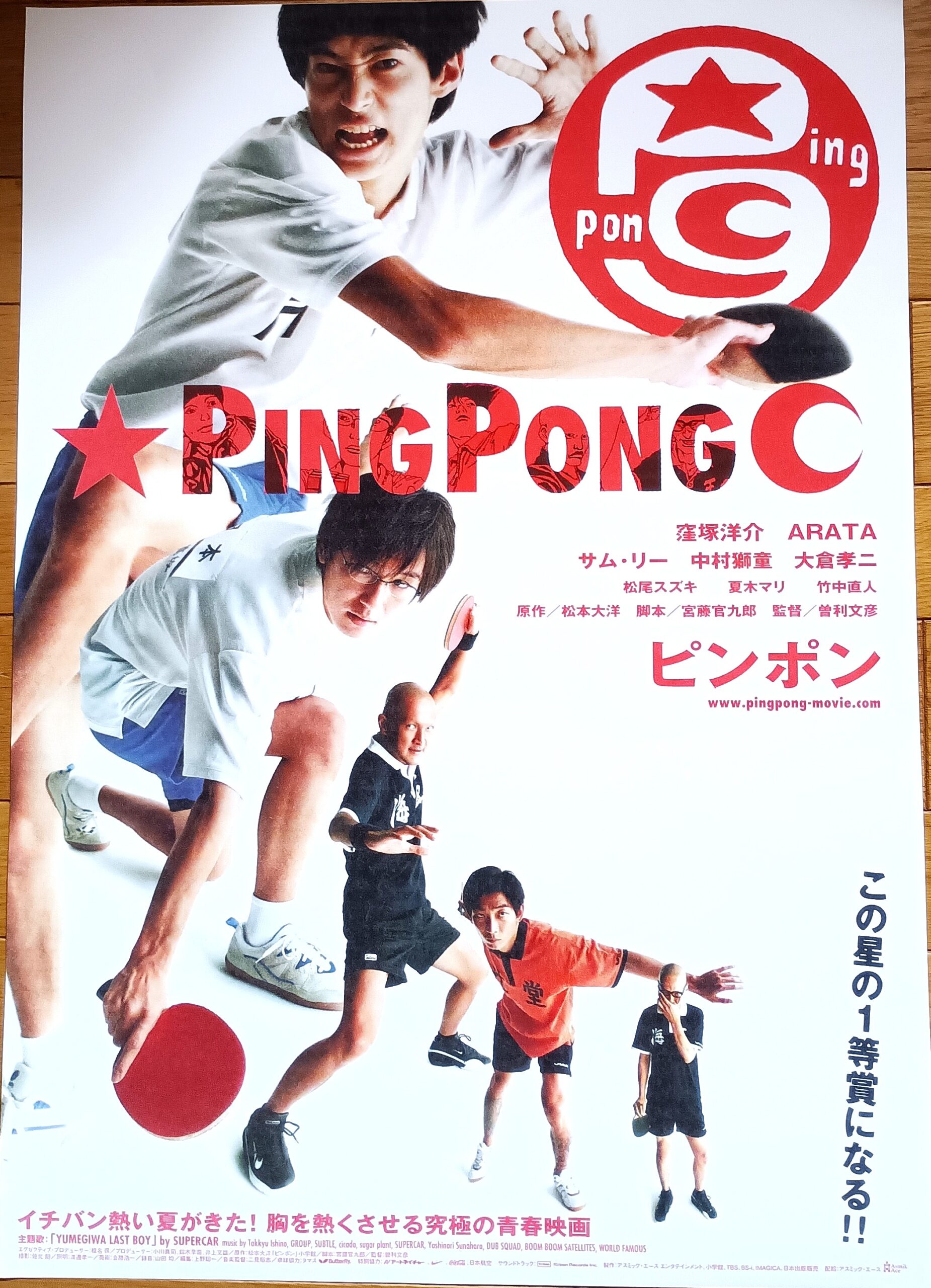 卓球をこよなく愛し、勝つことに絶対的な自信を持ちながら天真爛漫で気分屋のペコ(窪塚洋介)と卓球は暇つぶしと公言するクールなスマイル(井浦新)。二人は幼なじみで、小さい頃から近所にある卓球場、タムラに通っていた。高校生になった二人は共に片瀬高校卓球部に属していたものの練習にはまともに参加しない毎日を送っていた。そんな二人が対戦すると必ずペコが優位に立つ。しかし、日本卓球界の星と期待された過去を持つ卓球部顧問・小泉はスマイルの才能に目を付け、執拗に指導しようとする。インターハイ出場での熱い闘いが始まる。中村獅童がライバルに扮して存在感。興行も14億円の大ヒット。2002年7月20日公開、AMCホリデイスクエア18豊橋。【サイズ:B2ポスター】【年代:2002年】
