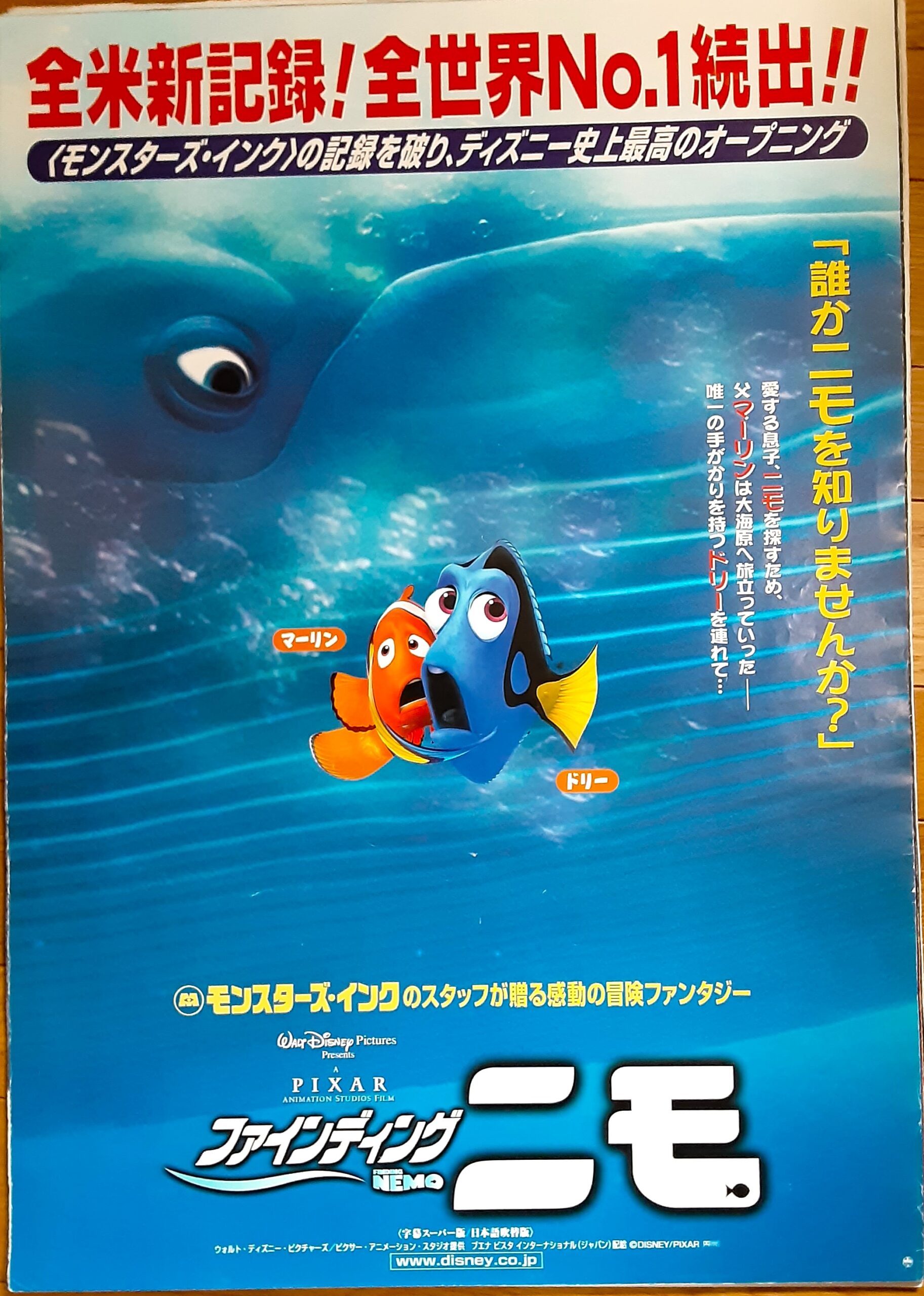 ファインディング・ニモ/音楽:トーマス・ニューマン。主題歌:ロビー・ウィリアムズ。監督:アンドリュー・スタントン、リー・アンクリッチ。ピクサー製作。愛する我が子を人間にさらわれた熱帯魚の父親が繰り広げる大冒険を描いたCG長編アニメーション。オーストラリア、グレートバリアリーフの海。妻と孵化寸前の子どもたちをバラクーダの襲撃で失ったカクレクマノミのマーリンは、唯一生き残った子ども・ニモを大切に育てていた。ある日、心配性すぎるマーリンに腹を立てたニモは人間のボートに近づくが、突然現れたダイバーに捕まり連れ去られてしまう。ニモを必死で追うマーリンは、唯一の手がかりを持つ陽気なナンヨウハギのドリーと共に大海原へと旅立つ。ピクサーの設定やイベントが、リアルでありながら意外性に満ちているから。たとえば、旅のパートナーとなるドリーは、大事なことを10秒と記憶していられない「メメント」な魚だ。過去の記憶にひきずられている主人公を際だたせるための、巧妙にしてユーモラスな設定である。こんな仕掛けが満載だから、たとえハッピーエンドになることがわかっていても、物語世界にどっぷりと浸ることができる。第76回アカデミー賞長編アニメ賞受賞。国内では110億円のメガヒットで続編「ドリー」が製作される。2012年9月15日公開、ユナイテッドシネマ豊橋18。【サイズ:B2ポスター】【年代:2003年】