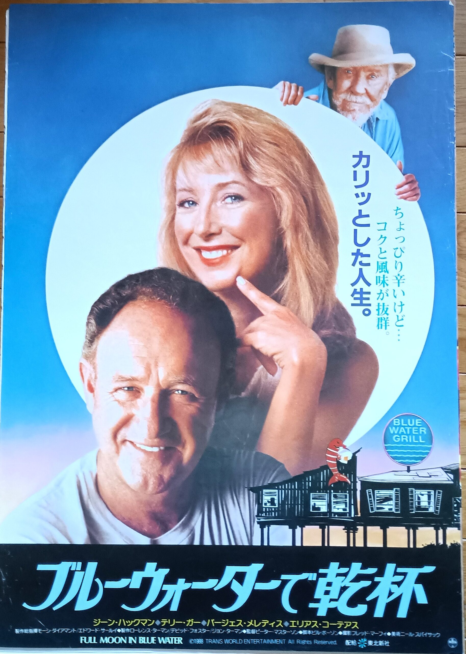 ブルーウォーターデカンパイ/脚本:ビル・ボーソン。音楽:フィル・マーシャル。監督:ピーター・マスターソン。ジーン・ハックマン主演。テキサスの湾岸に浮かぶ町のグリル・バー、ブルーウォーター。店主のフランク(ジーン・ハックマン)は妻ドロシーの行方不明のせいで仕事に身が入らず、幸福な日々を写した8ミリフィルムを見て日がな暮らしている。店を売却させようと、不動産業者が乗り込んで来るが、義父の“大将”(バージェス・メレディス)が一時追い払う。大将は車椅子の身で今や恍惚の人であるが、店員のジミー(エリアス・コティーズ)とは奇妙な友情で結ばれていた。また、ハイミスのスクール・バスの運転手、ルイーズ(テリー・ガー)がいてフランクに思いを寄せていた。ある日、ドロシーの死体が海から引き上げられ、同じ頃、大将はジミーのミスで車椅子ごと海へ転落。危機を迎えたフロイドだったが、ルイーズの活躍で店の売却問題も解決、2人は結ばれる。大将も命をとりとめ、ブルーウォーターにも昔の活気が蘇える。1989年8月26日公開、豊橋公開履歴は不明。【サイズ:B2ポスター】【年代:1989年】