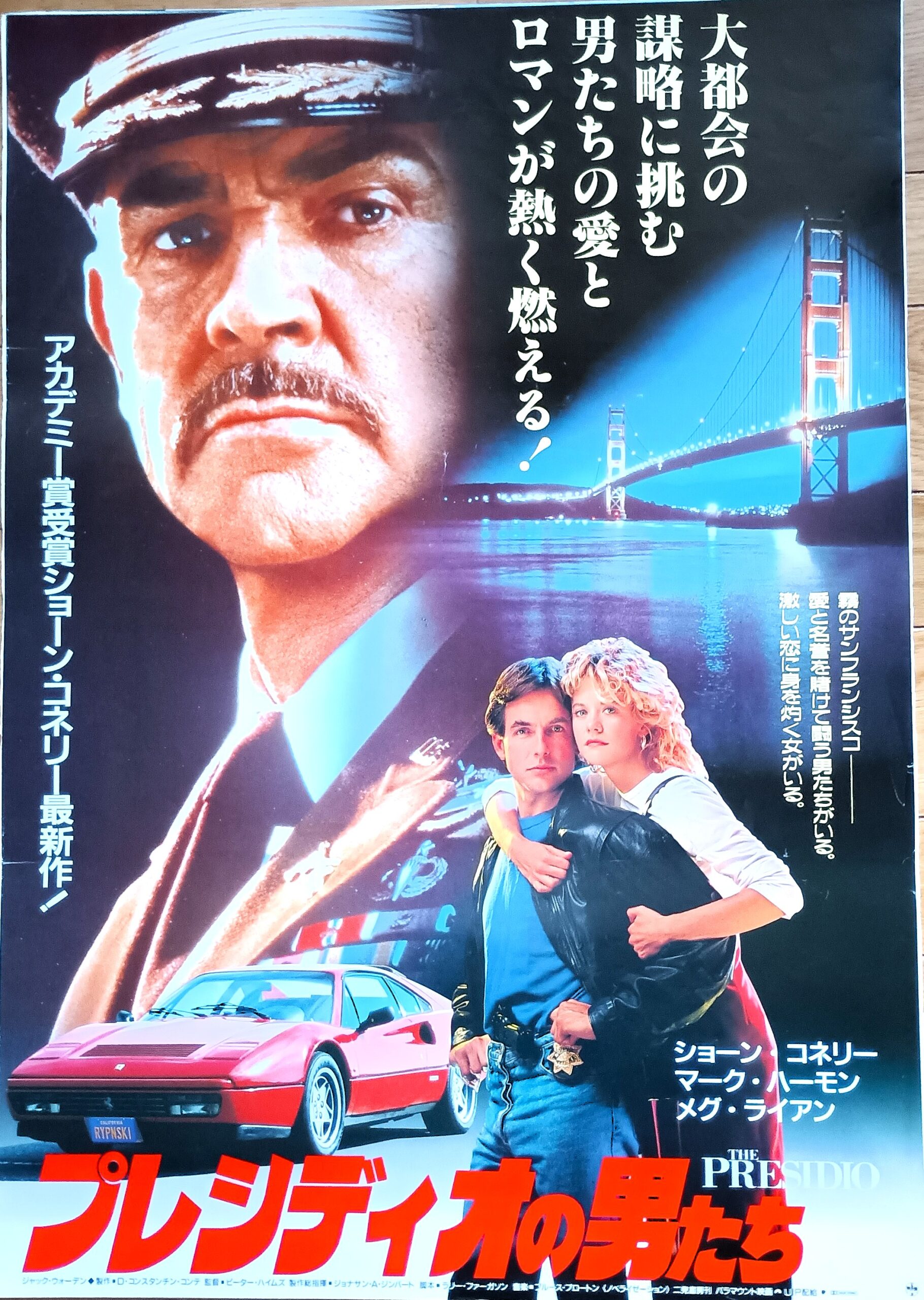 プレシデオノオトコタチ/音楽:ブルース・プロ―トン。監督:ピーター・ハイアムズ。ショーン・コネリー主演。基地内殺人事件を巡って繰り広げられる男たちの愛と名誉を賭けた戦いと、父であり一方は恋人であるその2人の男の狭間に立たされた娘(メグ・ライアン)の愛を描くサスペンス。サンフランシスコのプレシディオ軍事基地に侵入した2人組強盗が、MPを射殺して逃亡。オースティン刑事(マーク・ハモン)は、かつての上司、MPの隊長コールドウェルと共に、基地内の密輸事件を追う。コールドウェルと娘の確執、さらにその娘とオースティンの恋などを交えて描く。坂道をバウンドしながら行うカー・チェイスなどアクション・シーンのキレはやはりいい。基地内に配達される瓶詰飲料水が密輸品であることが判明して、強盗犯が狙って基地内に侵入したことが判る。クライマックスは飲料会社内での銃撃戦で、コネリーの親友ジャック・ウォーデンが犠牲になりその葬儀でコネリーが心情を告白して、娘が父親を理解する。頑固な父親でありMP隊長をコネリーが貫録で演じる。1988年8月6日公開、広小路スカラ座。【サイズ:B2ポスター2種類】【年代:1988年】