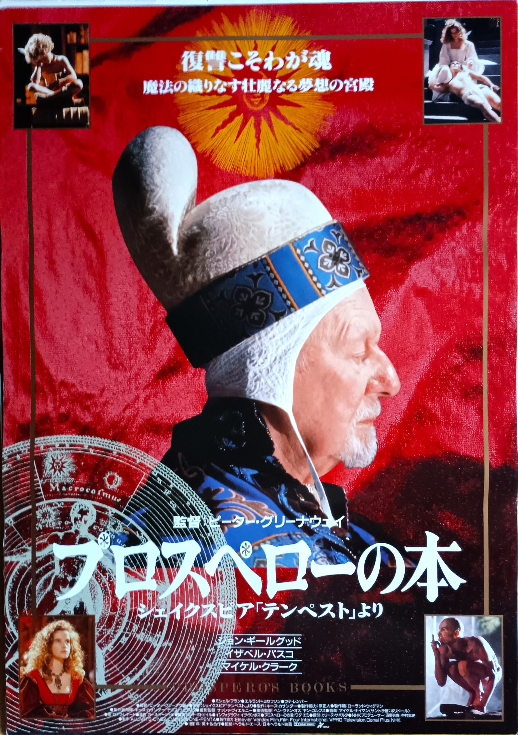 プロスペローノホン/原作:ウィリアム・シェイクスピア「テンペスト」。脚本・監督:ピーター・グリーナウェイ。ウィリアム・シェイクスピア最後の戯曲「テンペスト」を原案に独創的な映像美で描いたサスペンスフルな復讐劇。かつてミラノ大公だったプロスペローは、12年前にナポリ王アロンゾーと共謀した弟アントーニオに国を追放され、娘ミランダとともに絶海の孤島で暮らしていた。アロンゾーへの復讐を片時も忘れないプロスペローは、友人ゴンザーローから譲り受けた24冊の魔法の本を長い歳月をかけて読み解き、強大な力を手に入れる。やがてプロスペローは島の怪物キャリバンや妖精エアリエルを操り、魔法の力で復讐を遂行していく。衣装デザインをワダ・エミが担当して話題。1990年12月21日公開だが豊橋では未公開。【サイズ:B2ポスター】【年代:1990年】
