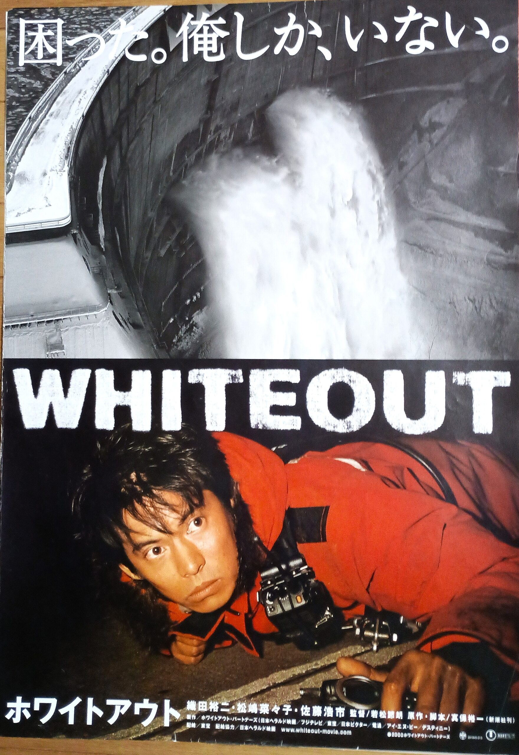 ホワイトアウト/原作:真保浩一。脚本:真保浩一、長谷川康夫、飯田健三郎 音楽:ケンイシイ、住友紀人。監督:若松節朗。織田裕二主演。新潟県日本最大のダムを占拠したテロリスト一味から、人質を救うべく立ち上がった青年の活躍を描いたサスペンス・アクション。監督は本篇初監督作となる『正義は勝つ』の若松節朗。犯人グループは、ダムの職員と平川千晶(松嶋奈々子)を人質に取って50億円を政府に要求。拒否すれば人質を殺し、ダムを爆発すると通告してきた。ダムが決壊すれば、下流域の住民20万世帯は一瞬のうちに洪水に飲まれてしまう。期限は24時間、ダムに通じる唯一のルートは犯人グループが爆破しており、悪天候で警察は成す術もない。そんな中、偶然逃げおおせた富樫は、仲間と住民を救うことを決意。犯人グループの攻撃をくぐり抜けダムの放水を防ぐと、外部との連絡を取る為、たったひとりで8キロ先の大白ダムへと向かう。富樫の連絡によって、犯人グループが宇津木を中心とした過激派・赤い月であることが判明した。しかし、未だ対策本部がダムへ乗り込むことは叶わない。そこで、富樫は人質を救出する為、再び奥遠和ダムへ戻る。主人公に織田裕二、人質女性に松嶋奈々子、テロリストリーダーが佐藤浩市、警察署長に中村嘉津雄。興収42億円の大ヒット、第24回日本アカデミー賞最優秀助演男優賞に佐藤浩市が受賞、又最優秀録音賞も受賞。2000年8月19日公開、AMCホリデイスクエア18豊橋。【サイズ:B2ポスター】【年代:2000年】