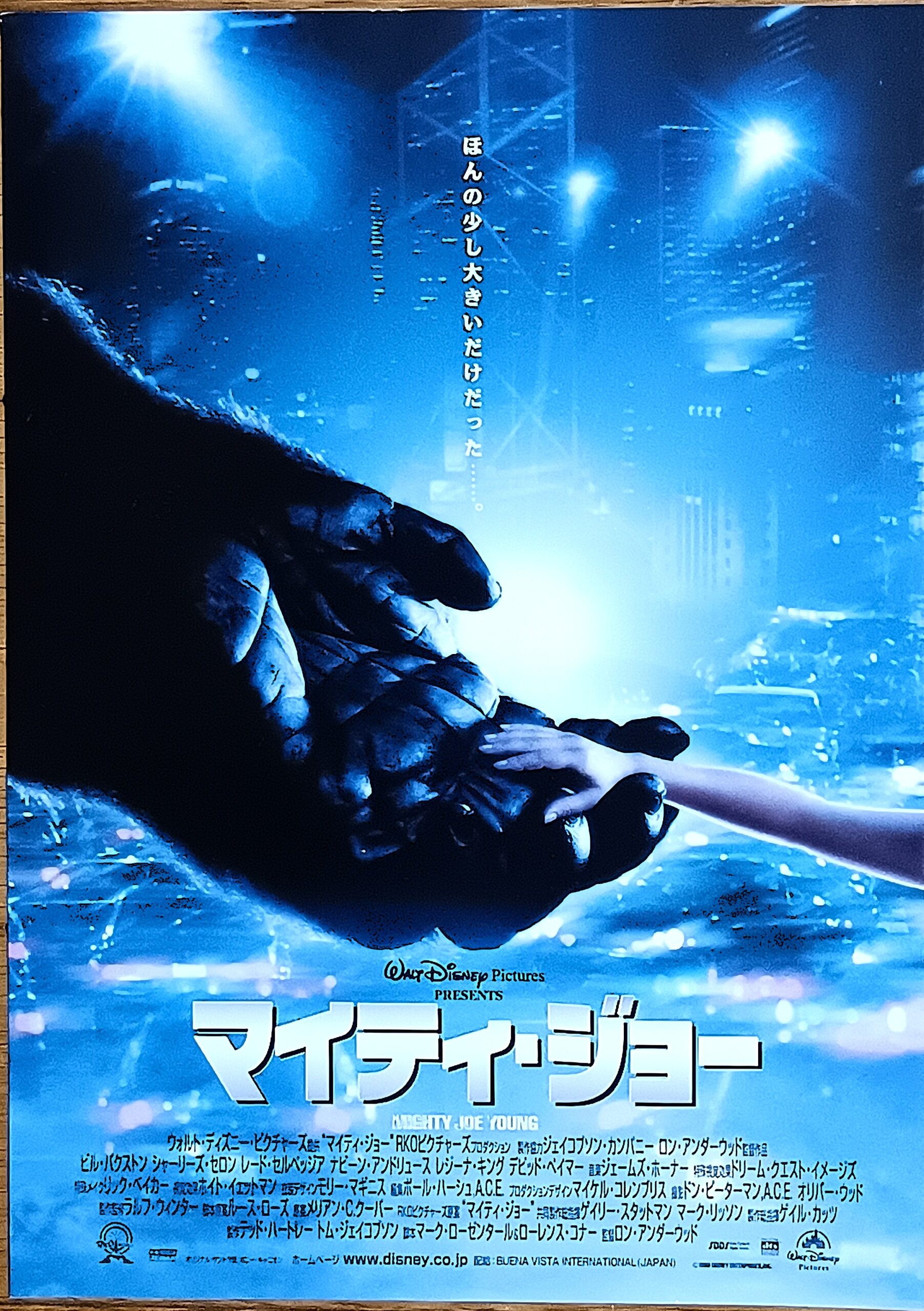 マイティ・ジョー/音楽:ジェームズ・ホーナー。監督:ロン・アンダーウッド。SFX:リック・ベイカー。心優しき巨大ゴリラと彼を見守る勇敢な女性の冒険をSFXで描いたファンタジー・ロマン。「猿人ジョー・ヤング」(49)のリメイクで、監督は「トレマーズ」「愛が微笑む時」のロン・アンダーウッド。アフリカ奥地の小さな村。ジル(シャリーズ・セロン)は母親の動物学者ルースが密猟者に殺された後、彼女が身を挺して守ったゴリラのジョーと姉弟のように育った。事件以来12年、ジルは美しい女性に成長し、ジョーは体長5メートルの巨体となり、村の守護神として崇められる存在となっていた。そんなジョーに再び密猟者の魔の手がのびる。ジルは村に来たアメリカの動物学者グレッグ(ビル・パクストン)に説得され、ジョーをカリフォルニアの野生動物保護センターに移送することに。ところが、かつてジルとジョーの母親を殺し、その時にジョーに指を噛み切られたことを根に持つ密猟者シュトラッサー(レード・セルベッジア)がそれを知り、復讐のためジルに接近。シュトラッサーはジルをだましてジョーを挑発して暴れさせ、トラックに積んでうまくロサンジェルスの街へと連れ出すが、ジョーはジルを求めて脱走。突如現れた巨大ゴリラに街は大パニック。お互いに行方を捜しあうジョーとジルは大騒動の末に再会。ジルはジョーの優しさを人々に教えようとし、ふたりは新たな運命に立ち向かう。1999年4月10日公開、豊橋ピカデリー。【サイズ:B1ポスター&B5チラシ】【年代:1999年】