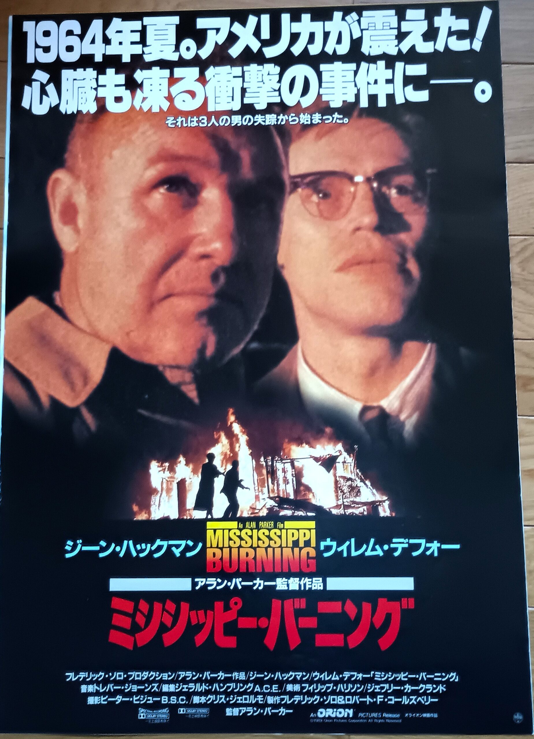 ミシシッピー・バーニング/脚本:クリス・ジェロルモ。音楽:トレヴァー・ジョーンズ。監督:アラン・パーカー。ジーン・ハックマン主演。1964年の夏、行方不明三人の公民権運動家の捜査のためミシシッピーにやって来た二人のFBIエージェント。予想以上に厚い人種差別の壁に阻まれながら、捜査は難航する。実話を基にした、社会派サスペンスの一級品。脚本は人種問題と捜査劇を巧みに織り混ぜており、南部出身で人間臭い捜査官に扮したジーン・ハックマンのパワフルな演技が見応え。アメリカの南部における人種差別問題を描くサスペンス大作。容疑者と思われるグループを罠にかけ、その中でもとりわけ気の弱い者に脅しをかけて口を割らせるという思い切った手段で次々と事件に関与した人物たちの名前とその動機が明らかにされる。ついに事件の核心は姿を見せる展開をサスペンスフルに描く。第61回アカデミー賞撮影賞受賞。1989年3月11日~31日豊橋ピカデリー2、併映「ペテン師とサギ師だまされてリビエラ」。【サイズ:B2ポスター】【年代:1989年】