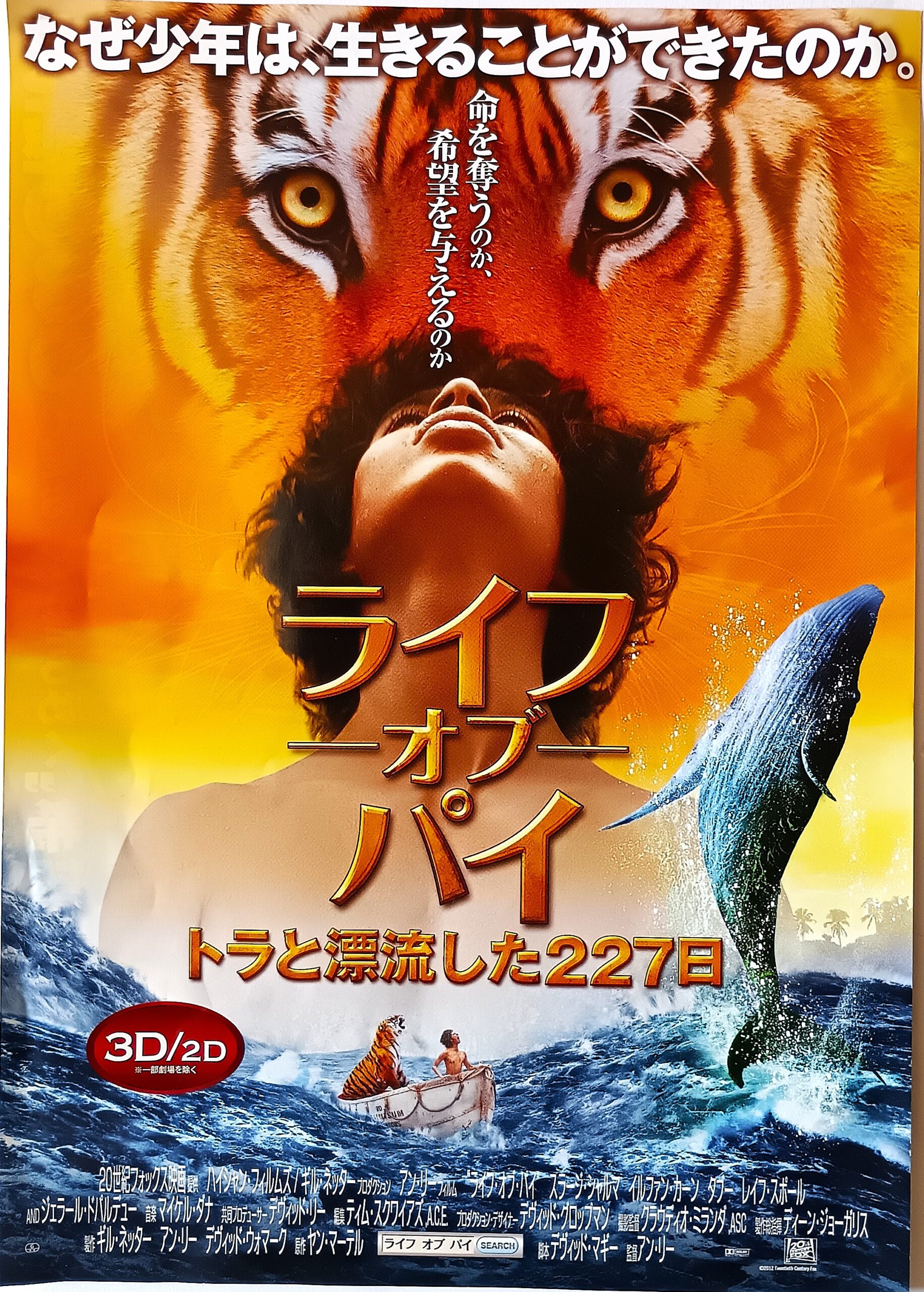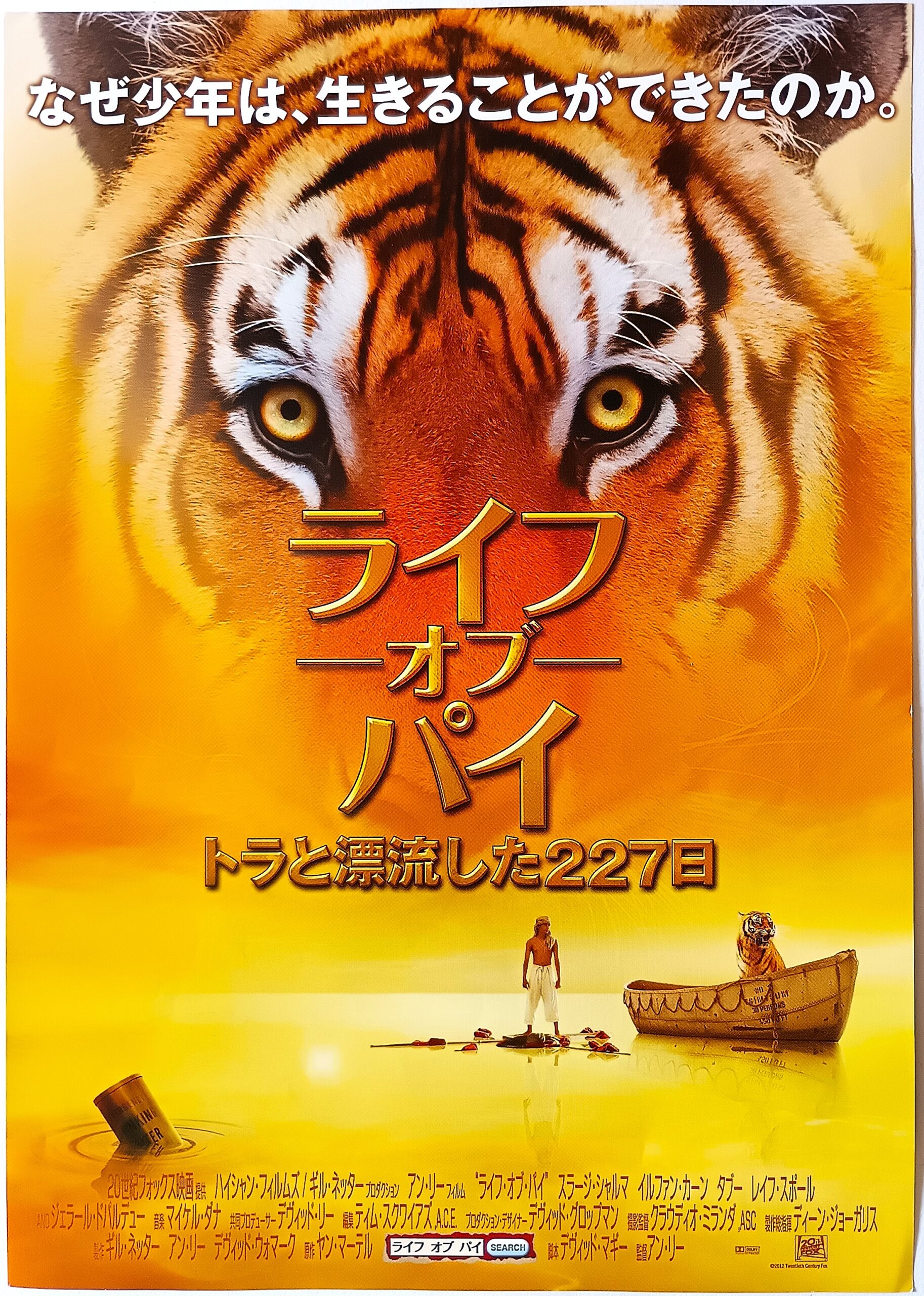 ライフ・オブ・パイ トラトヒョウリュウシタ227ニチ/原作:ヤン・マーテル「パイの物語」。音楽:マイケル・タナ。監督:アン・リー。ブッカー賞受賞の世界的ベストセラー小説「パイの物語」、「ブロークバック・マウンテン」「ラスト、コーション」のアン・リー監督が映画化。動物園を経営する家族と航行中に嵐に遭い、どう猛なトラと一緒に救命ボートで大海原を漂流することになった16歳の少年のサバイバルを描く。主演は、オーディションで選ばれた無名のインド人少年スラージ・シャルマ、共演にはフランスの名優ジェラール・ドパルデュー。1960年インド・ポンディシェリに生まれた少年パイは、父親が経営する動物園でさまざまな動物たちと触れ合いながら育つ。パイが16歳になった年、両親はカナダへの移住を決め、一家は動物たちを貨物船に乗せてインドをたつが、洋上で嵐に遭遇し貨物船が沈没。必死で救命ボートにしがみついたパイはひとり一命を取りとめるが、そこには体重200キロを超すベンガルトラがいた。地元の人間に救助され入院した少年のもとに日本の保険調査員が2人、沈没の原因を尋ねにやってくる。トラとの漂流の物語を信じない彼らは「誰もが信じられる真実の話」を要求する。すると、助かったのはコックと仏教徒の船員、パイの母、そしてパイだったという。船員は脚にケガを負っており、食糧があるのにネズミを食べるコックは「船員の脚を切らないと体が腐って死んでしまう」といい、パイと母親は痛がる船員を押さえて、コックが脚を切った。船員は助からずに死に、コックはその脚を魚のエサにした。母が怒ったら脚を食べて、大喧嘩になり、パイにイカダに乗り移るように言ったが、母はコックに刺されて海に落とされ、サメに食われた。怒りに燃えたパイはコックを殺し、たった一人で漂流することとなったという。「母を先に乗せればよかった」と悔やむ。この話を聞いた小説家はトラ=パイ、ハイエナ=コック、オランウータン=母、シマウマ=船員だと指摘すると、どちらの話でもいいとパイは答える。家族が帰ってきたので、小説家が「ハッピーエンドだ」というと、「そちら次第さ、君の物語だからね」と答える。第85回アカデミー賞監督・作曲・撮影・視覚効果賞受賞。2013年1月25日公開、ユナイテッドシネマ豊橋18。【サイズ:B5チラシ 2種類】【年代:2013年】