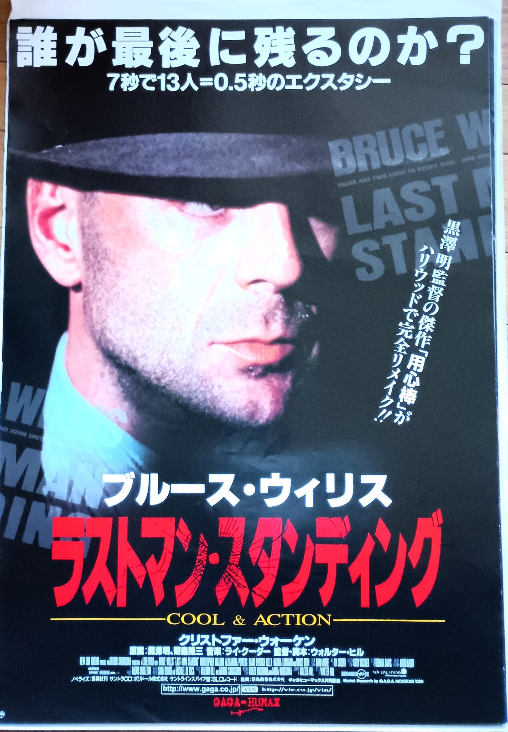 ラストマン・スタンディング/原作:黒澤明「用心棒」。音楽:ライ・クーダー。脚本・監督:ウォルター・ヒル。ブルース・ウィルス主演。黒澤明の傑作「用心棒」を、ウォルター・ヒルが1930年代のギャング社会の設定でリメイクしたアクション映画。アイルランド系とイタリア系のギャングが睨み合う町、ジェリコ。そこに訪れたジョン・スミスは、絡んできた男たちを二丁拳銃であっと言う間に始末する。彼を仲間に引き入れようと二つの勢力が動き出して対立、ジョンは二つの組織を壊滅して去っていく。サム・ペキンパーへのオマージュも込めたショット多数あって、アメリカでは「荒野の用心棒」リメイクかも。ブルーズ・ウィルスの40代初期の作品で興行的にはイマイチ。1997年2月8日公開、豊川コロナワールド。【サイズ:B2ポスター】【年代:1997年】