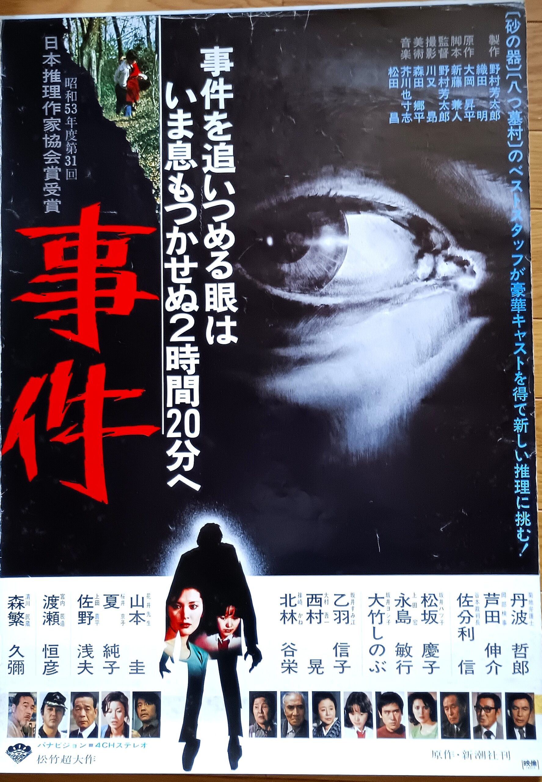 ジケン/原作:大岡昇平。脚本:新藤兼人。音楽:芥川也斗志、松田昌。監督:野村芳太郎。大竹しのぶ主演。単なる刺殺事件と思われた背後に、一人の青年を愛してしまった姉妹の激しい葛藤が渦巻いていたさまを裁判の過程で浮き上がらせていく骨太のサスペンス・ドラマ。神奈川県の相模川沿いにある土田町の山林で、若い女性の刺殺死体が発見された。その女性はこの町の出身で、一年程前から厚木の駅前でスナックを営んでいた坂井ハツ子(松坂慶子)であった。数日後、19歳の造船所工員・上田宏(永島敏行)が犯人として逮捕される。宏はハツ子が殺害されたと推定される日の夕刻、現場付近の山道を自転車を押しながら下りてくるのを目撃されていた。警察の調べによると、宏はハツ子の妹、ヨシ子(大竹しのぶ)と恋仲であり、彼女はすでに妊娠三ヵ月。宏とヨシ子は家を出て横浜方面で暮らし、子供を産んで、二十歳になってから結婚しようと計画していた。ハツ子はこの秘密を知り、子供を中絶するようにと二人に迫る。ハツ子は宏を愛し、ヨシ子に嫉妬していた。その頃ハツ子には宮内(渡瀬恒彦)というやくざのヒモがいた。彼女は宮内と別れて、宏と結婚し、自分を立ち直らせたいと思っていた。ハツ子が親に言いつけると宏に迫った時、彼はとっさに登山ナイフをかまえて彼女を威嚇した。宏が一瞬の悪夢からさめ気がついた時、ハツ子は血まみれになって倒れていた。上田宏は逮捕され、検察側の殺人、死体遺棄の冒頭陳述から裁判が開始される。果たして本当に宏が殺人を犯したのかという疑問を含め、裁くもの裁かれるものすべてを赤裸々にあばきながら、青春そのものが断罪されていく。第2回日本アカデミー賞では作品・監督・脚本・主演女優・助演男優賞の5冠。大竹しのぶと渡瀬恒彦がその年の助演賞を多数獲得。138分。テレビでは1978年~1981年にかけてのNHKドラマ若山富三郎主演で菊池弁護士に扮したシリーズと1993年北大路欣也と2023年椎名桔平のシリーズが人気だった。1978年6月3日~30日豊橋松竹。1979年2月17日~3月2日豊橋松竹、併映「八つ墓村」。【サイズ:B2ポスター】【年代:1978年】