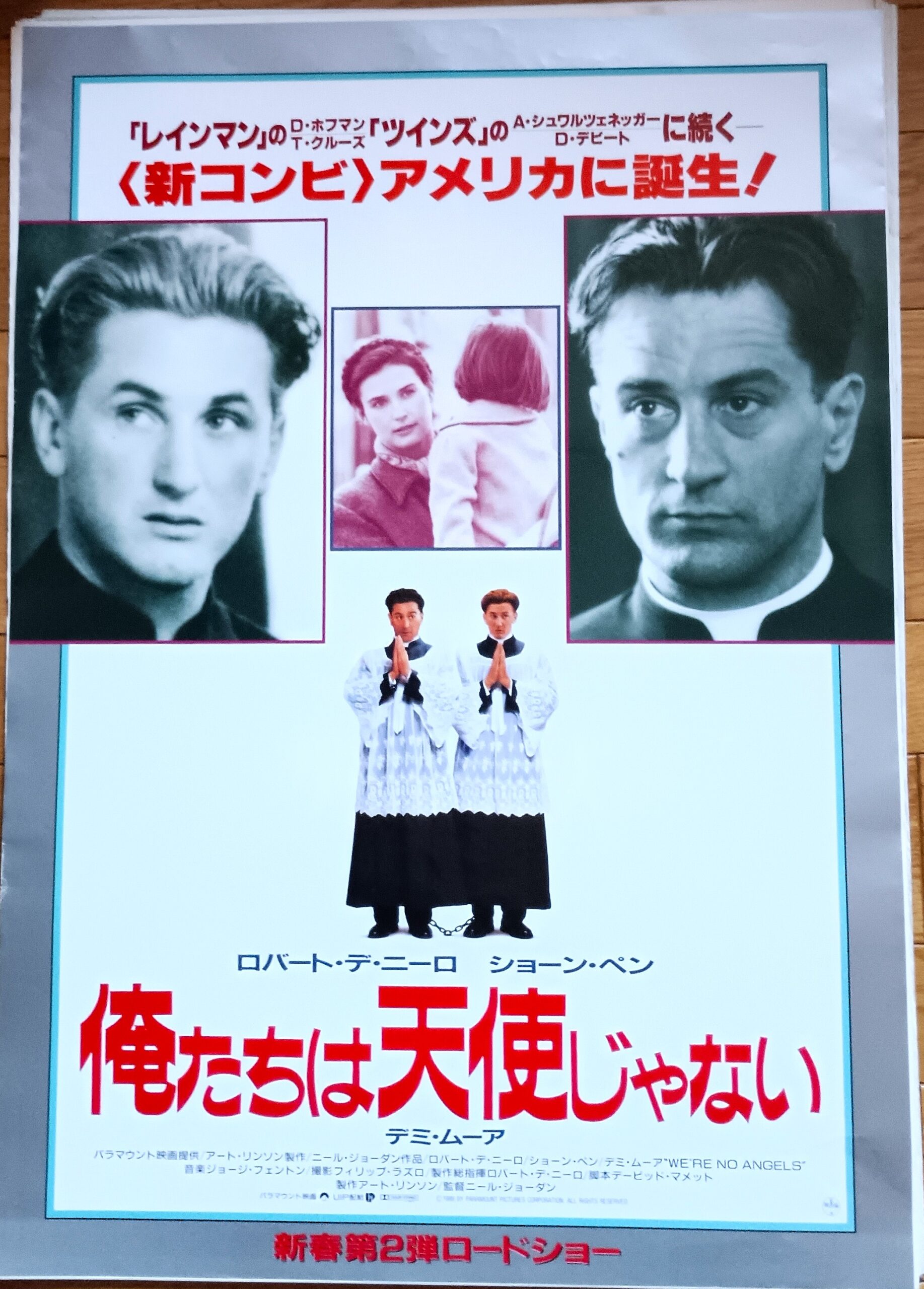 オレタチハテンシジャナイ/原作:アルペール・ユッソン。音楽:ジョージ・フェントン。監督:ニール・ジョーダン。製作・主演:ロバート・デニーロ。1955年マイケル・カーティス監督ハンフリー・ボガード主演作品の現代風にアレンジしてのリメイク。サスペンス感溢れる異色作に仕上げたライト・コメディ作品。時は1935年のカナダに近いアメリカの刑務所。極悪囚人のボブが処刑される寸前に看守たちを撃ち殺して脱走を謀った。処刑場にたまたま居合わせたコソ泥のネッドとジムは訳がわからないままボブと共に脱走し、二人はカナダ国境を目指すのだった。しかし途中で老婆と出くわし、出任せで言った言葉からあれよあれよと言う間に著名な神父様に間違われる。国境を越える機会をうかがっているうちに、ネッドが聾啞者の幼い娘を抱えるモリーと恋に落ちるなど様々な騒動が起こり、2人の心境にも変化が起こってゆく物語。1990年2月10日公開、広小路スカラ座。【サイズ:B2ポスター】【年代:1990年】