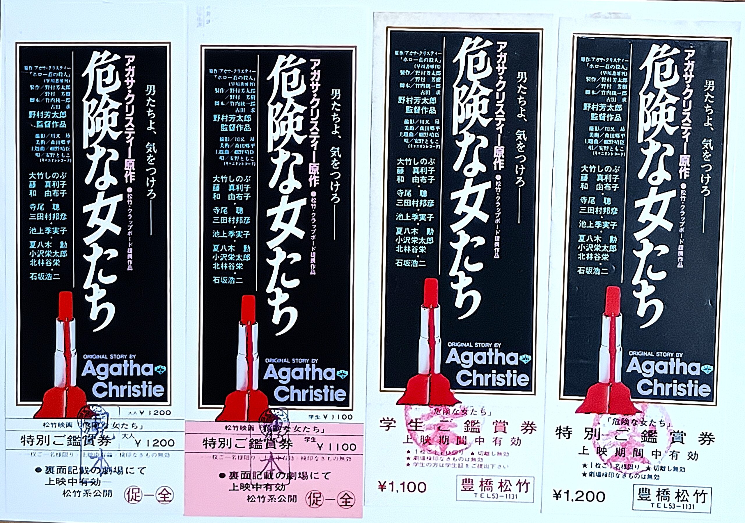 キケンナオンナタチ/原作:アガサ・クリスティ「ホロー荘の殺人」。脚本・監督:野村芳太郎。音楽:杉田一夫。主題歌:安部ともこ。アガサ・クリスティの推理小説『ホロー荘の殺人』をもとに、竹内銃一郎と古田求がシナリオを執筆、野村芳太郎がメガホンをとったミステリー。石坂浩二が事件の謎を探る推理作家に扮し、金田一耕助ばりの活躍を見せる。神戸の病院で院長を務める絹村健一郎と妻ハナが暮らす白浜の別荘に、息子の升森弘、娘の藤井冴子と水野美智子が訪れる。院長代行の棚瀬秀雄も妻の紀子を伴い来訪、別荘の隣に住むミステリー作家の枇杷坂周平と秀雄の息子の守も加わり、会食が始まった。そこへかつて秀雄の恋人だった橋まゆみが現れ、別荘が停電になったので見てほしいと秀雄を連れ出した。翌朝、健一郎の家族は揃って釣りに出かけるが、一発の銃声が鳴り響き状況が一変。そこには血を流して倒れた秀雄と、銃を手に立ち尽くす紀子の姿があった。室内劇スタイルで贈る極上の犯人当てミステリー。1985年5月25日公開豊橋松竹。【サイズ:豊橋ピカデリー割引券】【年代:1985年】