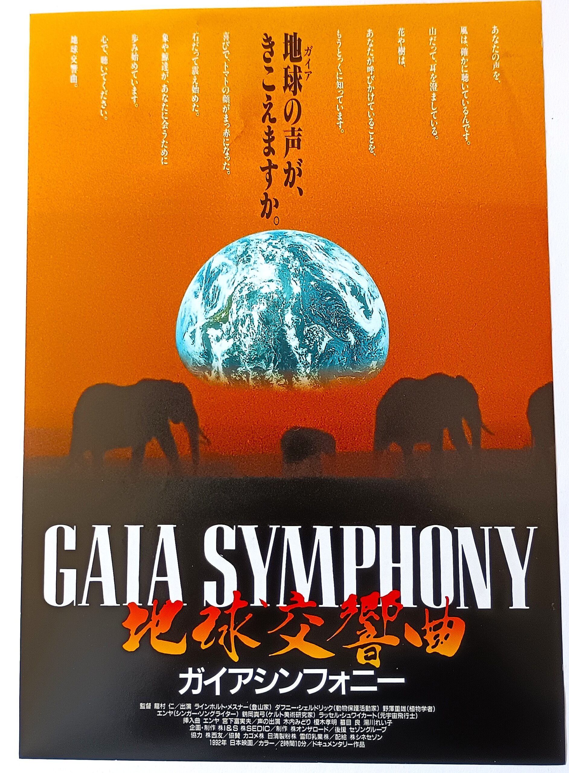 チキュウコウキョウキョクガイアシンフォニー/監督:瀧村仁。撮影:本田茂。6人の語り部がそれぞれ“地球(ガイア)と私”というテーマで語っていくことによって地球の未来へ向けてのメッセージを綴るオムニバス形式のドキュメンタリー。監督はNHK出身で、「キャロル」(74)などの龍村仁。登場する語り部は、臨死体験などについて語るラインホルト・メスナー(登山家、イタリア、日本語の声は蟇目良)、メスの象エレナとの再会シーンを中心に象の社会から人間社会へのメッセージを伝えるダフニー・シェルドリック(動物保護活動家、ケニア、声は湯川れい子)、トマトの成長を通して科学の常識では計り知れない奇跡を見せる野澤重雄(植物学者、日本)、アイルランドの自然とケルン遺跡を訪れるエンヤ(歌手、アイルランド)と鶴岡真弓(ケルト美術研究家、日本)、科学技術の最先端で理解した生命観を語るラッセル・シュワイカート(元宇宙飛行士、アメリカ、声は龍村仁)の6人。ナレーターは木内みどりと榎木孝明。『第一番』から2006年公開の『第六番』までが主に自主上映で展開され、5600回以上の上映を通じて延べ220万人以上の観客を動員。その後2015年公開の『第八番』まで制作が継続され、2015年時点で累計延べ240万人以上の動員を記録している。この映画は当初、上映する映画館が無かったために、完成から約1年の間「お蔵入り」していた。1992年、龍村が自らチケットを引き受けることを条件に、ようやく数週間の上映に漕ぎ着けた。上映後1日、2日は龍村からチケットを買った友人や知人で満員になったが、3日目から観客は激減。ところが、公開から2週間目を過ぎた頃から、映画を鑑賞した人の口コミにより、当日客が増加。最終的に、第一番の観客動員は3年目に30万人、第二番は半年で20万人を越えた。130分。1992年11月17日公開。【サイズ:B5チラシ】【年代:1992年】