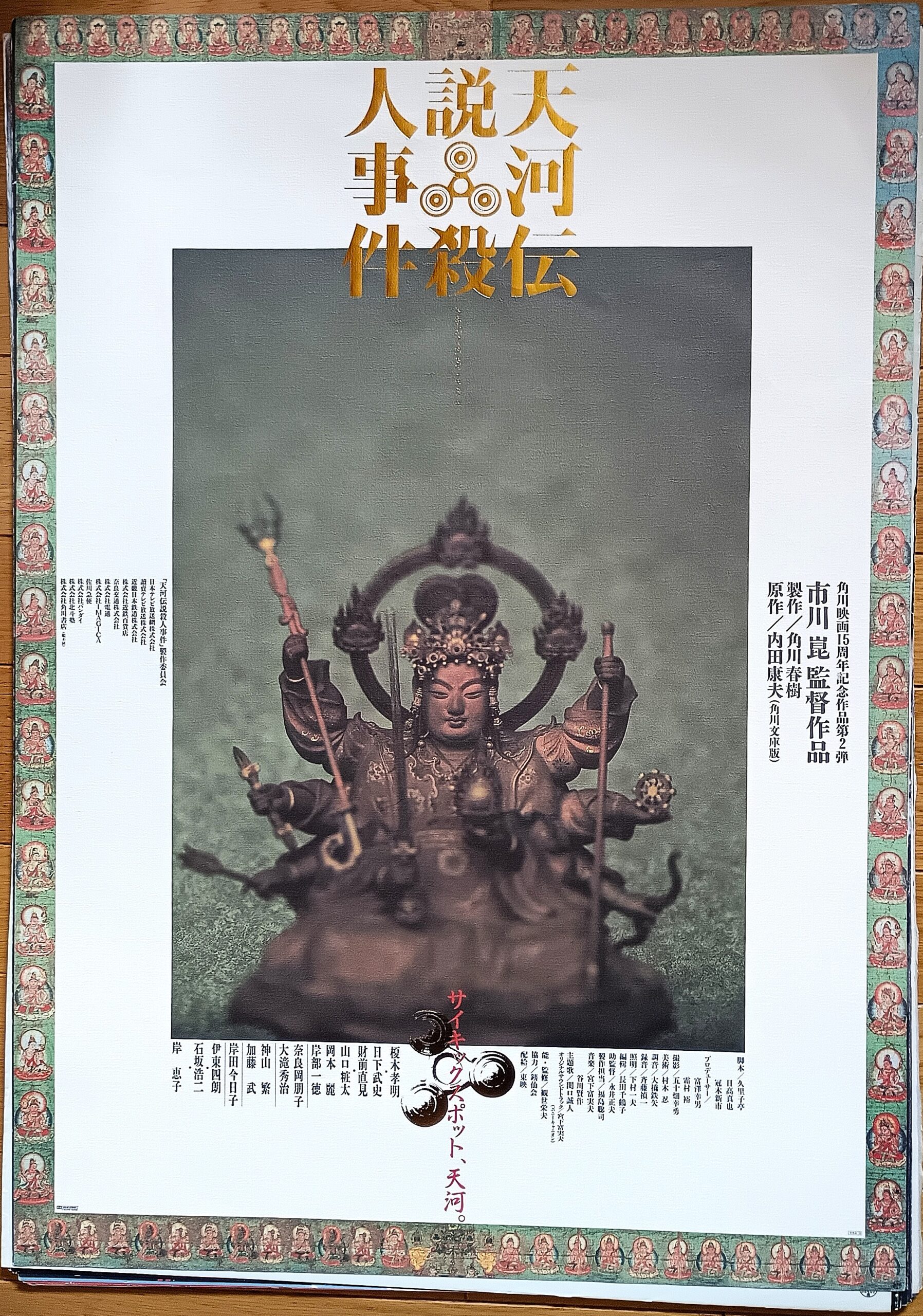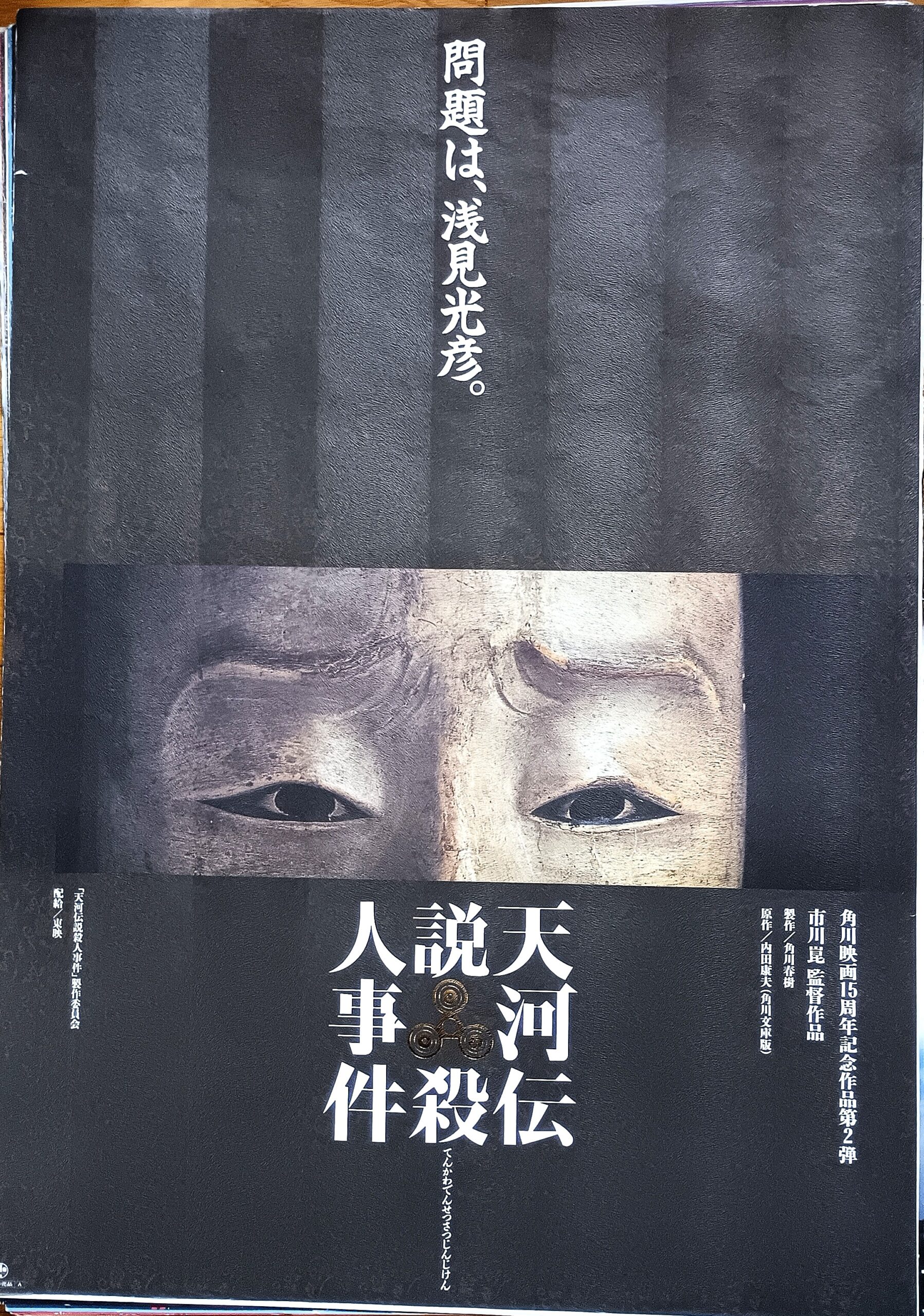 アマカワデンセツサツジンジケン/原作:内田康夫。音楽:宮下富実夫、谷川賢作。監督:市川崑。角川映画15周年記念作品の第二弾。市川崑監督で東宝の金田一シリーズで出演したキャストを起用したが興行はあまり伸びず。奈良県天川村を舞台に能の宗家に起こった跡目争いの殺人事件を、ある一人の紀行ライターを通して描いた殺人ミステリー。能をテーマにした取材の為、吉野の天河神社を訪れた紀行ライターの浅見光彦は、変死体で発見された能の宗家・水上流長老の殺人容疑で逮捕される。すぐに容疑が晴れ釈放された光彦はその後、水上流後継者をめぐる殺人事件に関わってゆく展開。浅見の推理によって、新宿のサラリーマン毒殺事件と長老の死が水上家と深く関わり合っていることが明らかになる。そんな時、能楽堂で和憲が演じるはずの舞台を踏んでいた和鷹が、その舞台上で毒殺。それは『道成寺』の見せ場“釣鐘落とし”での一瞬の出来事だった。浅見は毒殺の小道具に忌まわしい『雨降らしの面』が使われたことを直感するが、その直後から面は消えてしまっていた。聞き込みを続け、浅見は意外な犯人像を掴む。それは天河館の敏子(岸恵子)。哀しみややりきれなさに苦しみながらも、敏子や秀美(財前直美)の前で事件の謎を解明する浅月。敏子は和鷹の実母だった。生後間もない和鷹を宗家にするという約束で水上家に奪われた敏子は、その証しにと『五十鈴』をもらうが、そのことを中学時代の同級生だった川島に知られ、脅された敏子は、和鷹を思うあまり殺してしまう。そのことによって「和鷹を宗家には出来ない」と言った高崎(神山繁)をも殺してしまい、その殺意は和憲へと向かう。和憲の踏むはずだった舞台を和鷹が踏んだことによって、実の子を殺した敏子は、天河神社で行われる薪能の夜に自殺する。1991年3月16日公開、豊橋東映。【サイズ:B2ポスター2種類】【年代:1991年】