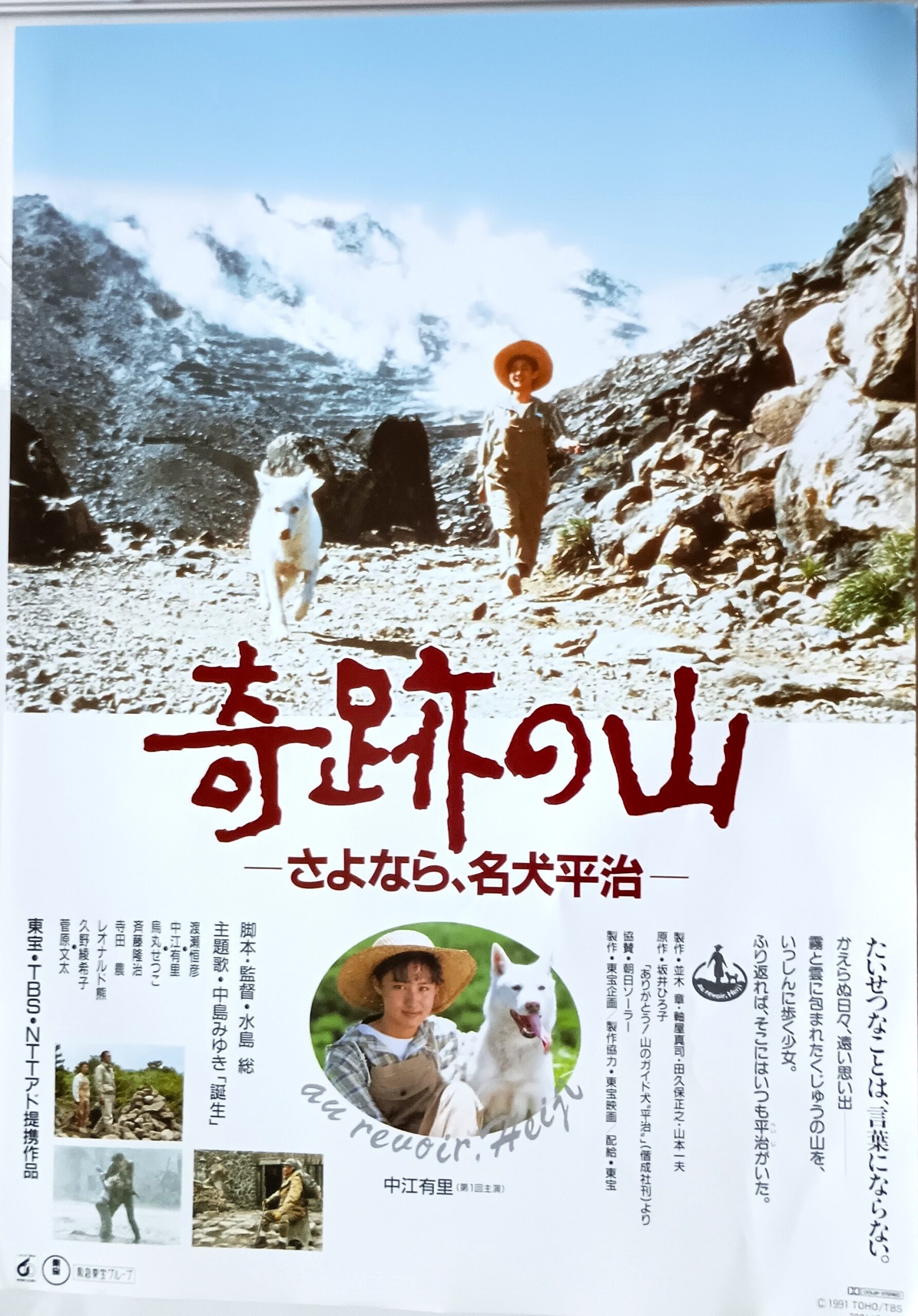 キセキノヤマ サヨナラ、メイケンヘイジ/原作:坂井ひろ子。脚本・監督:水島総。音楽:荻野清子 主題歌:中島みゆき。東宝創立60周年記念映画。大分県九重連山の自然を背景に、失語症に陥ってしまった少女と無二の親友である1匹の犬との交友を描くヒューマンドラマ。父親の浮気による両親の離婚、母親の自殺など度重なるショックから失語症になってしまった少女・敦子。彼女は母の思い出にすがるように母の故郷である九重の山に残る決心をする。敦子は母の死の現場にいた子犬が母の身代わりのように思えてならず、母が好きだった九重連山のひとつ、平治岳にちなんで平治と名付け育てる。九重山で案内人をする敦子の祖父・清三はそんな2人を静かに見守る。やがて清三と敦子は、平治をガイド犬として育てることに決め、訓練を始めた。雄大な自然の中で敦子は少しずつ元気を取り戻していくかのように見えたが、父親の弘をどうしても許すことができず、弘から送られてきた新しい子供の写真を火の中に投げ捨てる。弘は新しい妻・恵子と子供との生活を始めていながらも、別れた妻の死因、敦子が声を失った原因は自分にあるという思いから自責の念に駆られていた。言葉がしゃべれない敦子に合わせるように一言もしゃべらずに山道を歩き始める弘。やがて2人の間には和解が芽生えてくる。ある日、山に嵐が吹き荒れ、それと同時に平治は山の中で子犬を出産。清三と敦子は子犬を助けるべく嵐の山中へと向かう。ようやく声を取り戻す敦子。子犬は無事助け出され、平治も一人前のガイド犬に成長。それを見届けた敦子は弘のもとへと戻るべく、山を後にする。祖父に菅原文太、父親に渡瀬恒彦。1992年4月18日公開、豊橋東宝。【サイズ:B5チラシ】【年代:1992年】