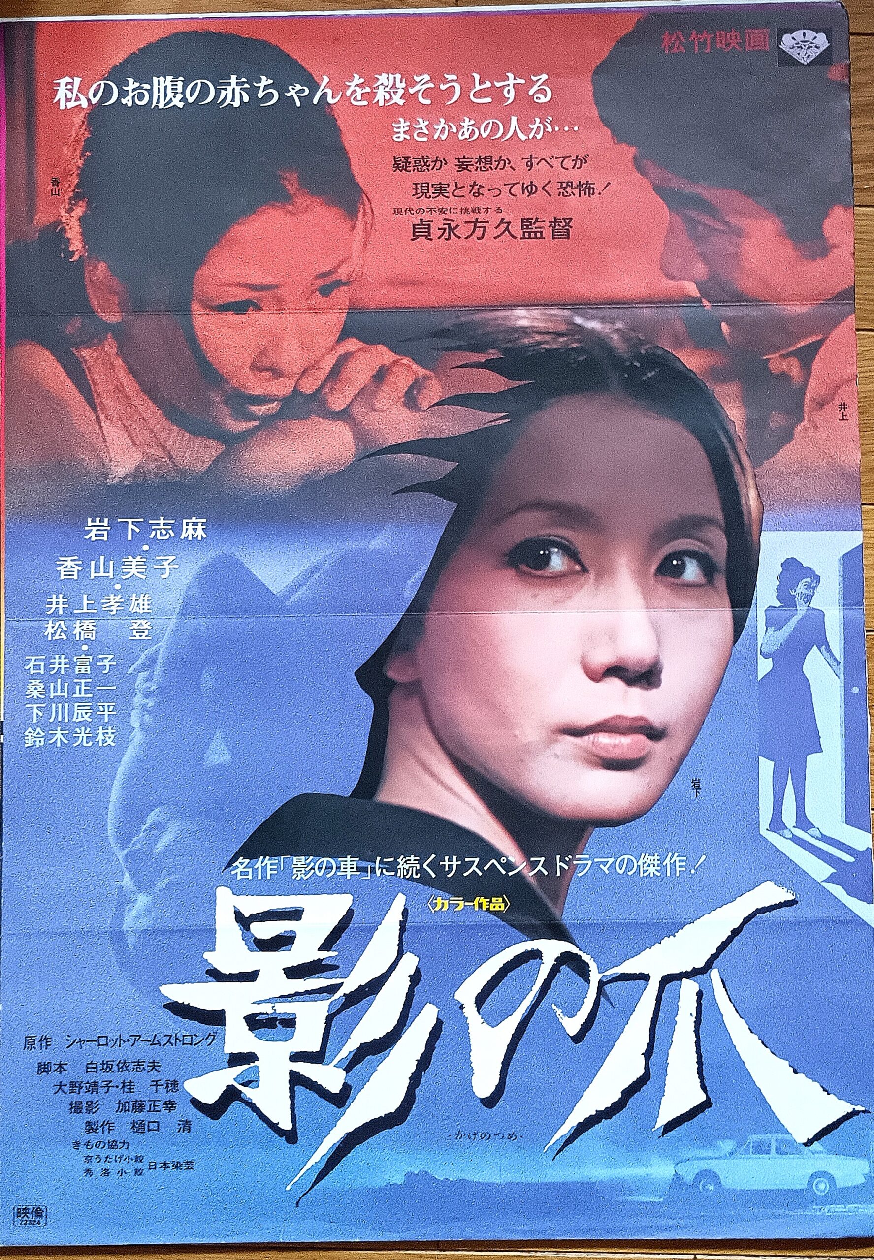 カゲノツメ/原作:シャーロット・アームストロング「あほうどり」。音楽:池野成。監督:貞永方久。交通事故の被害者と加害者の同居生活という異常な状況、そして、幸福な家庭を守ろうとする女と、それを壊そうとする女の凄まじい葛藤を描く。悪女である岩下志麻が交通事故の被害者遺族になったことをきっかけに、若夫婦の家を乗っ取りにかかる。そして夫もそれを徐々に受け入れてしまい妻の正気が壊されてゆくという物語。深夜、酔っている夫・明(井上孝雄)を乗せて四方信子が(香山美子)が雨降りの国道を家へと車を走らせていた。路上に人影を見てブレーキを踏むが間に合わず、引き殺してしまう。明は社宅を追い出された道子親子を部屋が見付かるまでと家へ引き取る。加害者と被害者とが同居するという奇妙な生活で明(井上孝雄)は妻信子(香山美子)とは違う魅力の道子(岩下志麻)に魅かれる。やがて隠れて関係を持つようになる。道子の態度に不信を覚えていた信子は、ある日、辻と知り合いだという青年大野甲介(松橋登)から以外な事実を知らされた。信子が事故を起こした日、道子が大野の車を無断で使い、他の車にぶっつけて逃げたというのである。信子は道子がその車で泥酔状態の辻を計画的に国道に放り出した、と推理する。信子は道子がその車で泥酔状態の辻を計画的に国道に放り出した、と推理する。このことを明に話しても、明は取り合わないどころか、ある夜、信子は、明と道子の抱擁を見てしまった。翌日、信子は甲介に道子が辻を運んだと証言してほしい、と頼むが、信子の体が狙いの甲介は突然襲いかかった。驚愕した信子は咄嗟に洋ハサミで甲介を刺し殺してしまう。事件のショックと流産のショックが重なって自閉状態になった信子は精神病院に。主婦気取りになった道子と明が信子を見舞いに来た。暗い独房の隅で信子はうずくまっていた。その帰り道、二人の乗った車が工事中の道でブルドーザーに激突。ギザギザに破れたフロントガラスから血まみれの二人の顔が突き出し、流れる血が雨に洗い流されていく。まるで怪談話。1972年9月9日~22日豊橋松竹、併映「黒の奔流」「喜劇満願旅行」。【サイズ:B2ポスター】