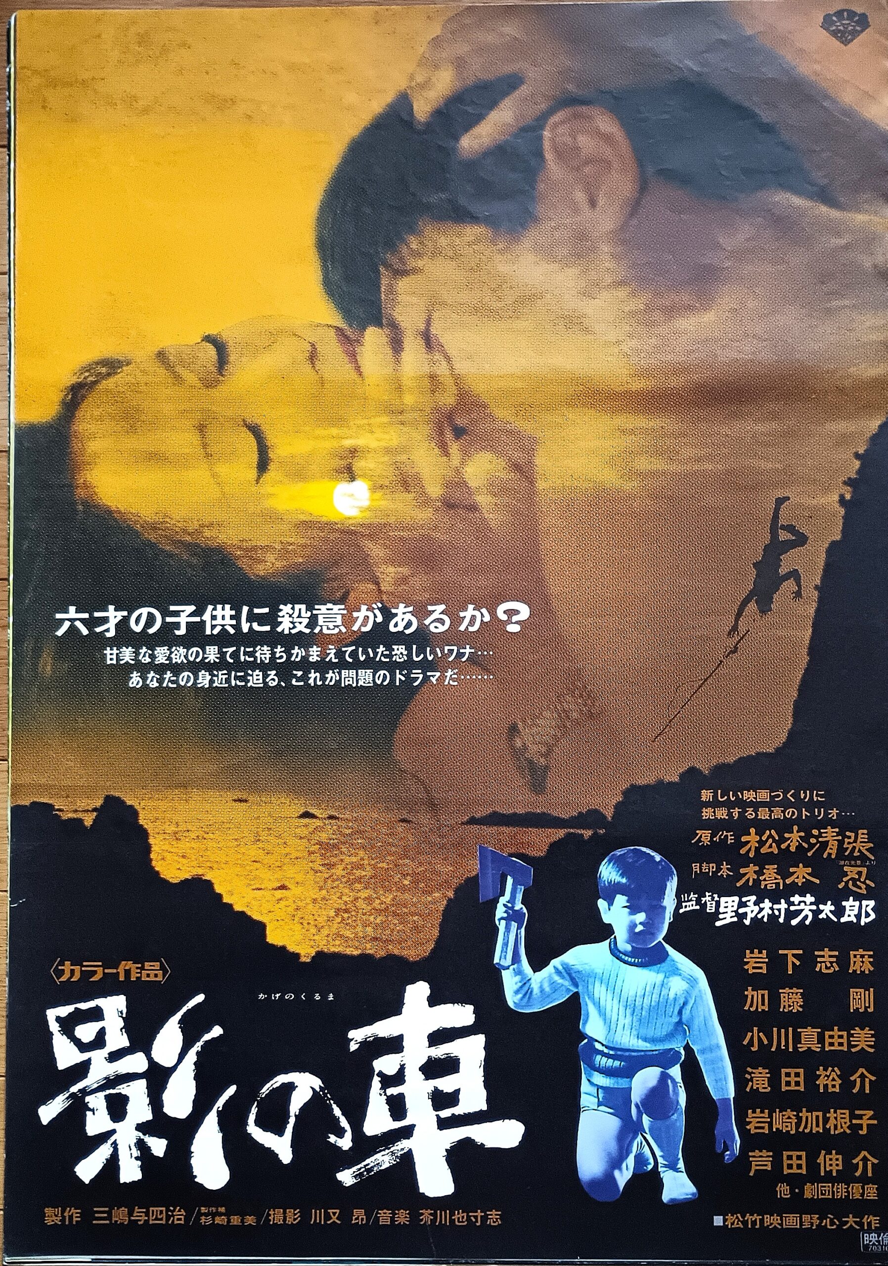 カゲノクルマ/原作:松本清張。脚本:橋本忍。音楽:芥川也寸志。監督:野村芳太郎。加藤剛主演。松本清張の原作小説を映画化したサスペンス。愛人の連れ子に殺されるという幻想に悩まされる男が、日常のささいな出来事から次第に恐怖を増幅させていくさまを描く。監督、脚本は「張込み 」「ゼロの焦点 」「砂の器」など清張作品の映画化に定評のある名コンビ野村芳太郎と橋本忍。旅行案内所に勤める浜島幸雄(加藤剛)は、ある日偶然に幼なじみの小磯泰子(岩下志麻)と再会する。浜島は既婚者で、一方の泰子は数年前に夫を亡くし、6歳の息子・健一と二人暮らしだった。やがて浜島は泰子と結ばれるが、自分になつかない健一の存在が気になり始める。浜島にも幼い日に夫を失った母と伯父との間に立たされた忘れ得ぬ記憶があったから健一の反感が必要以上に応えた。健一が自分を殺そうとしている突飛な幻想に悩まされはじめた。一度は妻と別れて泰子と結婚しようと決心しながら、健一のことを考えるとまた泰子を諦らめようかと思い悩む。空閨を癒やされた泰子は妻啓子(小川真由美)への後ろめたさも、浜島を見る健一の白い目にも心を向けず、ひたすら愛欲の歓びに溺れた。紅葉のころ、浜島苦心のドライブ旅行も小さな健一の本能的な男性にはね返される。浜島は再び幻影の虜になった。宿命というには、余りにも似かよった浜島自身の幼年期の体験。あの時のように俺は健一に殺される。泰子は浜島のノイローゼを笑いで一蹴した。しかし浜島が健一の首をしめてしまった。1970年6月13日~30日豊橋松竹、併映「喜劇男は愛嬌」。1970年8月19日~25日松竹シネマ、併映「日本一のヤクザ男」。1971年4月21日~27日豊橋松竹、併映「心中天網島」「愛奴」。1971年12月18日~28日豊橋松竹、併映「内海の輪」「黒の斜面」。【サイズ:B2ポスター】【年代:1970年】