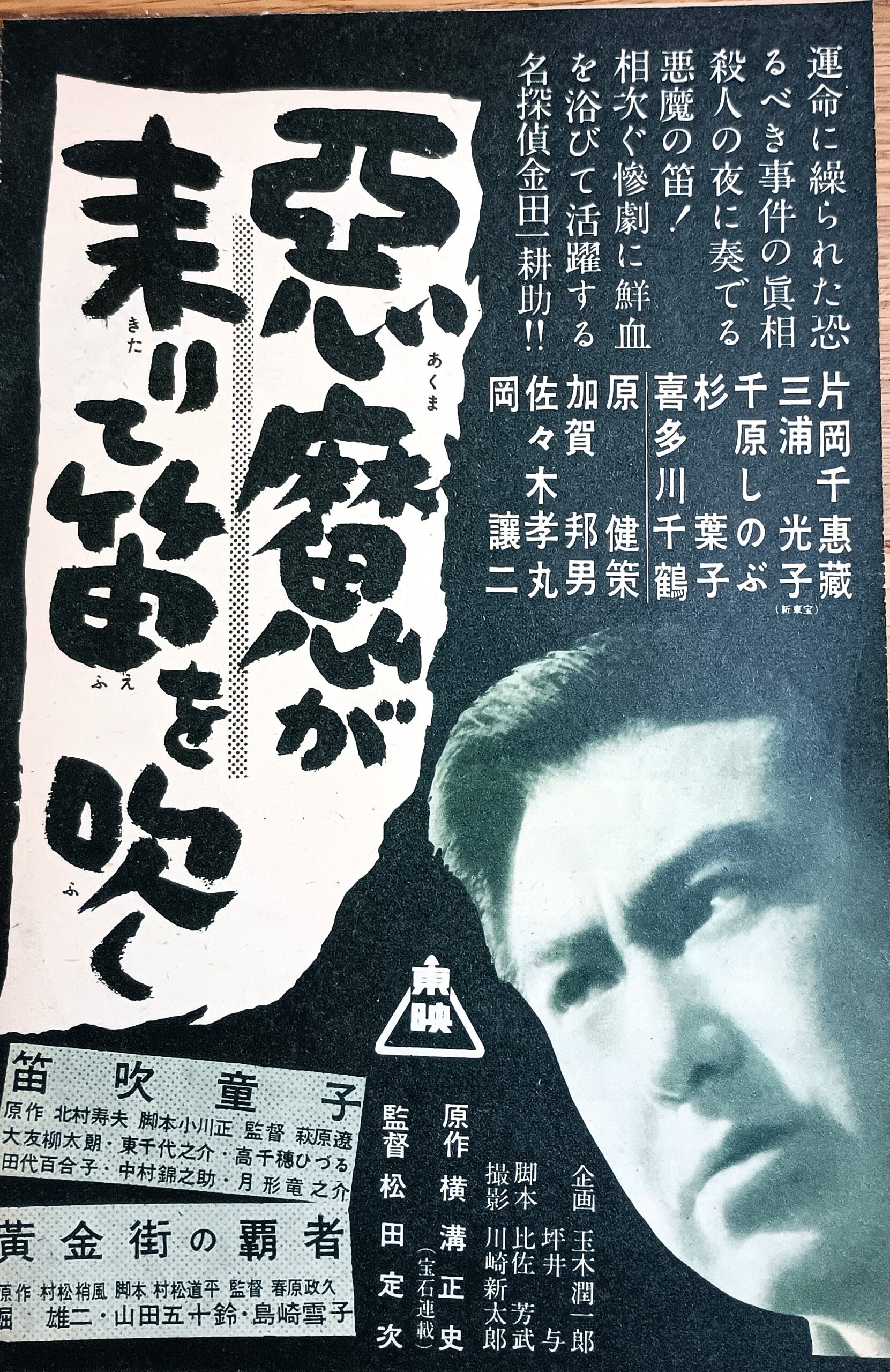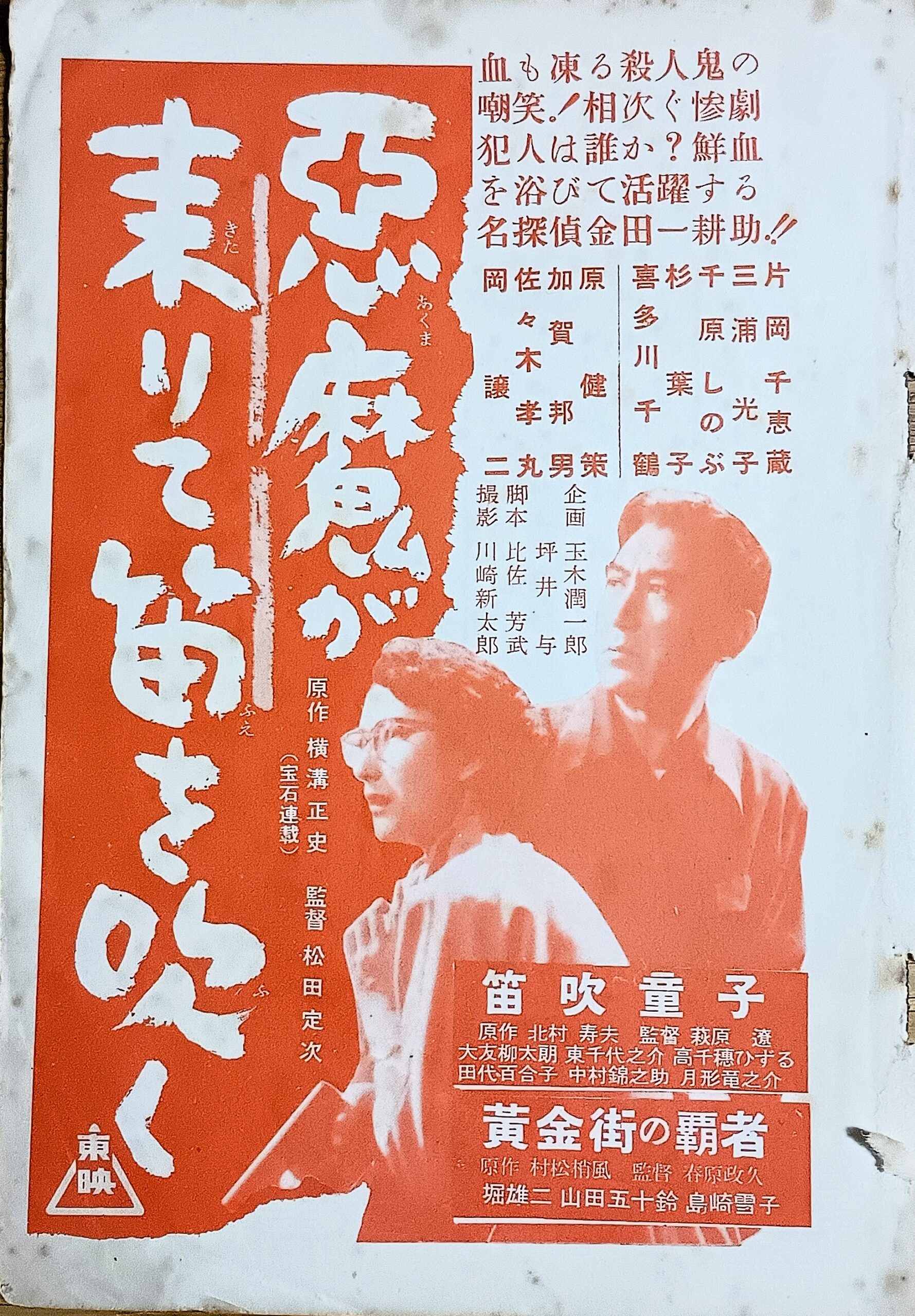 アクマガキタリテフエヲフク/原作:横溝正史。音楽:深井史郎。脚本:比佐芳武。助監督:松村昌治。監督:松田定次。東映の重役スター片岡千恵蔵が金田一耕助を演じるシリーズ第4作。長らくフィルムが所在不明となっていたが2024年2月に山口直孝によって発見された幻の16ミリ作品でフィルムは劣化が激しかったことからクラウドファンテインで資金調達、東映ラボ・テックにより修復とデジタル化が行われ、2025年1月26日に丸の内TOEIにて復刻披露上映会が開催された貴重な作品。事件の発端は昭和25年1月に起きた天銀堂の10名大量毒殺事件。当時、捜査の中で容疑者の一人としてあがった元子爵の椿英輔(高田稔)はその嫌疑を恥辱とし三ヵ月後に自殺。その後、金田一耕助の前に椿の令嬢美弥子(杉葉子)が現れ、母の燁子(三浦光子)が未だに英輔の影に怯えているので助けて欲しいと訴える。英輔の不気味な遺書を読んだ金田一は捜査に乗り出す。冒頭金田一の秘書白木静子(千原しのぶ)が事件のあらましを語る場面から始まる。目賀博士(佐々木孝丸)は英輔に[火禾]子の行状を告げて自殺に追い込み、その亡霊の恐怖を利用して玉虫伯爵、利彦、お駒、[火禾]子と次々に殺害した。耕助の推理と植辰(吉田義夫)や船長(山口勇)の証言に、目賀博士は拳銃を取って乱射するが、耕助の反撃に挫け、遂に警官に逮捕される。警視庁等々良警部に岡譲二。豊橋では1954年のゴールデンウィーク公開で併映が「笛吹童子第1部」だった事もあり大ヒット。25年後の1979年に西田敏行主演でリメイク。1954年4月27日~5月2日豊橋第一東映、併映「笛吹童子第1部どくろの旗」 西部劇「テキサスより来た男」。【サイズ:B5キネマ旬報広告&雑誌シナリオ内広告】【年代:1954年】