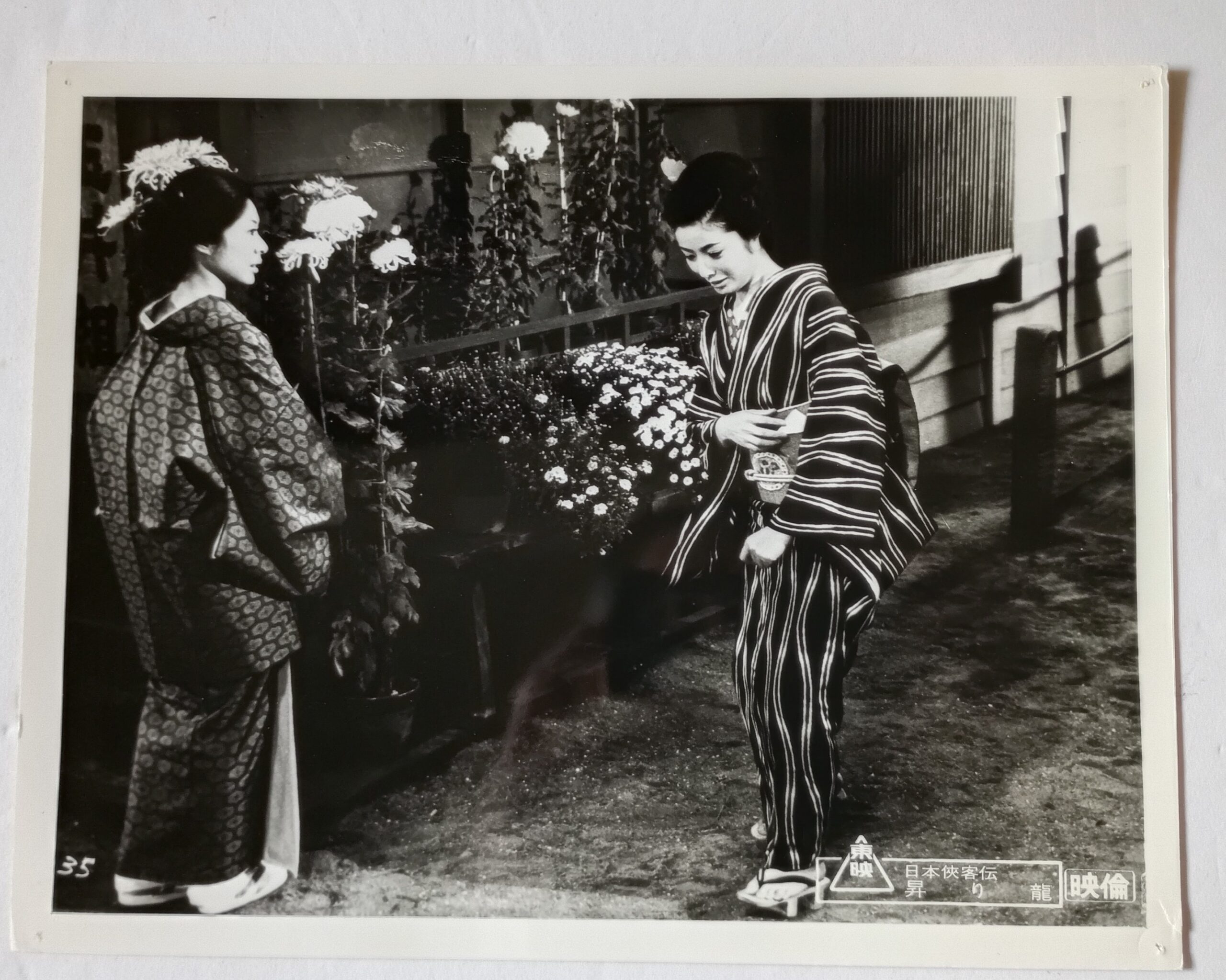 ニホンキョウカクデン ノボリリュウ/原作:火野葦平。脚本:笠原和夫。監督:山下耕作。日本侠客伝シリーズ第10作は前作に続き玉井金五郎「花と龍」の戦後5回目の映画化。原作を離れて時代が昭和初期に変更、沖仲仕組合創立に絡み大親分吉田磯吉(片岡千恵蔵)との交渉に刺青師お京(藤純子)が協力する。純子が健さんを想いながら病死する場面が秀逸。お京とマン(中村玉緒)と金五郎の三角関係を刺青が物語る。二つの組が激突する風雲の洞海湾。ゴンゾ衆の生活向上を願う石炭仲仕の小頭玉井金五郎は小頭組合を結成しようと運動するが、それが共同組幹部の友田(天津敏)の怒りに触れた。共同組の幹部に襲われ深手を負った金五郎を救ったのは、浅草の女刺青師お京(藤純子)だった。瀕死の金五郎を匿い看病を続けるお京は、金五郎の体に一生一代の刺青「昇り龍」を彫り込む。金五郎が若松に帰るとパナマ船荷役をめぐる抗争が待ち構えていた。友田の喧嘩状を受けた金五郎は一人で決闘場へ行く。お京は、金五郎と友田の決闘の仲裁を若松の女親分島村ギン(荒木道子)に願い出る。それから数年、時代は昭和。お京は胸を患い浅草で隠棲していたが自分の命が限られているのを知り、金五郎に一目会いたいと若松へ。若松では炭積機の導入に失業ゴンゾが急増。金五郎は転業資金の援助を荷主組合に根強く交渉したが友田と激しく対立する。島村ギンと小倉の元博徒島崎勇次(鶴田浩二)の勧めで金五郎は市民大会を開くが、その会場を友田と栗田(諸角啓二郎)一家が襲った。島崎は栗田を叩き斬るが、島村ギンは刺され、愛用の拳銃を金五郎に残して息を引き取る。友田の圧力は益々激化し、ゴンゾたちが次々と殺されていく。堪忍袋の緒を切った金五郎は、友田の事務所に斬り込む。殺到する幹部たちを蹴散らし、金五郎の白刃が友田に迫ったその時、間に割って入った代議士吉田磯吉(片岡千恵蔵)が、金五郎の申し出を引き受け力になろうと約束。金五郎は武蔵野温泉に療養するお京を訪ねた。お京は残された力をふりしぼって金五郎の背に朱色のお京の文字を彫り込むと胸にすがって慟哭。静かに目を閉じるお京。二人の後ろ盾となる博徒に鶴田浩二。マンに中村玉緒、大親分吉田磯吉に片岡千恵蔵、お京に想いを寄せる一匹狼に伊吹吾郎、女親分に荒木道子、ほかに遠藤辰雄、天津敏が脇を固め、多彩な人物像がダイナミックに競う任侠映画大作。1970年12月3日〜17日豊橋東映、併映「ずベ公番長東京流れ者」。1971年4月21日〜27日松竹シネマ、併映「喜劇ソレが男の生きる道」【サイズ:B2ポスター&スチール写真】【年代:1970年】