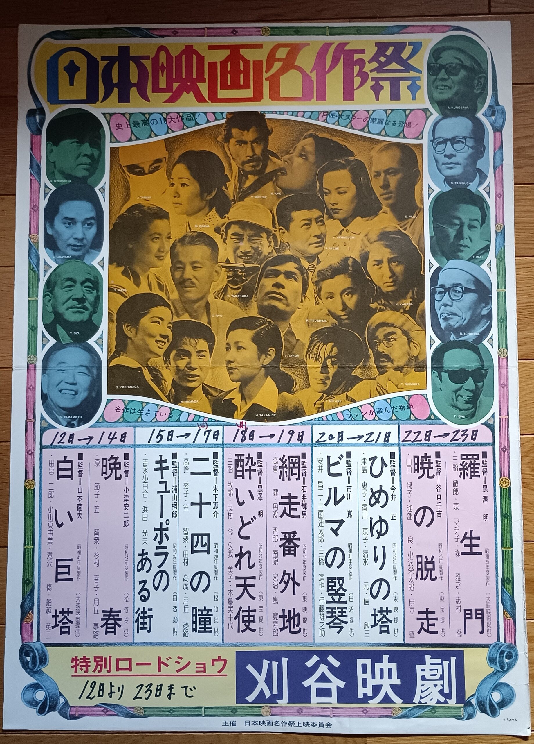 二ホンエイガメイサクサイ/1975年から1977年まで3回開催されたアーカイブ映画祭。松竹、東宝、東映、日活、大映の5社が共同で過去の名作を上映するというもの。各社10作品の候補作を提示して、その中からアンケートにより各社2本づつ選出し、2本立て3日間替わりで15日間上映するというもの。東京では丸の内松竹で開催、3万人以上を動員する大ヒットとなり、新宿、上野等でも2次上映。また大阪、神戸、札幌、広島、京都、名古屋等々で順次上映されて愛知県でも公開された。1975年は阪東妻三郎23回忌記念で阪東映画祭も開催されて日本映画の回顧ブームの年であった。このヒットを受け第2回、第3回と開催されたがだんだんとしぼんでいった印象。主体となった若い観客の熱が冷めてきたということもあると思いますが、上映作品自体がアピール力がなくなって来た。黒沢明、木下恵介、今井正、今村昌平、山本薩夫が毎回登場ですが、小津は一回だけ、溝口、成瀬に至っては一回も無し。日本映画名作祭は第3回で終了し日本映画娯楽大作祭に引き継がれるがこれも1回で終了。ポスターは刈谷映劇で1975年12月12日~23日まで開催された当時もの。因みに阪妻映画祭は豊橋でも上映された。2日交替で10本上映。1975年11月8日~14日松竹ロキシー【サイズ:B2ポスター】【年代:1975年】