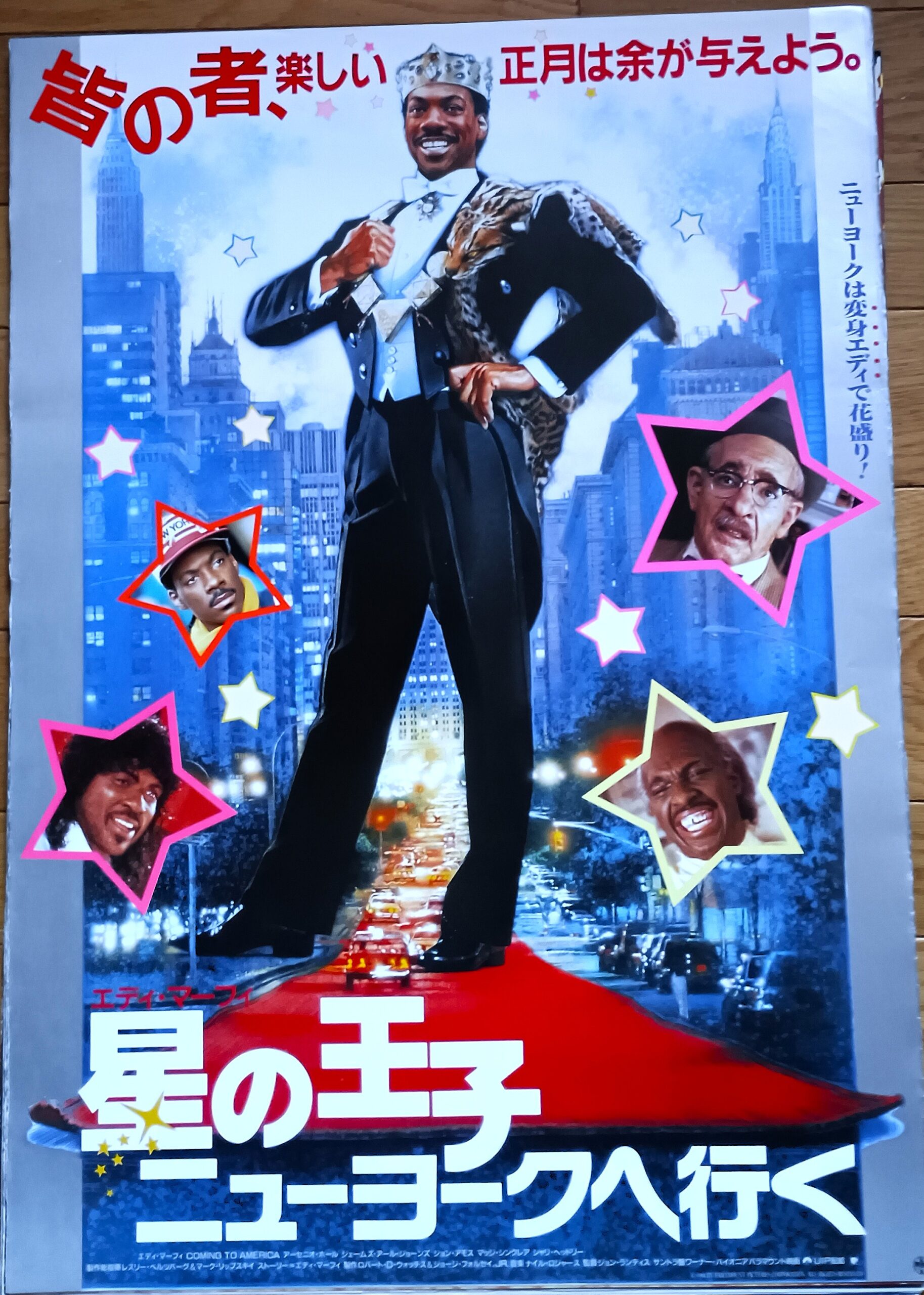 ホシノオウジニューヨークヘイク/音楽:ナイル・ロジャース。監督:ジョン・ランディス。エディ・マーフィ主演のコメディ。理想の花嫁を求めてニューヨークへやってきたアフリカのとある王国のプリンスの巻き起こす一大騒動を描くコメディ映画。マーフィとアーセニオ・ホールが、リック・ベイカーの特殊メイクにより、それぞれ1人4役を務めている。アフリカにあるザムンダ王国の若き王子アキームは、国王が決めた女性ではなく、自分自身で結婚相手を探すため、友人で世話役のセミとともにニューヨークを訪れた。クイーンズの安ホテルに滞在することを決めたアキームは、チャリティーイベントで出会ったリサに一目ぼれ。彼女の父親が経営するハンバーガーショップに、留学生と身分を偽りアルバイトとして働くことにする。リサには金持ちの婚約者がいるが、彼女はアキームの誠実さに心惹かれていく。冒頭タイトルのパラマウントマークの山をカメラが進んで越えるとエディ・マーフィのお国の風景が広がる場面は面白い。マーフィの絶頂期の映画でヒット。1988年12月17日~1989年1月17日、広小路スカラ座2、併映「3人のゴースト」。【サイズ:B2ポスター】【年代:1988年】