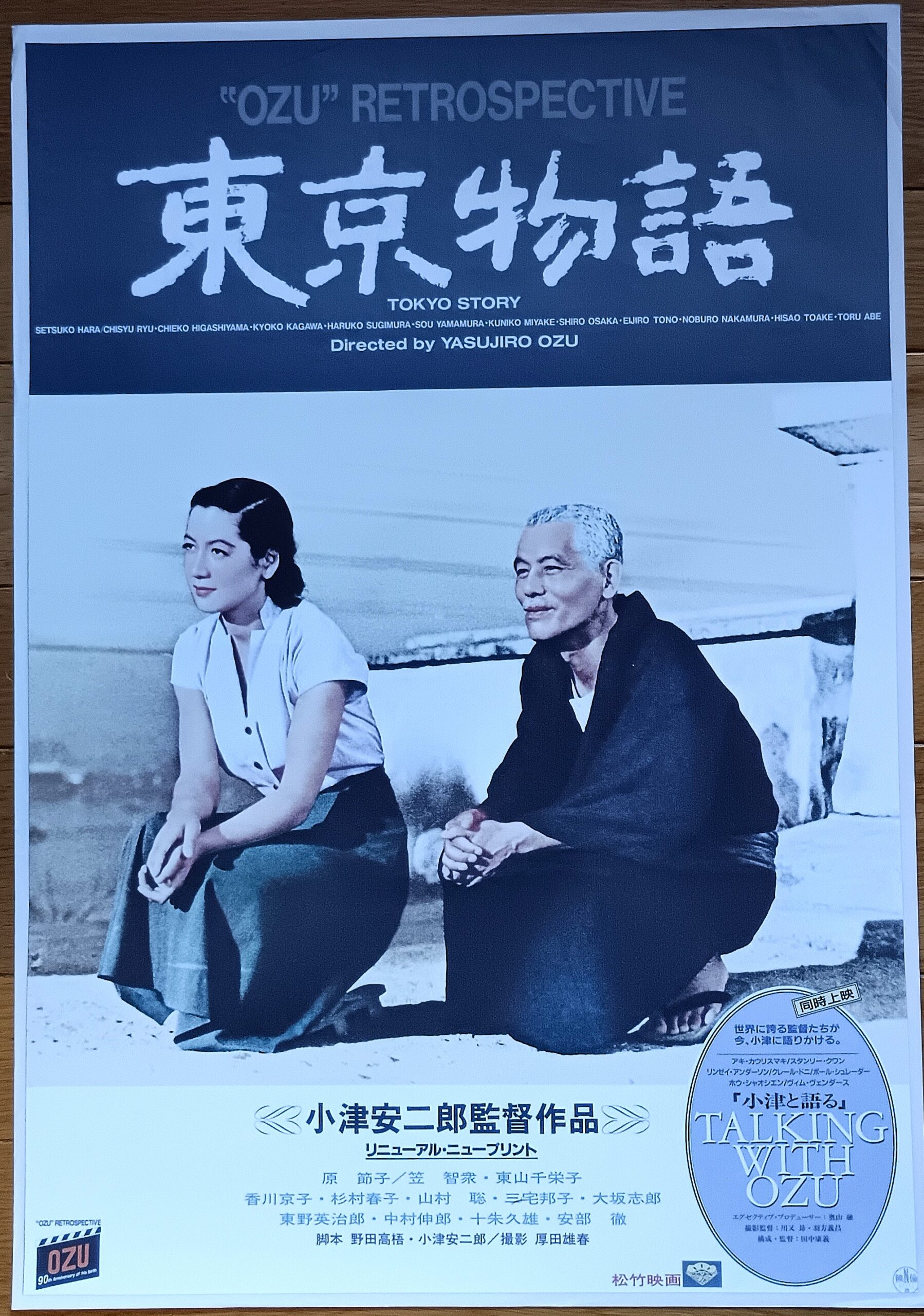 トウキョウモノガタリ/脚本:野田高梧、小津安二郎。音楽:斎藤高順。監督:小津安二郎。原節子主演。日本映画を代表する傑作。巨匠・小津安二郎監督が、戦後変わりつつある家族の関係をテーマに人間の生と死までをも見つめた深淵なドラマ。故郷の尾道から20年ぶりに東京へ出てきた老夫婦(笠智衆と東山千栄子)。成人した子どもたちの家を訪ねるが、みなそれぞれの生活に精一杯だった。唯一、戦死した次男の未亡人(原節子)だけが皮肉にも優しい心遣いを示す。家でひとり侘しくたたずむ笠智衆を捉えたショットは映画史上に残る名ラスト・シーンとして名高くキネマ旬報オールタイムベストテン第1位として世界中の映画作家に影響を与える。昭和を象徴する作品でローポジションやカメラの固定といった“小津調”と形容される独自の技法で、親子の関係を丁寧に描き出す。主演の原節子は、1920年生まれで戦前からの大スターで当時は33歳、1963年東宝「忠臣蔵」を最後に小津監督死亡でそのまま引退。小津監督は女優原節子の才能を高く認め自作に多く主演に採用するが、実は山本薩夫監督とのコラボが最多の7本で次に小津監督の6本。テレビドラマでも1982年6月NHK「新東京物語」で大友柳太朗と長岡輝子、2002年7月東海テレビ「東京物語」宇津井健と八千草薫などリメイク多数。作品論も多数出版されているのでここでは語らない。1953年11月4日~10日豊橋松竹、併映「七彩の花吹雪」。1953年11月11日~17日豊橋松竹、併映「東京マダムと大阪夫人」。1954年10月27日~11月2日豊橋千歳劇場、併映「ウッカリ夫人とチャッカリ夫人」。2004年第3回、2024年第23回の2回とよはしまちなかスロータウン映画祭で上映。【サイズ:B2ポスター&A2サイズ】【年代:1953年】