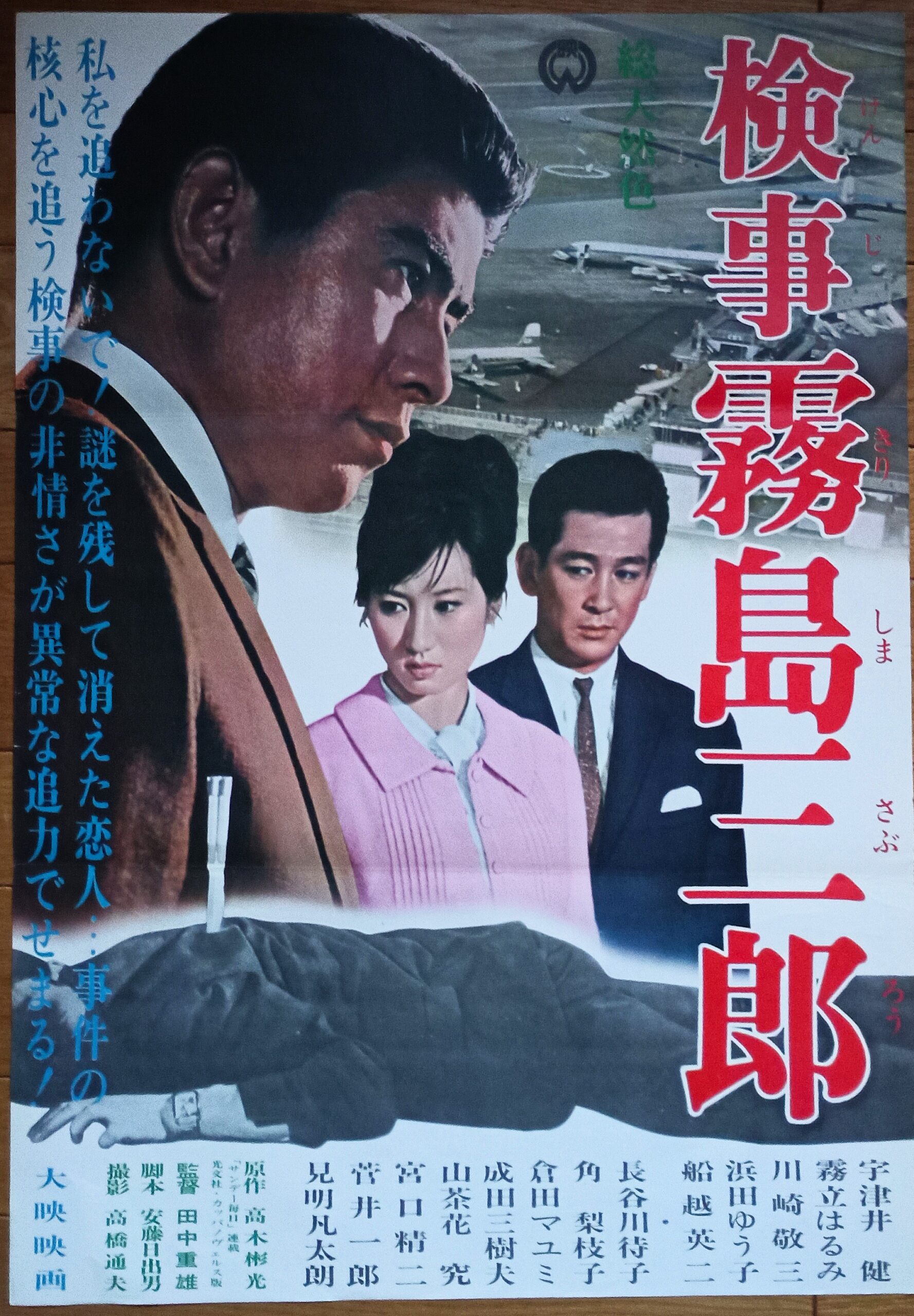 ケンジキリシマサブロウ/原作:高木彬光。音楽:木下忠司。脚本:安藤日出男。監督:田中重雄。宇津井健主演の法廷サスペンス。検事霧島三郎(宇津井健)は、婚約者竜田恭子の父、弁護士の慎作(菅井一郎)がまきこまれた殺人事件の担当検事となった。事件は竜田の二号本田春江がアパートで絞殺死体で発見、犯人と目される竜田は麻薬を残したまま行方不明。春江の同僚、バー・ラムールの鹿内桂子から、竜田が戦時中救った中国人陳のつてで国外に逃亡したらしいと聞いた三郎は、翌朝桂子の死体を見て驚愕。その部屋から麻薬が発見された。ラムールの経営者でテキ屋の小林を調べた三郎は、小林が麻薬の常習犯であることをつきとめると、事件の自白を迫ったが、小林は殺しは謎の男三川庄介が知っていると言い関係を否定した。一方恭子は恋人同士でありながら、今では話も出来ぬ三郎の代りに、慎作の弟子寺崎(川崎敬三)の親切に頼っていた。寺崎は能力は有りながら弁護士になれず、私立探偵となっていた。恭子の兄慎一郎(成田三樹夫)は、グレて家を出ると榎本ふさ子(浜田ゆう子)と同棲し、友人の須藤の手びきで麻薬を覚えていた。寺崎に導かれて独自で慎作の跡を追う恭子に不安を覚えた三郎は、すぐ神戸に向った。その夜、伊丹空港で出会ったラムールのホステス安藤澄子(長谷川待子)に誘われた三郎は、澄子のアパートで、澄子と二人で浴室に入ったところを、何者かに盗みどりされた。黒メガネの男は三郎に、麻薬ルートの検挙とひきかえにフィルムを渡すと脅迫した。この男こそ、三川庄介(夏木章)であった。寺崎からの連絡で神戸に来た恭子はシルバーホテルで、寺崎を待っていた。その頃神戸県警では拘置された三川が、竜田事件は麻薬には関係なく、竜田家の財産めあてだと重大な証言をしていた。三郎の頭に一つの謎が解けて来た。竜田家の事情を知り、積極的に動いている男、寺崎の正体は何か。出世にのり遅れた寺崎は、病弱な慎一に、自分の愛人榎本ふさ子をつけ、恭子を殺して、財産乗っ取りを企んでいた。そして、麻薬の買入となって春江、鹿内を知った寺崎は二人を巧みに利用して、この犯罪を計ったことが判明する。1964年11月28日~12月8日広小路豊橋大映、併映「博徒ざむらい」。【サイズ:B2ポスター】【年代:1964年】