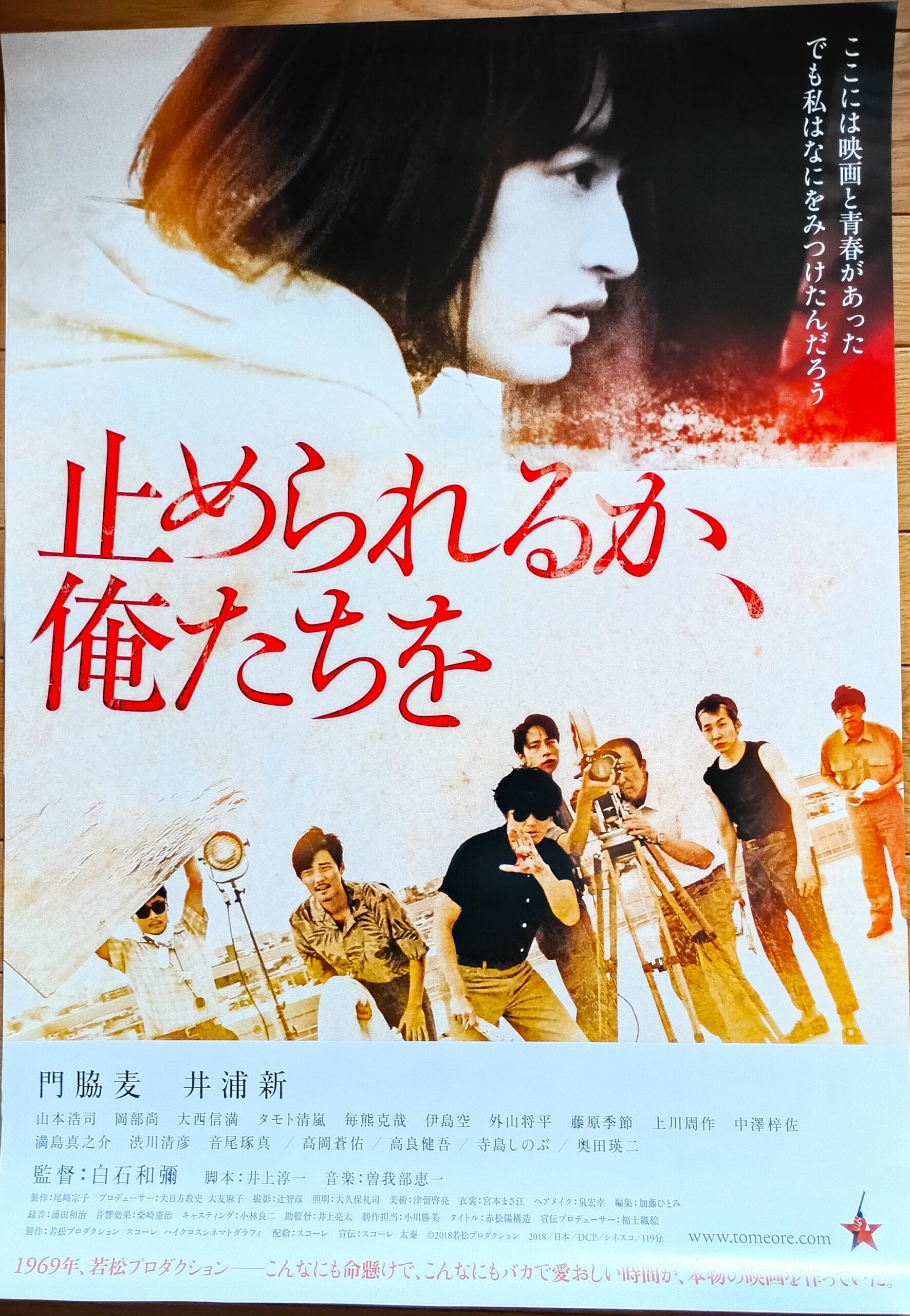 トメラレルカ、オレタチヲ/脚本:井上淳一。音楽:曽我部恵一。監督:白石和弥。2012年10月に急逝した映画監督・若松孝二の伝記ドラマ。1960年代末を舞台に、彼のプロダクションに飛び込んだ女性の視点から、映画に全てをささげる若松孝二と仲間たちの青春を浮き上がらせる。メガホンを取るのは、若松プロダクション出身で『孤狼の血』などの白石和彌。『愛の渦』などの門脇麦、『11・25自決の日 三島由紀夫と若者たち』などの井浦新、『ラバーズ ~覆う女~』などの山本浩司をはじめ、岡部尚、大西信満、タモト清嵐、毎熊克哉らが顔をそろえる。1969年、何者かになりたいと強く願っていた吉積めぐみ(門脇麦)は、映画監督の若松孝二(井浦新)に師事しようと、原宿セントラルアパートにある若松プロダクションの門をたたく。彼女は、磯貝一(柴田鷹雄)、沖島勲(岡部尚)、秋山道男(タモト清嵐)、伊東英男(西本竜樹)、足立正生(山本浩司)、小水一男(毎熊克哉)らと一緒に映画制作に没頭する。実在の映画人が多数登場。2018年10月13日公開だが豊橋では未公開。2026年第24回とよはしまちなかスロータウン映画祭で上映。主演の井浦新さんゲストのシネマ&トークで「ワンダフルライフ」と共に豊橋初公開。井浦さんゲストの見所解説を転載「毎回著名なゲストをお招きして幕開けする「とよはしまちなかスロータウン映画祭」も第24回となりました。今回は、俳優 井浦新さんをゲストにお招きしてご出演作2本の上映とトークでのオープニングです。「スロータウン映画祭へお招きしたいゲスト」アンケートには常に登場する井浦新さん、映画を中心にドラマ・ナレーション・モデルなど様々な分野で活躍されています。過去の映画祭では2022年第20回映画祭で「朝が来る」を上映、今回の映画祭でも「ラストマイル」を上映します。井浦新さんといえば幅広い演技で定評があり、2013年若松孝二監督「11・25自決の日三島由紀夫と若者たち」で日本映画プロフェッショナル大賞主演男優賞、映画「かぞくのくに」でブルーリボン賞助演男優賞を受賞。その他の映画では「ピンポン」「実録・連合赤軍 あさま山荘への道程」、「光」「ニワトリ☆スター」「福田村事件」など80本以上に出演。大河ドラマ「平清盛」、ドラマ「返還交渉人~いつか、沖縄を取り戻す~」、連続テレビ小説「なつぞら」、Eテレ「日曜美術館」の司会、2024年大河ドラマ「光る君へ」の藤原道長の長兄・藤原道隆を演じて国民的な人気を博しています。今回、豊橋のお客様に見て欲しい作品として井浦新さんご本人と相談し2本をセレクトしました。最初の映画は、井浦新さんの映画デビュー作で初主演した「ワンダフルライフ」(1999年)。当映画祭でも度々上映した是枝裕和監督の作品で、俳優として影響を大きく受けたエピソードの作品。2本目は、井浦新さんが実在した若松孝二映画監督に扮した話題作「止められるか、俺たちを」(2018年)の2本上映。両作品を通じて井浦新さんの「表現者としての魅力」をスクリーンでお楽しみ下さい。上映後のトークで更に映画の魅力を深めて頂けることでしょう。ホワイエでは井浦新さんご出演ポスターを並べて皆様をお迎えします。まちなかで人々が集い、楽しみ、交流する、そんな空間としての「スロータウン映画祭」、皆様のご来場をスタッフ一同お待ちしております。」【サイズ:B2ポスター&映画祭井浦新さん写真】【年代:2018年】