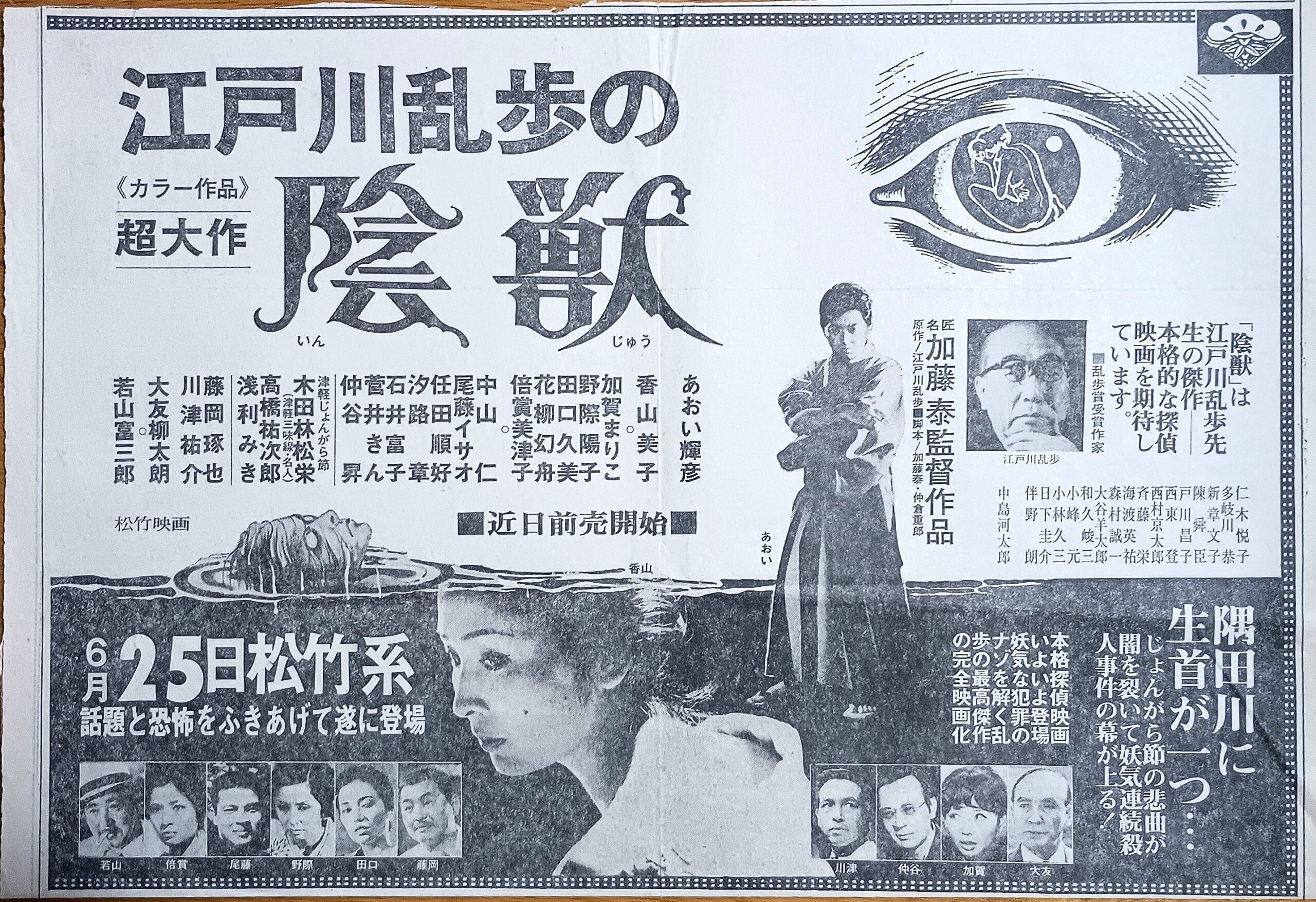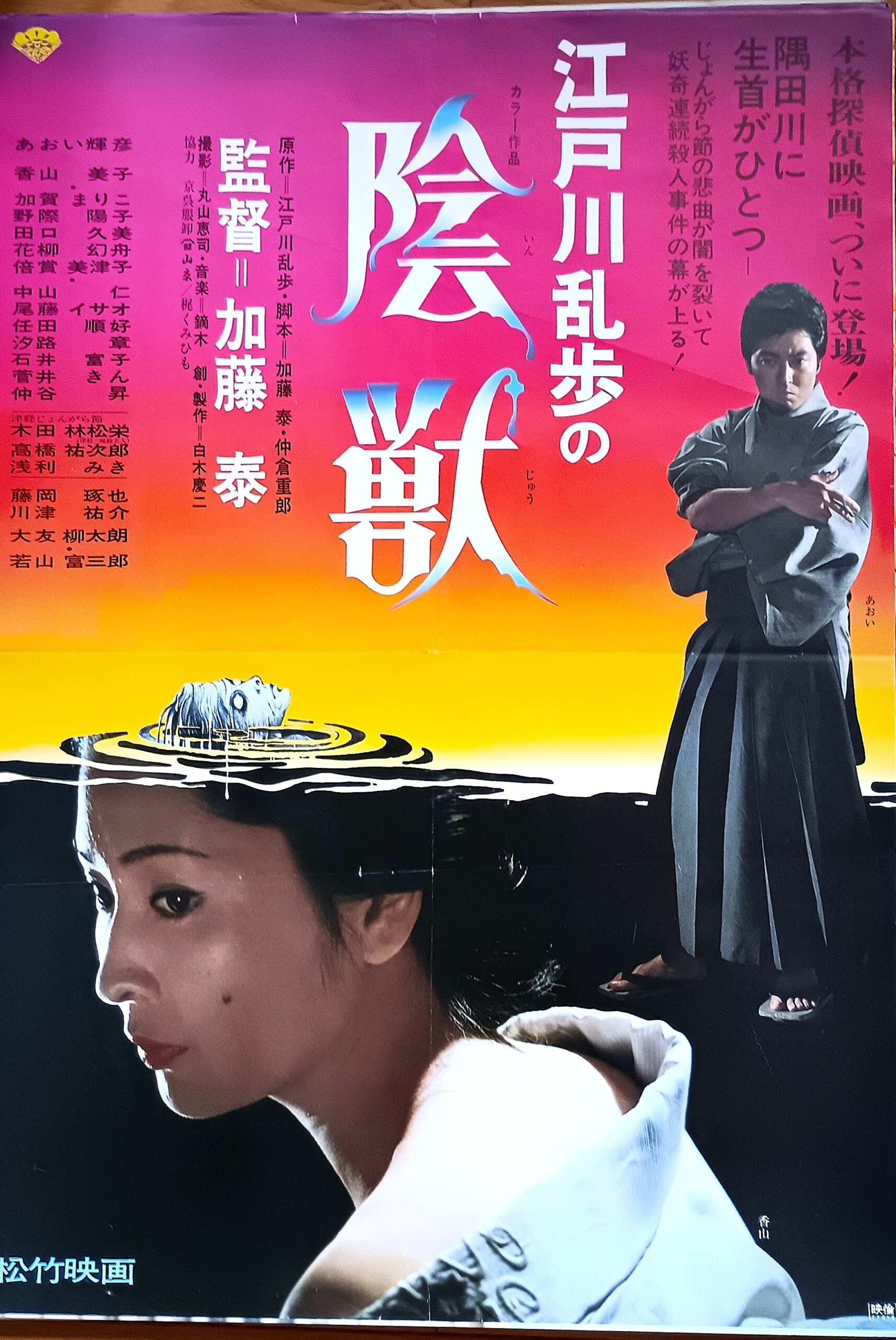 エドガワランポノインジュウ/原作:江戸川乱歩。脚本:加藤泰、仲倉重郎。音楽:鏑木創。監督:加藤泰。江戸川乱歩原作「陰獣」の映画化。本格派推理小説家にあおい輝彦が扮して殺人事件の謎ときを描くサスペンス。脚本は「竹久夢二物語 恋する」の加藤泰と「憧憬 あこがれ」の仲倉重郎の共同、監督は「明治侠客伝三代目襲名」「緋牡丹博徒お竜参上」の加藤泰。推理小説家の寒川に、彼のファンだと言って近づく、うなじに赤いミミズ腫れのある人妻・小山田静子(香川美子)。彼女は寒川に、自分は変格派推理小説家で、初恋の相手でもあった大江春泥から脅迫されていると訴えた。寒川は自分が一番軽蔑している春泥の名をききこの事件に興味をいだく。脅迫状には、静子と夫の夜の秘事まで完ぺきな観察記録があり、闇にひそむ陰獣のような目に静子は恐れていた。物音がしたという小山田邸の天井裏を探ってみると這い回った跡があり飾りボタンが一つ。寒川は春泥の足どりを追いかけた。寒川の担当記者でただ一度だけ春泥と面識のある本田(若山富三郎)は、浅草でピエロ姿の春泥を見たといい出したが、全く彼の足どりはつかめず。静子に第二の脅迫状が届き、その予告通り、静子の夫、小山田六郎(大友柳太朗)が隅田川船着場に溺死体で浮び上がる。六郎の通夜の席に顔を出したヘレン・クリスティに寒川はどうも腑に落ちなかった。そんなある日、ヘレンは寒川をホテルへ誘い、自分を鞭で打ってくれと懇願する。その時寒川はヘレンが天井裏で見つけた、ボタンと同じもののついた手袋を持っていることを知る。それは、六郎が英国出張中に二人で対で買ったもので、彼女が六郎の英国での情人であった証拠。寒川は、このヘレンのマゾヒズムの喜びと、六郎の部屋にあった乗場鞭、そして静子のうなじのミミズ腫れを思い出し、静子を責めるだけでは満足できなくなった六郎が一連の脅迫犯人であり死亡したものではないか、と推理。本田が見た春泥は彼の本の奥付けについている写真とは違う人物なのだ。この頃、寒川と静子はとある土蔵を借りて愛欲の日夜を送る関係になっていた。ある日、歌舞伎役者の市川荒丸(川津祐介)が殺された。彼こそが自分が会った春泥だ、と本田は言った。小山田家の運転手が六郎からボタンが欠けたまま昨年11月に貰ったという手袋が天井裏のものと同一であることが判明。春泥=六郎という寒川の推理は根底からくずれた。土蔵にもどると、そこでは静子が寒川にヘレンが彼に懇願した事と同じことを求めてきた。その時、寒川は、一連の事件は変格派春泥が本格派の自分に対し探偵作家としての挑戦で二重三重に仕組んだ巧妙な完全なトリックであると見抜き、春泥の正体は静子である事に気づく。SM要素のエロティックなミステリーで香山美子の代表作ともなるが、剣豪大友柳太朗の姿は何とも寂しい。1977年6月18日~7月1日豊橋松竹、併映「喜劇怪談旅行」。【サイズ:B2ポスター&新聞広告】【年代:1977年】