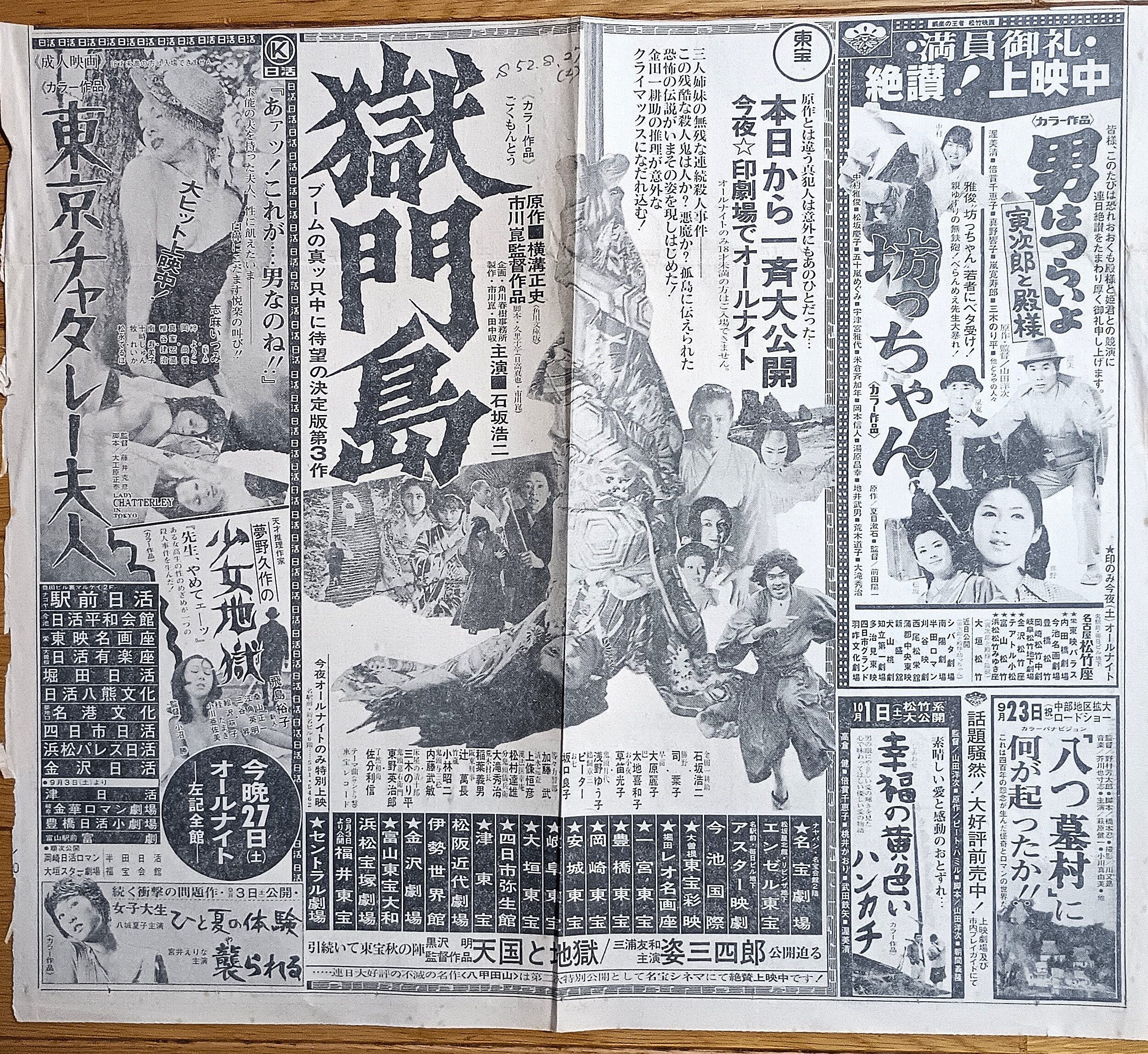 ゴクモントウ/原作:横溝正史。脚本:市川崑、日高真也。音楽:田辺信一。製作・監督:市川崑。石坂浩二の金田一耕助シリーズ第3作。前作「悪魔の手毬唄」から4か月で公開された。終戦直後の昭和二十一年九月下旬戦地から帰国の途中、引き揚げ船の中で死亡した鬼頭千万太の遺書を私立探偵・金田一耕助が友人から預り、獄門島の千光寺・了然和尚へ届けにきた。引き上げ船で死んだ男・鬼頭千万太。彼は戦友に「俺が島に戻らなければ妹たちが殺される!」という臨終の言葉を残していた。彼の遺書を預かった金田一は、その戦友に代わって獄門島と呼ばれる島を訪れるが、奇怪な連続殺人事件が発生して謎に挑む。死んだ嘉右衛門の妾で、いまは本鬼頭で女中のように働いている勝野が、三姉妹の着替えを終えた直後、三女・花子の姿が消えた。その夜、千光寺の梅の古木に自分のしめていた帯で逆さ吊りにされた花子の死体がみつかる。現場へ駆付けた千万太のいとこの早苗は、逆さ吊りにされている花子の懐から一通の封筒が落ちるのを見つける。それは、対立している分鬼頭家・儀兵衛の後妻・巴が、月代宛に書かせたものだった。千光寺に宿泊している金田一は、枕もとにある屏風に極門という雅号の男が書き写した、芭蕉の句が二枚、其角の句が一枚と、三枚の色紙が貼ってあるのを発見。「鴬の身をさかさまに初音かな」「むざんやな冑の下のきりぎりす」「一つ家に遊女も寝たり萩と月」。翌朝、金田一は、花子殺害の重要容疑者として清水巡査に逮捕され、留置場に入れられてしまった。その間隙をぬうようにして、無残な第二の殺人事件が起こる。次女の雪枝が、海に向って天狗の鼻のようにつきでた崖の上に置かれている千光寺の吊り鐘の中で死体で発見された。花子、雪枝の葬儀の夜、長女の月代までが、お小夜が使用した祈祷所の中で絞殺され、その死体には萩の花びらがふりまかれていた。岡山県警の等々力警部が指揮する捜査陣の努力もむなしく、犯人はみつからない。殺人事件の解決に苦しむ金田一耕助は、ふとしたことから極門こと鬼頭嘉右衛門が書き残した千光寺の屏風の色紙の三つの俳句の中から、意表をついた事件の糸口をつかむ。三つの殺人がすべて俳句の中の言葉を元に行なわれている。お小夜を憎んでいた嘉右衛門が臨終の時、自分の後継者は千万太であり、三人の娘を殺すようにと、俳句に意志を託し死んだ。そして、その時、勝野も話を聞いていたのである。和尚は千万太の通夜の晩、鵜飼が来ると花子をおだて、彼女を殺すと鬼頭家から千光寺へと死体を運んだのであった。第2、第3の殺人は絞殺であり、リュウマチの和尚にできるはずはなく、その犯人は勝野であると金田一は謎解きを続ける。豪華キャストでのミステリー。1977年8月27日~9月27日豊橋西武東宝。【サイズ:中日スポーツ新聞広告】【年代:1977年】