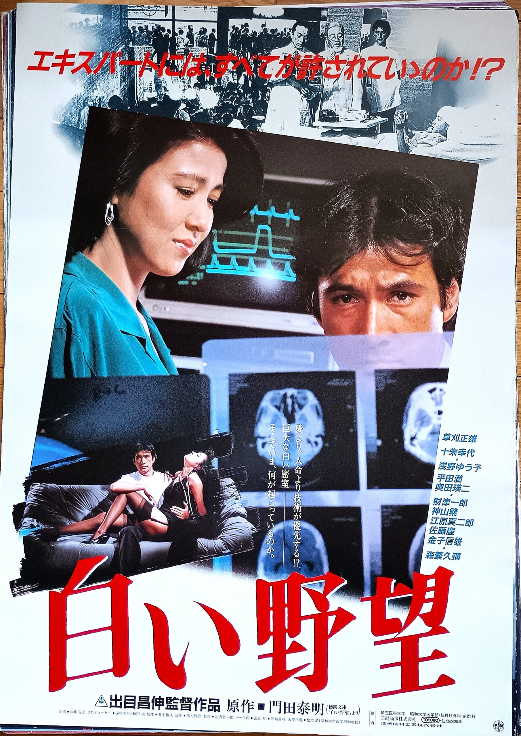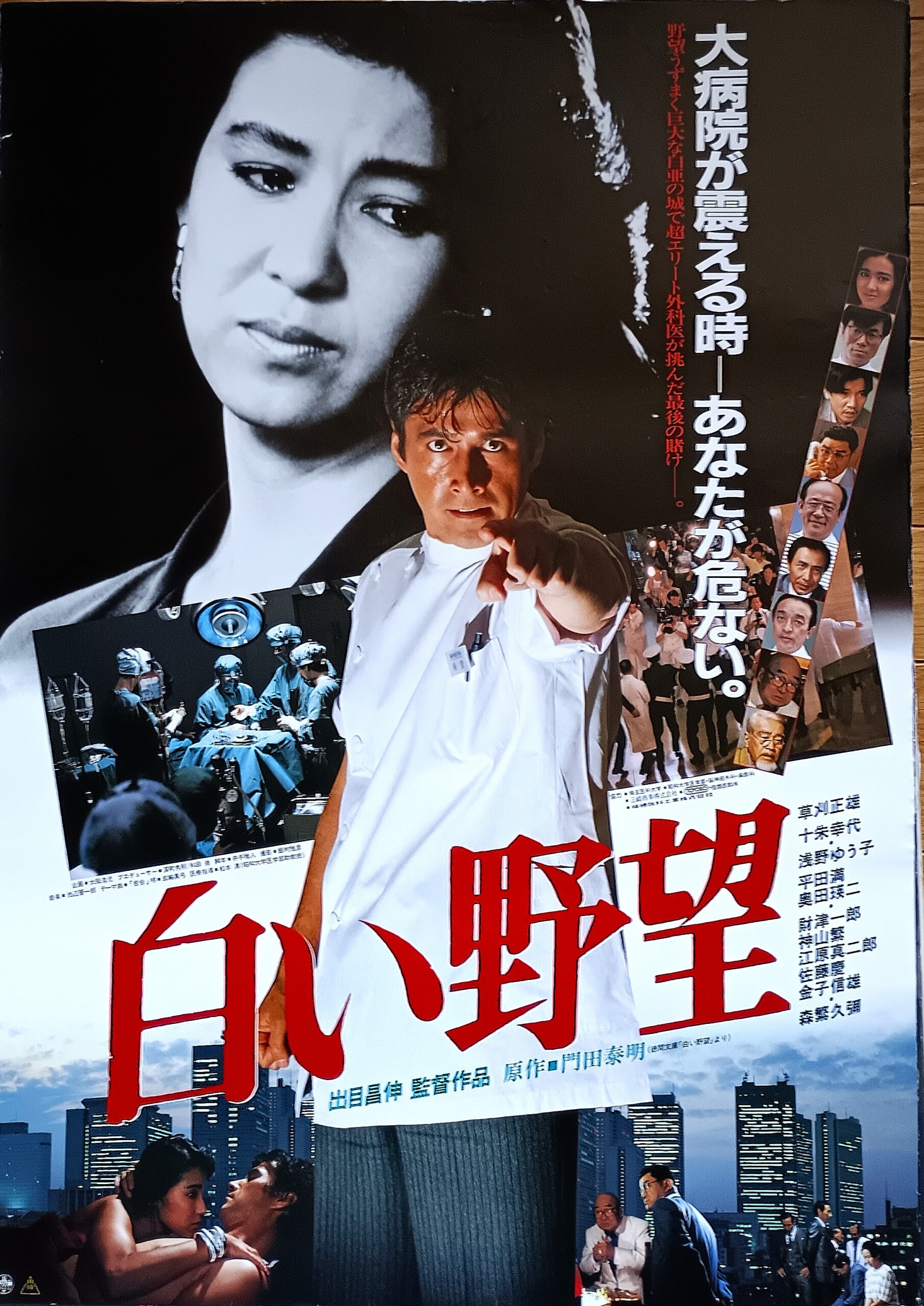 シロイヤボウ/原作:門田泰明。脚本:井手雅人。音楽:池辺晉一郎。主題歌:五輪真弓。監督:出目昌伸。草刈正雄主演の医療サスペンス。東京の国立病院を舞台に、エリート脳外科医の野望と挫折を描く物語。西ドイツ留学を終えて帰国した東堂啓輔は、日本医学界を代表する脳神経外科の権威となっていた。彼を副部長として迎え入れる国立病院の脳神経外科部長辻岡(佐藤慶)は、東堂の存在を苦々しく思う。主任ナースの千原和子(十朱幸代)は東堂の帰りを心待ちにしていた。天才的な執刀技術を誇る東堂は、他の医局員と一線を画して近寄り難い存在、良きパートナーである和子に対しては、甘える部分を見せていた。脳腫瘍の少女、一色春香が運ばれて来た。独断で開頭、摘出手術を行なう東堂。辻岡は見えない頭蓋骨の内側を開けてみたくてメスを執ったのではないかと批判する。東堂は執刀した患者の責任は最後までとると自信満々に答えた。300億円を投じて開発した抗癌剤、トヨキシンに社運を賭ける東洋製薬は美人プロパー、水谷信子(浅野ゆう子)を介して東堂に接近を図る。東堂はトヨキシンの情報に興味を示した。彼は植物人間同然の宇都宮という老人に、トヨキシンの投与を始めた。直接注入するのは和子の役目だった。そんな時、山形に新設される国立総合病院の脳神経外科部長に東堂が内定。辻岡の策略であることは明白。激しい副作用に悶え苦しみながら、宇都宮が死亡。解剖してみると脳底の腫瘍がきれいに消えていた。そのデータを5千万円で売ろうとする東堂に信子は冷く先客がある事を告げる。それは信頼していた助手の宮城(平田満)だった。東堂は東洋製薬に山形行きの内定を却下させるために、トヨキシンの副作用が軽いというデータを捏造、学会で発表することを承諾。春香が再発して運ばれて来た。東堂は和子に、春香にもトヨキシンを投与するよう命じて、学会が開かれる京都へ向かう。大成功を治め、帰京した東堂を東京地検の特捜部が新薬開発の贈収賄の摘発で待ち構えていた。東堂は宮城に詰めよるが、情報を流したのは和子だった。トヨキシンの恐しさを知った彼女は、春香に投与することを思いとどまったという。東堂は春香の再手術に全力をふりしぼった。病院に押しよせた記者団の間を縫って、屋上へ出た彼は、和子の眼の前で飛び降りるラスト。1986年5月24日公開、豊橋東映。【サイズ:B2ポスター2種類】【年代:1986年】