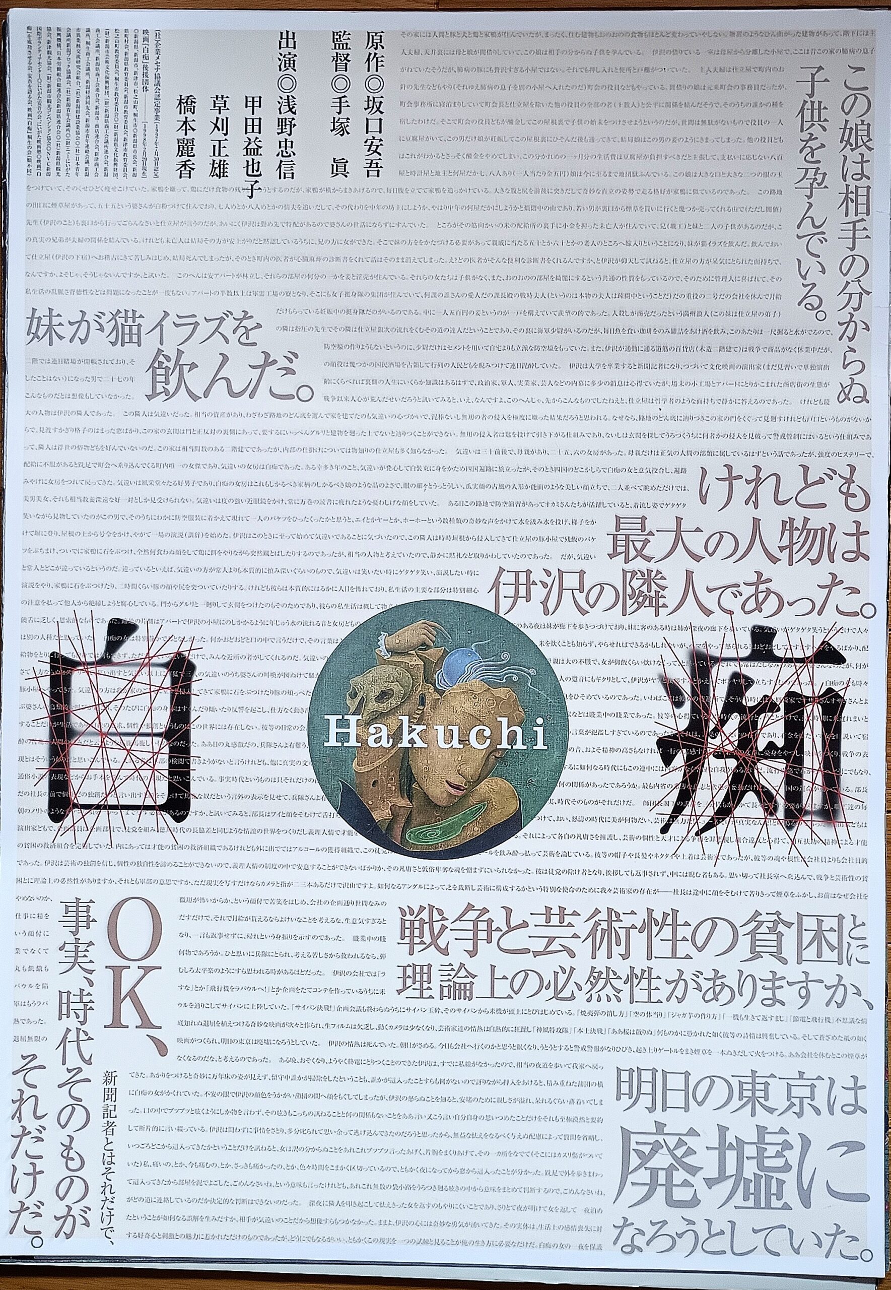 ハクチ/原作:坂口安吾。脚本・監督:手塚真。音楽:橋本一子。特撮:尾上克郎。浅野忠信主演。未来とも過去とも見える架空の“戦時中の日本”を舞台に、封建的なメディアの世界と白痴の女サヨの間で 翻弄されゆく青年伊沢の孤独な姿が、イマジネーション溢れる映像美で描かれてゆく。ヴィジュアリストを 名乗る手塚眞の本領を発揮した、代表作にして本質的なデビュー作である。モデルの甲田益也子がタイトル・ロールのサヨを好演。草刈正雄がこれまでにない 難役に挑戦している他、新人の橋本麗香が大役に挑んでいる。他に藤村俊二、江波杏子、岡田眞澄、原田芳 雄、小野みゆき、松岡俊介、あんじ等、豪華キャストが出演。CGを駆使した映像、新潟に作られた巨大な 街のオープンセットを爆破炎上させるなど、従来の日本映画のスケールもイメージも超えてしまった話題作。 ベネチア国際映画祭、釜山映画祭他、国際的な映画祭に多数招待され、フランスでは劇場公開された。映画 作家として手塚眞の名前を国際的にした作品。1999年ベネチア映画祭デジタル・アワード受賞。カメリマージュ映画祭祭シルバー・フロッグ賞。レイ ク・アローヘッド映画祭ベストフィルム賞。1999年10月30日公開、AMCホリデイスクエア18豊橋。【サイズ:B2ポスター】【年代:1999年】