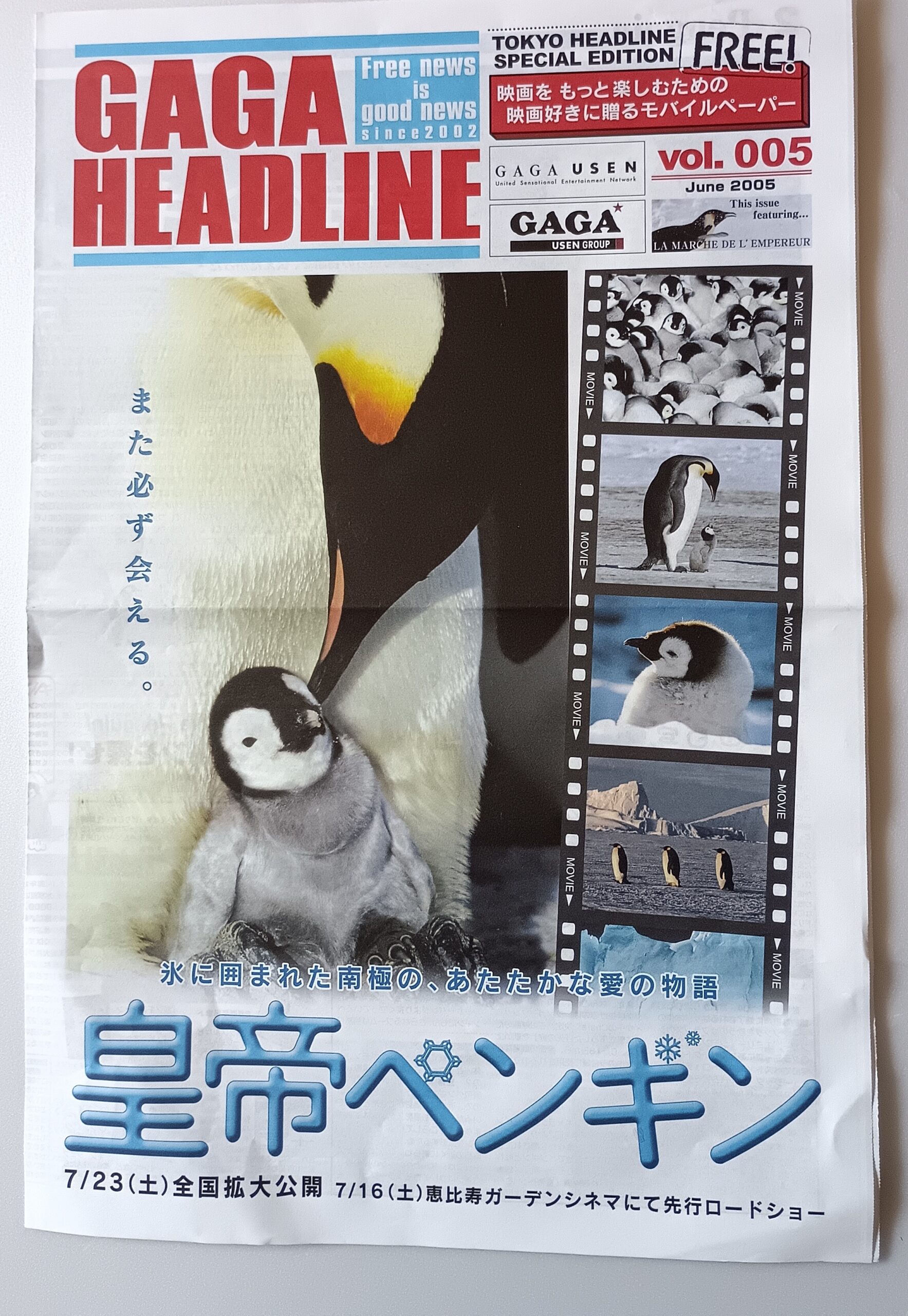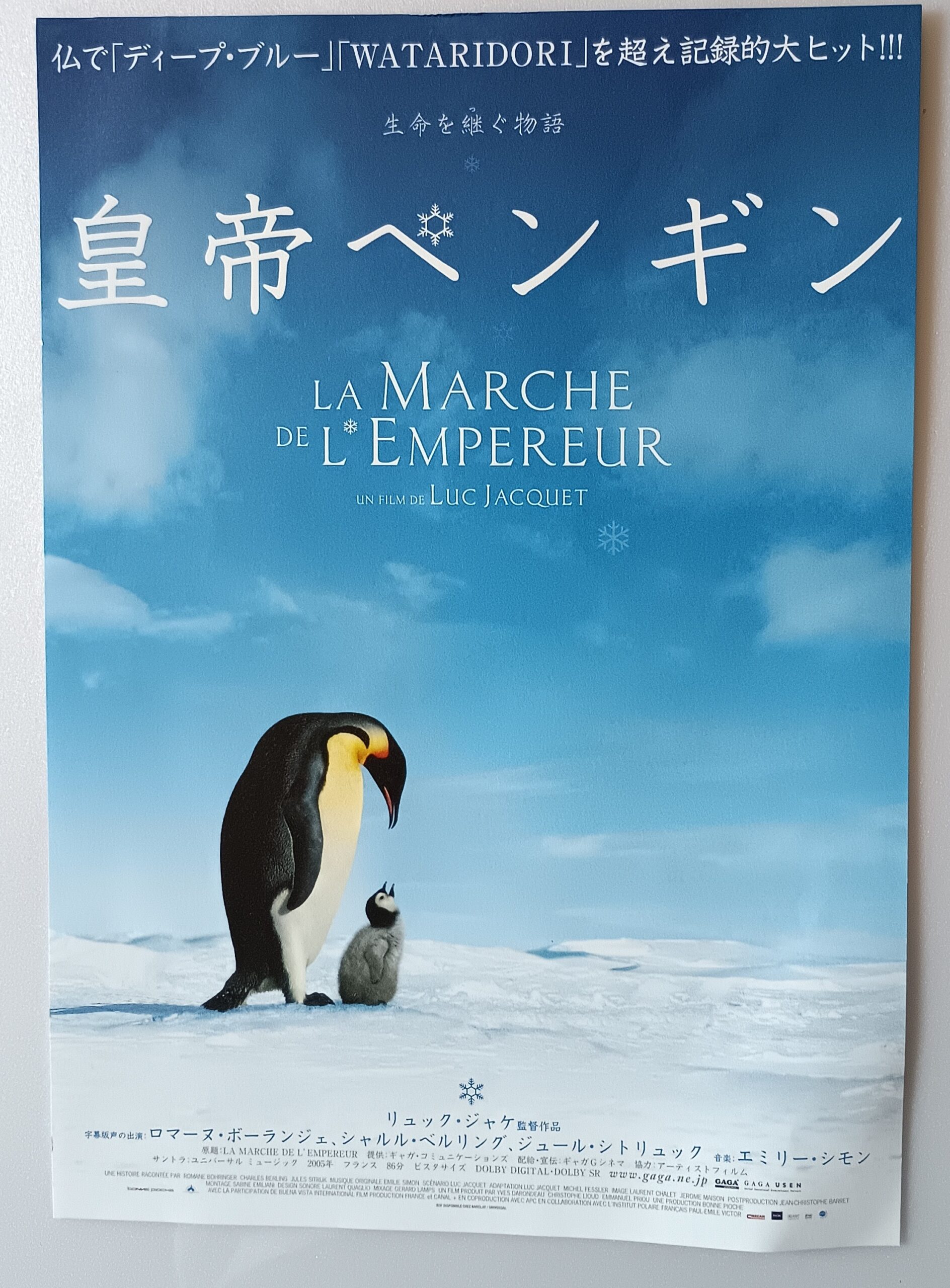 コウテイペンギン/音楽:エミリー・シモン。主題歌:CHARA「光の庭」。監督:リュック・ジャケ。極の過酷な自然の中で生きる皇帝ペンギンたちの求愛から子育てまでを追い、フランスで大ヒットを記録したドキュメンタリー。動物行動学の研究者であるリュック・ジャケ監督が8880時間にわたって撮影した映像をもとに、ペンギンの心の声をナレーションで挿入するなどの演出を施し、ペンギンたちの生態を感動的に描き出す。アメリカ公開版ではモーガン・フリーマンがナレーションを務め、2006年・第78回アカデミー長編ドキュメンタリー賞を受賞。2017年には続編「皇帝ペンギン ただいま」が製作された。南極に冬が到来する3月、多くの生物が暖かい北へ移動する中、皇帝ペンギンたちは南へと向かって旅を始める。彼らは外敵が近づきにくい氷山に囲まれた土地で、パートナーを見つけるための求愛行動をする。5月末、産卵を終えた母親たちは卵を父親に託し、餌を求めて遠く離れた海へと旅立つ。興収10億円を稼いでいる。日本語版吹き替えんいは大沢たかお・石田ひかり・神木隆之介が担当。86分。2005年7月16日公開、ユナイテッドシネマ豊橋18。【サイズ:B5チラシ&プレスシート】【年代:2005年】