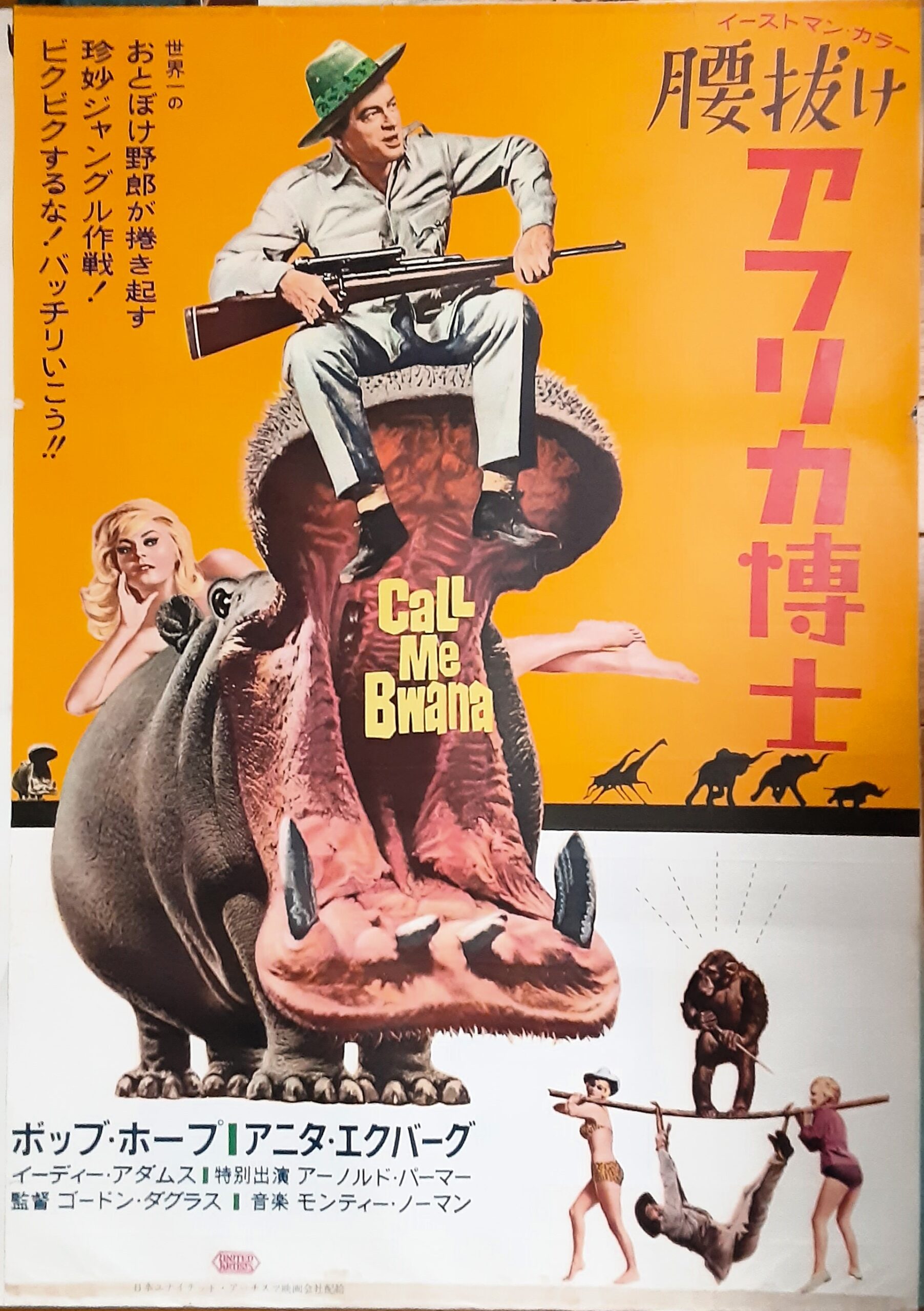 コシヌケアフリカハカセ/音楽:モンティ・ノーマン、ミューア・マシ―ソン。主題歌:ボブ・ホープ。監督:ゴードン・ダグラス。「珍道中」シリーズなど戦前~戦後を通じてのベテランコメディアンであるボブ・ホープ主演のコメディ。アメリカのカプセルが回収の途上軌道を外れ、アフリカ大陸に墜落。ホワイトハウスはこの探索に作家兼探検家のマット(ボブ・ホープ)を派遣することを決議。察知した某国はそのカプセルに満載された月の資料を盗むため、秘密情報部員ルーバ(アニタ・エクバーグ)をアフリカに送った。女に弱いマット、彼女の父親と称するマンゴー博士(ライオネル・ジェフリーズ)まで狩猟旅行に同行させることに。道なき道を切り分けて進んでいるうちにマットの情報部員フレッド嬢(イーディ・アダムス)は、同行の2人の挙動不審な点を嗅ぎ出してきた。得体の知れない男たちの尾行も感じているが、待望のイキール集落に着いて終わったかに思えた。人食い種族と恐れられるイキール族に捕まった。ところが意外にも、酋長は流暢な英語さえ話す“話の分かる男”、ここでルーバはマットの男らしさにすっかり惚れてしまった。肝心のカプセルは、神が我らに恵み給いし魔よけなりと、人食い人種たちが敬っている。カプセルを前に近寄ることもできない。ある日の饗宴の席から姿を消したマンゴー博士は、部下の運んだトラックにカプセルを積んでいた。ルーバの手を借りてマットは勇敢にもトラックに飛びかかったが、2人はカプセルの中に入れられた。激昂したイキール族から逃げる途中、マットがカプセルに触れると、カプセルはトラックを抱いて大空へ2人を乗せてアメリカ上空へと向かう。当時流行のスパイ映画要素に動物は愛嬌程度に登場するボブ・ホープワンマン映画。プロゴルファー アーノルド・パーマーが本人役で出演。1964年3月8日~21日豊橋名画座、併映「大脱走」ロングラン。【サイズ:B2ポスター】【年代:1964年】