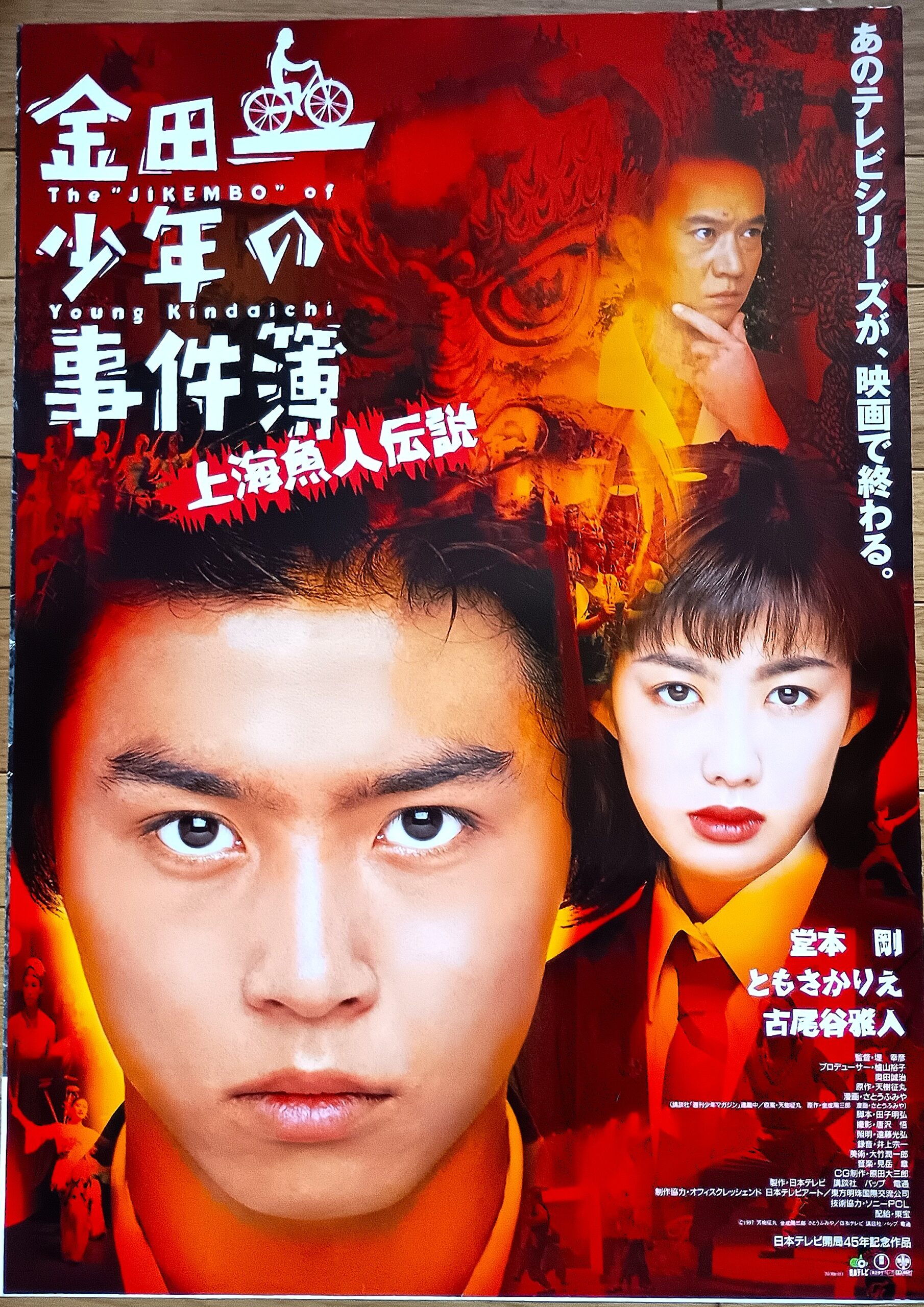 キンダイチショウネンノジケンボ シャンハイギョジンデンセツ/脚本:田子明弘。音楽:見岳章。監督:堤幸彦。週刊少年マガジンに連載されていた漫画を基にした日本テレビ系列の連続ドラマの劇場版。 名探偵・金田一耕助の孫でありIQ180の頭脳を持つ高校生・金田一一(はじめ) が、上海の雑技団で起きた連続殺人事件の謎に挑むサスペンス。堂本剛・ともさかりえの主演コンビで大ヒットしたテレビ・シリーズ完結篇として製作。大々的な香港ロケを敢行。上海に住む少女から手紙を受け取った一と美雪が、中国のサーカスで起こる連続殺人事件に挑む。美雪の文通相手・レイリーからの依頼により上海へと向かった一と美雪。依頼は雑技団の団長であるレイリーの父の殺人事件の容疑者となっている兄の容疑を晴らすことだった。一方、雑技団には悲劇のスターが残した呪いが伝えられていた。一は第2、第3の事件のトリックを明かし、犯人はレイリーだと指摘した。実はレイリーは、7年前に藤堂とマルチナが日本で犯した強盗殺人の被害者の娘で、強奪品に紛れて上海に渡り、ターレンの養女となった日本人だった。彼女は自責の念から自殺したターレンの死体を発見したことから、スーランの五言律詩を利用して藤堂たちへの復讐を開始し、復讐を終えるまでシャオロンを公安から守るために一を呼んだのだった。事件解決の数日後、転校することが決まった美雪はようやく一への想いを告白する。一も今回は素直に応え、ふたりはついにハッピーエンドを迎える。1997年12月13日公開。【サイズ:B2ポスター】【年代:1997年】