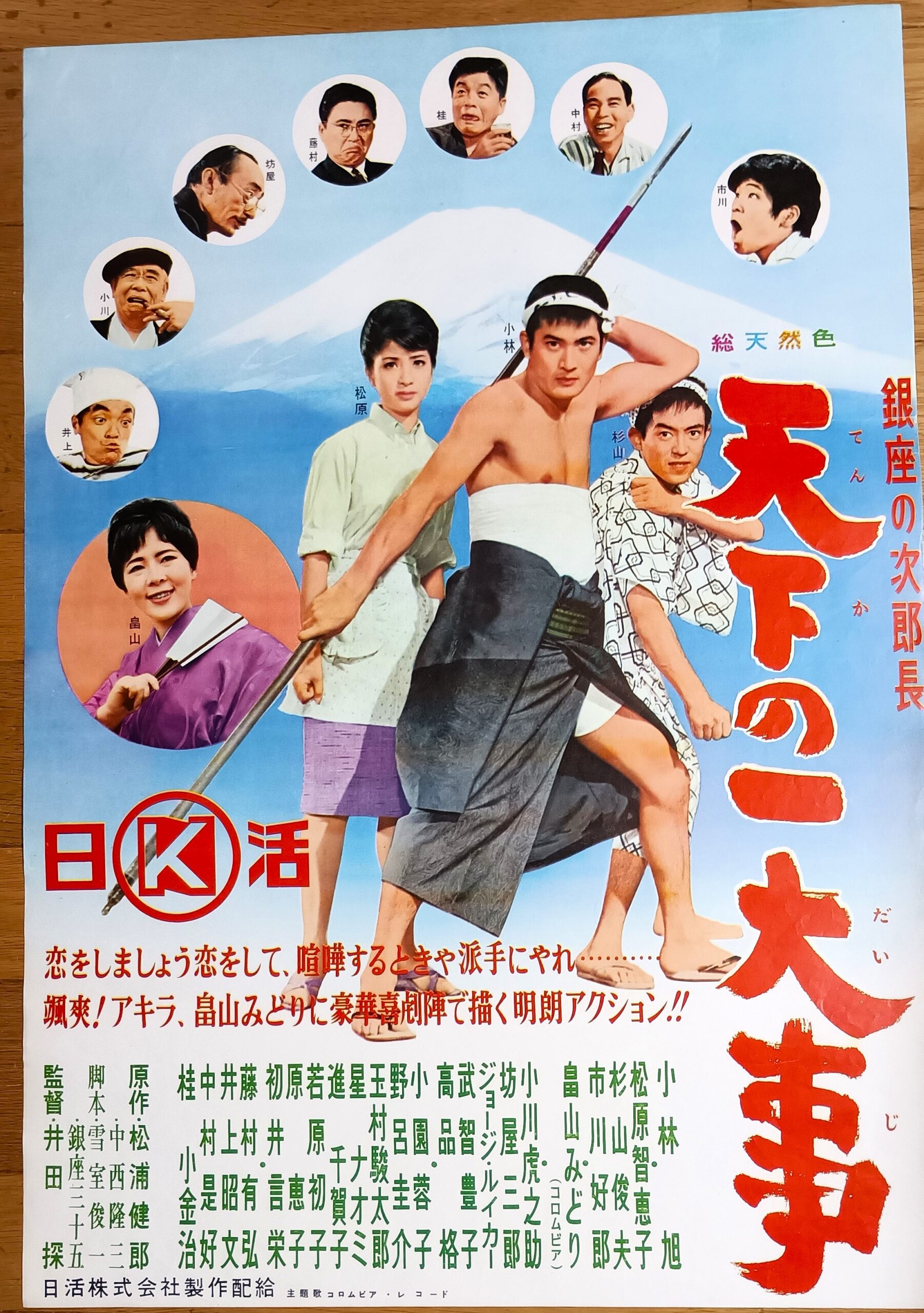 ギンザノジロチョウ テンカノイチダイジ/原作:松浦健郎。脚本:中西隆三、雪至俊一、銀座三十五。監督:井田深。音楽:山本丈晴。主題歌:小林旭「とかくこの世は住みにくい」「君恋小唄」。畠山みどり「出世小唄」「丁度時間となりました」。小林旭の明朗歌謡アクションシリーズ第5作で最終作は畠山みどりがゲスト。ヒロインは松原智恵子に交代。冒頭は日活国際会館の屋上から銀座商店街祭りとして旭の「東京音頭」から始まる。富士山麓の土地を巡る詐欺事件に巻き込まれながらも次郎が町を救う。次郎達の町内に“銀座情報社”(藤村有弘)という赤新聞があった。その首領夕立勘九郎は、しきりに銀座移転を書きたてて、富士山麓のインチキ土地を売りつけようと、やっきになる。苦々しく思っていた次郎は、銀座情報に乗り込んで勘九郎一味を痛める。そんな折、長五郎が若い時生ませた子だという男(井上昭文)がたずねてきた。青くなる長五郎(中村是好)を前に次郎はこの太郎と名のる男を自分の兄として家に入れた。面目を失った長五郎は、富士山麓へ向う。富士山麓の土地が安いと太郎に吹き込まれ、女房や息子の土産にと思って。フジヤマ研究所なる怪し気な別荘で、クロヒーモ(ジョージルイカー)なる男から、富士山の裾野の土地を契約しヘソクリをそっくり投資。意気揚々として東京へ帰って来た長五郎は、自分の買った土地がすでに渋七のものであったと知る。クロヒーモは名うてのインチキブローカーだった。だが、実はクロヒーモの企てにのって、長五郎の息子と名乗った太郎の置手紙からクロヒーモの本拠を襲って事件は解決。明るく楽しい日活娯楽作品は石原裕次郎よりも小林旭が牽引した時代だった。1963年10月16日~26日千歳日活、併映「狼の王子」。1964年2月12日~18日松竹シネマ、併映「丹下左膳」。