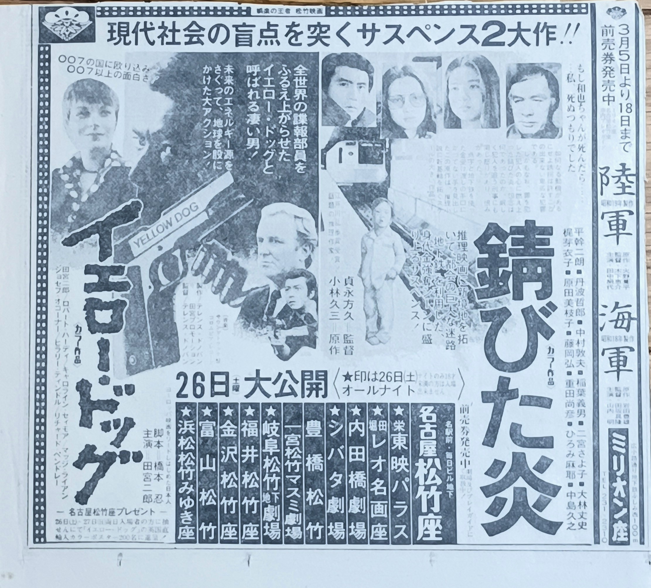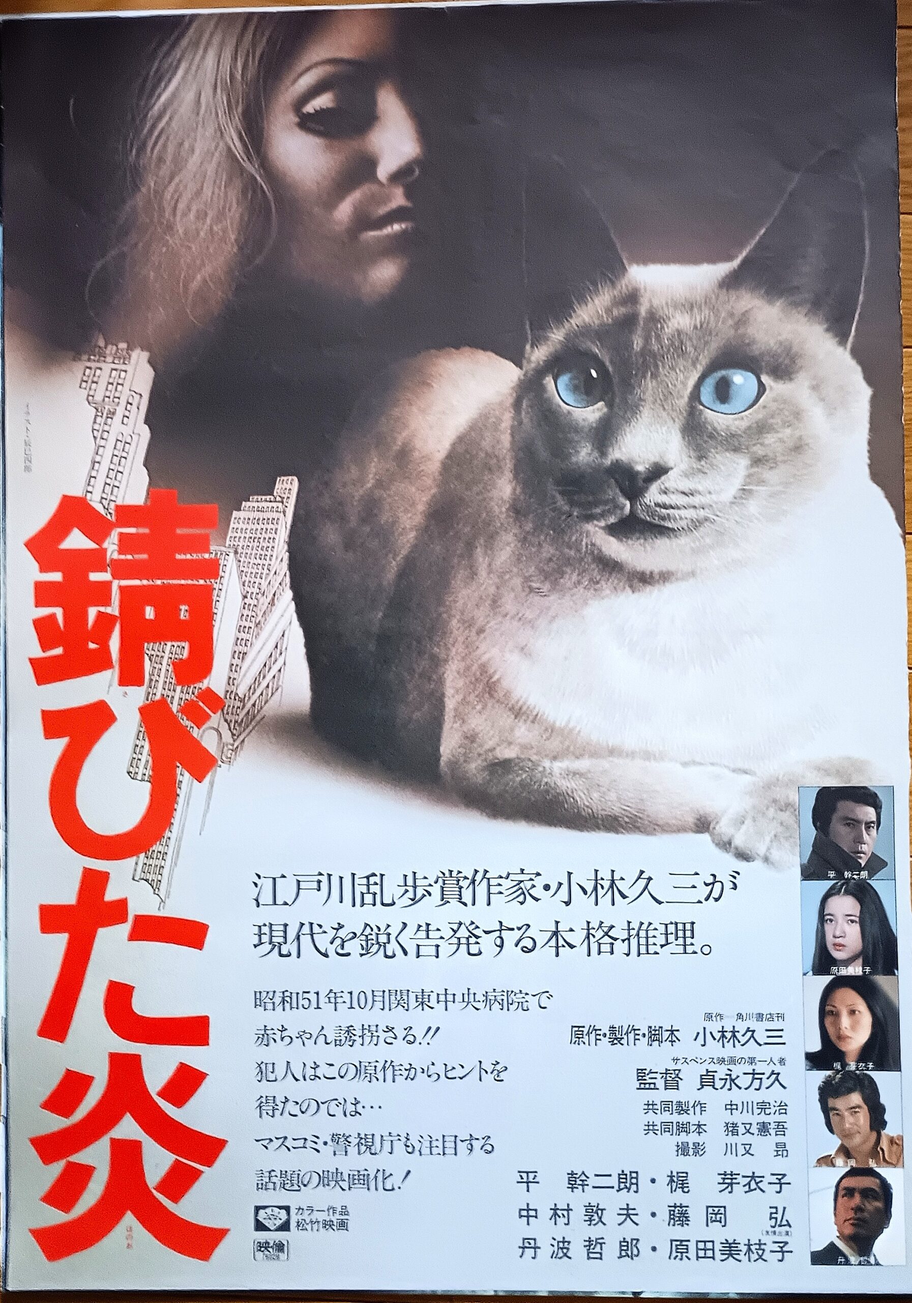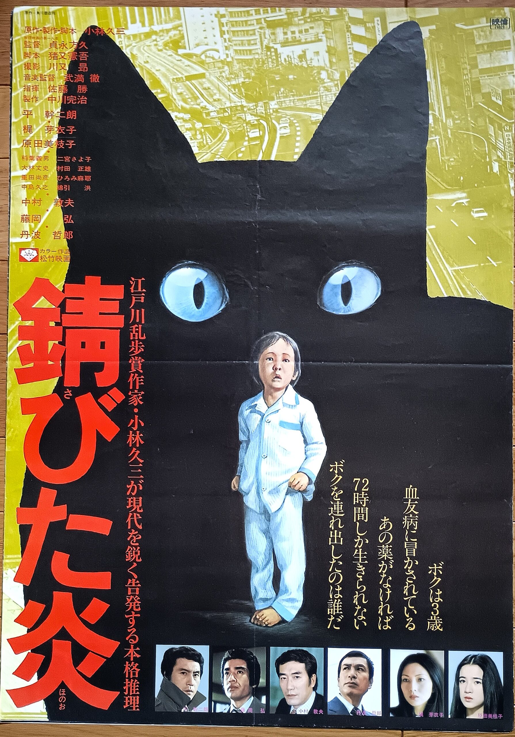 サビタホノオ/原作:小林久三。脚本:小林久三、猪又憲吾。音楽:武満徹。監督:貞永方久。平幹二朗主演、血友病患者である子供の誘拐事件をサスペンスタッチで描く。四月十三日未明、東京世田谷種村総合病院から五歳の血友病患者、丸山和也が何者かによって誘拐された。警視庁遠丸警部(平幹二朗)は、種村家へ急行。種村家では、犯人からの連絡を院長の誠一郎(丹波哲郎)、息子夫婦の光晴、登志子(梶芽衣子)、そして誘拐された子供の両親、丸山正己と雅子(二宮さよ子)が待っていた。犯人からは、責任は病院長にあり、院長は三千六百万円をお手伝いの比佐子(原田三枝子)に指定場所までとどけさせろというもの。病院長の誠一郎は犯人の要求に対して、子供は自分の子ではないと言って拒否。遠丸は調べを進めるうちに、種村家の複雑な家族関係を知る。誘拐された子供は実は、光晴と雅子の間にできた子供であった。遠丸は犯人を内部の人間と推理。約束の時間と場所に比佐子が行く。折からのラッシュ時の地下鉄を利用した犯人。必死に見張る遠丸達だったが、犯人にしてやられてしまう。その夜。一台のタクシーが種村家の前に停車。中には和也がいた。上野毛署に近くのアパートに不審な男がいるとの通報。遠丸らがかけつけて見ると、男は死んでいた。この男は、医大に合格しながら、入学金三千六百万円が払えないために、入学を諦めたのである。誘拐犯の一人に違いない。その夜、遠丸は渋谷署の北原刑事からの連絡を受けとる。そして渋谷西急ホテルで起きた殺人事件の有力容疑者は、シャム猫を鳥カゴに入れてもち歩く女らしいと言うもの。登志子がシャム猫を持ち歩くからだ。登志子には完璧なアリバイがあった。誘拐事件と西急ホテル殺人事件は関連があると遠丸は睨む。種村家を徹底的に捜査した結果、誠一郎を恨む雅子。雅子の背後にはお手伝いの比佐子。通丸は比佐子を洗った結果、比佐子の恋人は急性腸閉塞を起し、病院のたらい回しという目にあい死亡。西急ホテルに残っていた犯人の指紋が比佐子と一致。遠丸は、比佐子の逮捕状を申請する。公開時に田宮二郎のアクション「イエロードッグ」と併映だったが記録的な不入りで1週間公開してからカンフー映画を追加して何とも言えない3本立て公開、それでも2週間で打ち切り。そのあと繋ぎ番組として「影の車」「ゼロの焦点」「眼の壁」の3本立てを組んで次番組までとした。1977年2月26日~3月11日豊橋松竹、併映「イエロードッグ」「片腕カンフー対空飛ぶギロチン」。【サイズ:B2ポスター2種類&新聞広告】【年代:1977年】