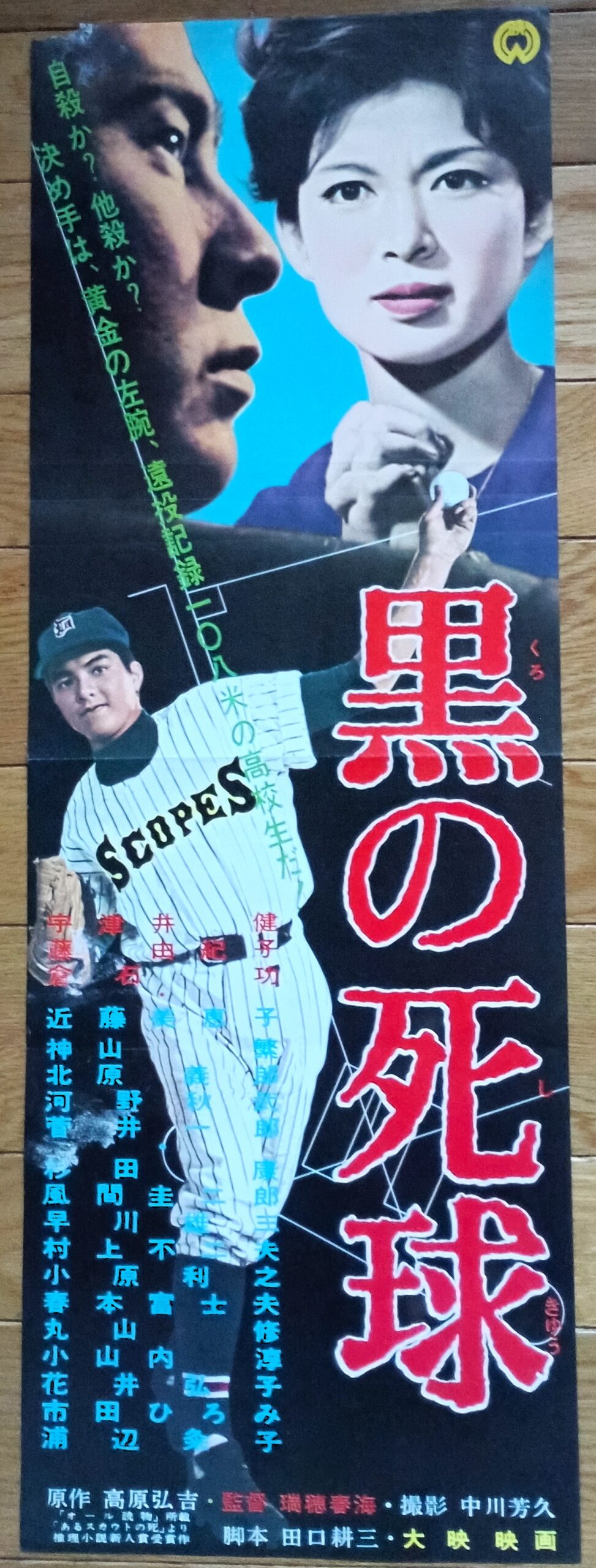 クロノシキュウ/原作:高原弘吉。脚本:田口耕三。音楽:池野成。監督:瑞穂春海。大映のサスペンス「黒」シリーズ第7作。非情なプロ野球スカウトの裏面を描く宇津井健主演の野球界サスペンス。キャッチ「まぼろしの左腕投手を追う背番号のない男たち!非情なスカウトの裏面をえぐる異色推理映画!」。高校球界きっての左腕投手・菊川浩(倉石功)をめぐり、全球団の争奪戦の結果、主人公スカウト柏木(宇津井健)のルビースが獲得。翌日イーグルスのスカウト浜田(河野秋武)が死体で発見される。警察は断崖下で発見された浜田を菊川獲得失敗からの自殺と断定。浜田の娘しず枝(藤由紀子)は、遺品中に女物の高級時計購入の領収書を発見したが、実物は見あたらなかった。そんなしず枝にレントゲン写真が届く。浜田の頼んだもので、骨折した男の左腕だった。偶然バーで柏木は浜田の時計ナルダンをしているユカリ(近藤美恵子)という女をみつけた。翌日、柏木はユカリを訪ねたが、彼女は失踪。柏木は浜田が108米の遠投記緑うんぬんといったのを思い出し、早速県の体育課で調べた。やっとその男が竹村健太郎と判明。健太郎は骨折していた。柏木は、健太郎を診断したのは外科医の犬塚(菅井一郎)だと聞き出す。犬塚はこれを否定。柏木は菊川を彼に紹介した教師羽田野(神山繁)の叔父がこの犬塚であること、さらに健太郎の姉がユカリで本名は伸子だという事実を掴む。浜田は健太郎スカウトを狙ったのだ。伸子は浜田に惹かれていった。伸子を愛している波田野は浜田を憎み。菊川の件で欲の出た羽田野は、後輩健太郎でも一儲けを企む。そして羽田野は、健太郎骨折の芝居を書いて条件の悪い浜田に断念させようとしたが浜田はあきらめなかった。羽田野はいつも静岡に泊る浜田をだまして、自分の母の経営する温泉地旅館へ呼び出し殺害。羽田野は自白して病魔に冒されていた彼は喀血死。柏木はしず枝と婚約する。1963年6月23日~7月1日丸物会館、併映「私を深く埋めて」。【サイズ:B5 大映ポスター集&プレスシート】【年代:1963年】